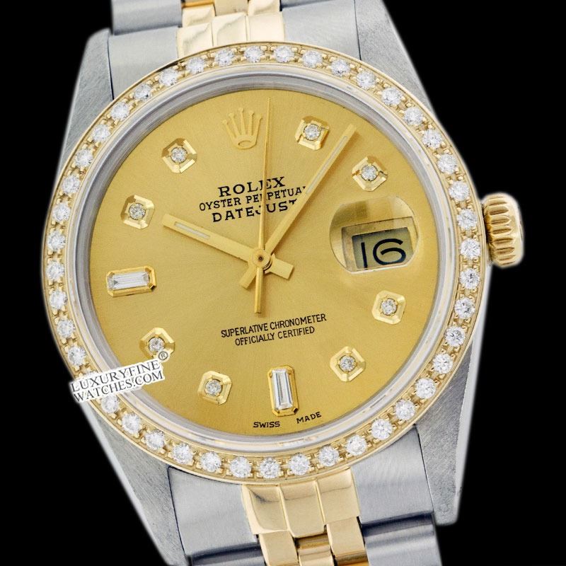 WATCH DETAILS: ITEM: WatchBRAND: RolexTYPE: Two ToneFEATURE: QuickSetMODEL: DateJustMADE: Swiss MadeGENDER: Men'sCONDITION: Pre-OwnedFUNCTION: DateDIAL COLOR: ChampagneHOUR MARKERS: 8 Round & 2 Baguette DiamondBEZEL TYPE: Diamond BezelBEZEL STONE: Diamond 1.14 CTW G-VVS1 BEZEL MATERIAL: 18K GoldBRACELET TYPE: Jubilee BRACELET MATERIAL: 14K Yellow Gold & Stainless SteelCLASP TYPE: Folding ClaspCLASP MATERIAL: Stainless SteelCASE STONE: CASE SIZE: 36mmCRYSTAL: Scratch Resistance Sapphire CrystalMOVEMENT: Automatic (Self Winding)CALIBER: 3035CROWN TYPE: Screw Down CrownWATER RESISTANCE: Waterproof to 10 ATM/100 meters/330 feetMODEL #: 16013SKU #: AMTJQS96We Buy/Sell/Trade Valuable watches, Please call usNote: Presentational generic box included. This watch was professionally inspected and serviced prior to auction. We are not affiliated with Rolex USA, Inc.