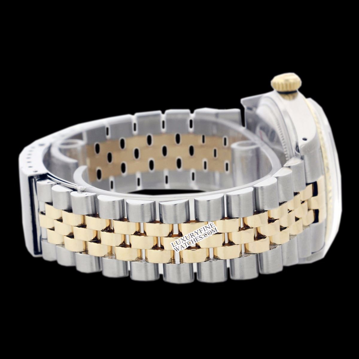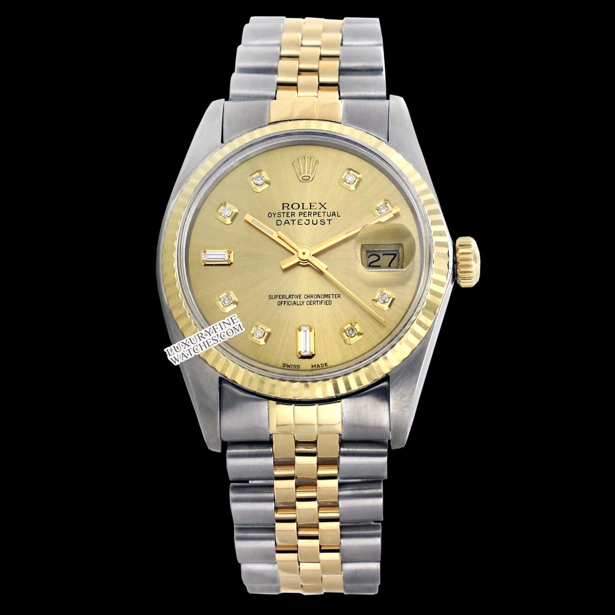 WATCH DETAILS: ITEM: WatchBRAND: RolexTYPE: Two ToneFEATURE: QuickSetMODEL: DateJustMADE: Swiss MadeGENDER: Men'sCONDITION: Pre-OwnedFUNCTION: DateDIAL COLOR: ChampagneHOUR MARKERS: 8 + 2 , 8 Round and 2 Baguette DiamondBEZEL TYPE: Fluted BezelBEZEL STONE: No StoneBEZEL MATERIAL: 18K GoldBRACELET TYPE: Jubilee BRACELET MATERIAL: 14K Yellow Gold & Stainless SteelCLASP TYPE: Folding ClaspCLASP MATERIAL: Stainless SteelCASE STONE: CASE SIZE: 36mmCRYSTAL: Acrylic MOVEMENT: Automatic (Self Winding)CALIBER: 3035CROWN TYPE: Screw Down CrownWATER RESISTANCE: Waterproof to 10 ATM/100 meters/330 feetMODEL #: 16013SKU #: AMTJQP14We Buy/Sell/Trade Valuable watches, Please call usNote: Presentational generic box included. This watch was professionally inspected and serviced prior to auction. We are not affiliated with Rolex USA, Inc.