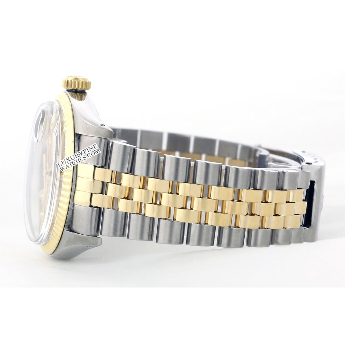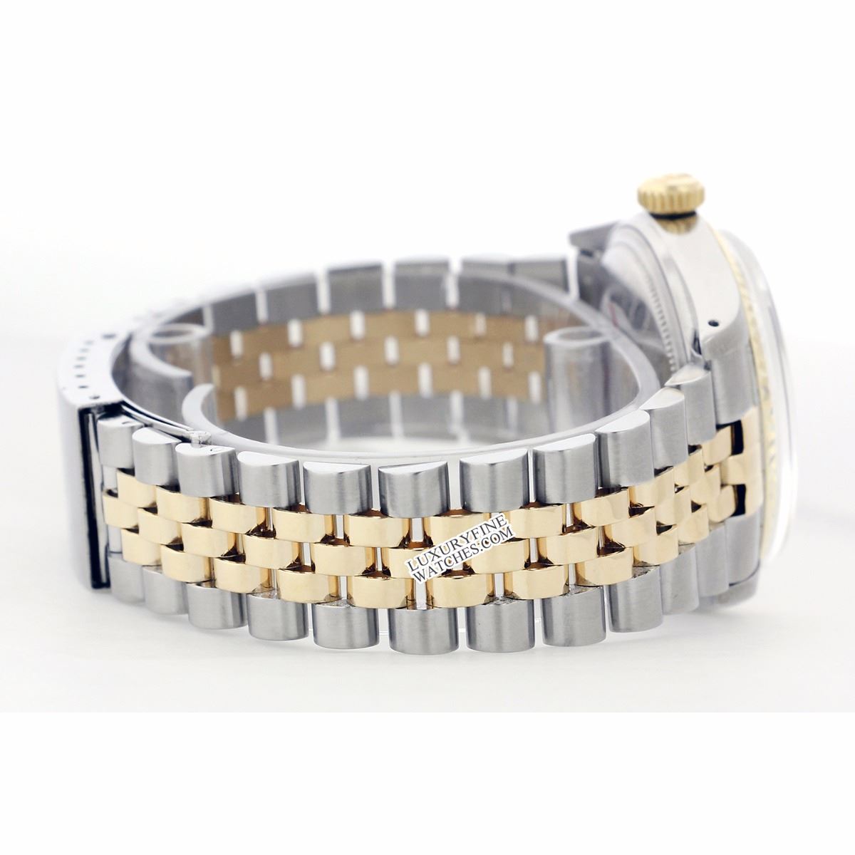 WATCH DETAILS: ITEM: WatchBRAND: RolexTYPE: Two ToneFEATURE: QuickSetMODEL: DateJustMADE: Swiss MadeGENDER: Men'sCONDITION: Pre-OwnedFUNCTION: DateDIAL COLOR: ChampagneHOUR MARKERS: 8 + 2 , 8 Round and 2 Baguette DiamondBEZEL TYPE: Fluted BezelBEZEL STONE: No StoneBEZEL MATERIAL: 18K GoldBRACELET TYPE: Jubilee BRACELET MATERIAL: 14K Yellow Gold & Stainless SteelCLASP TYPE: Folding ClaspCLASP MATERIAL: Stainless SteelCASE STONE: CASE SIZE: 36mmCRYSTAL: Acrylic MOVEMENT: Automatic (Self Winding)CALIBER: 3035CROWN TYPE: Screw Down CrownWATER RESISTANCE: Waterproof to 10 ATM/100 meters/330 feetMODEL #: 16013SKU #: AMTJQP14We Buy/Sell/Trade Valuable watches, Please call usNote: Presentational generic box included. This watch was professionally inspected and serviced prior to auction. We are not affiliated with Rolex USA, Inc.