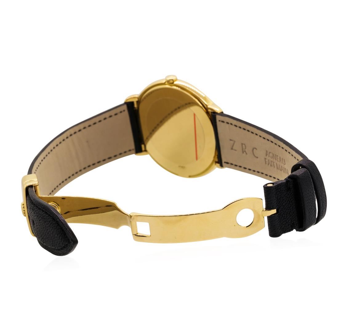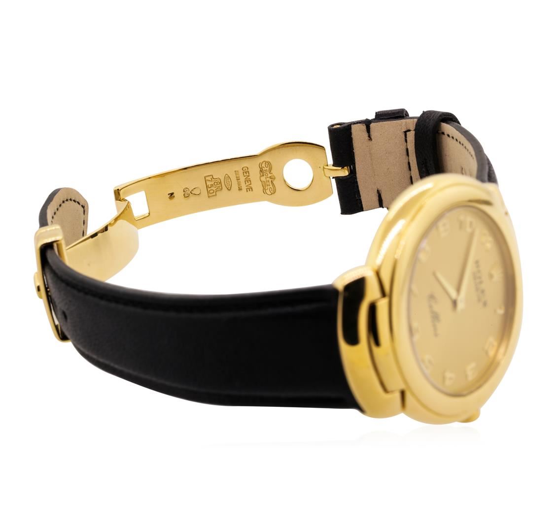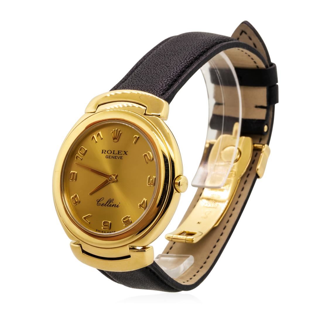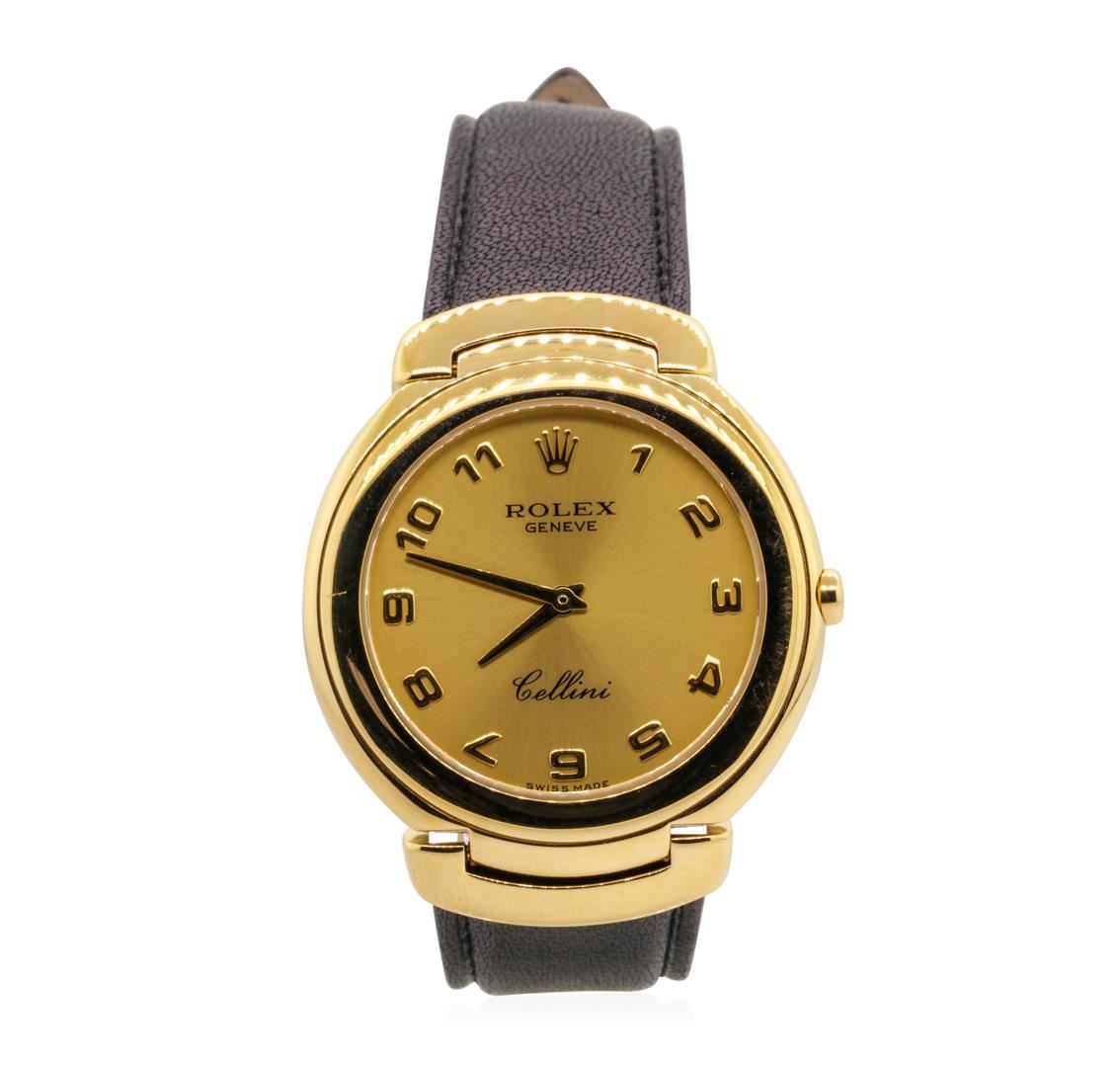One men's Rolex Cellini 18KT yellow gold wristwatch with an attached black leather strap with a single deployment clasp. The watch has been electronically tested and is stamped 18K/750. Crown: polished pull-out with logo. Bezel: polished bright. Crystal: synthetic sapphire. Movement: quartz. Dial: gold with yellow gold arabic numerals, gold baton pointed type hands. Case: 37 millimeters wide. Total weight: 69.1 grams.