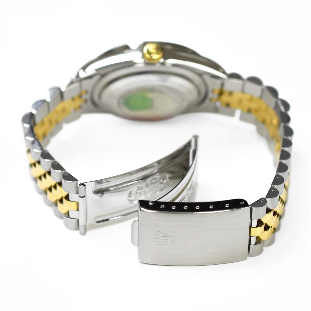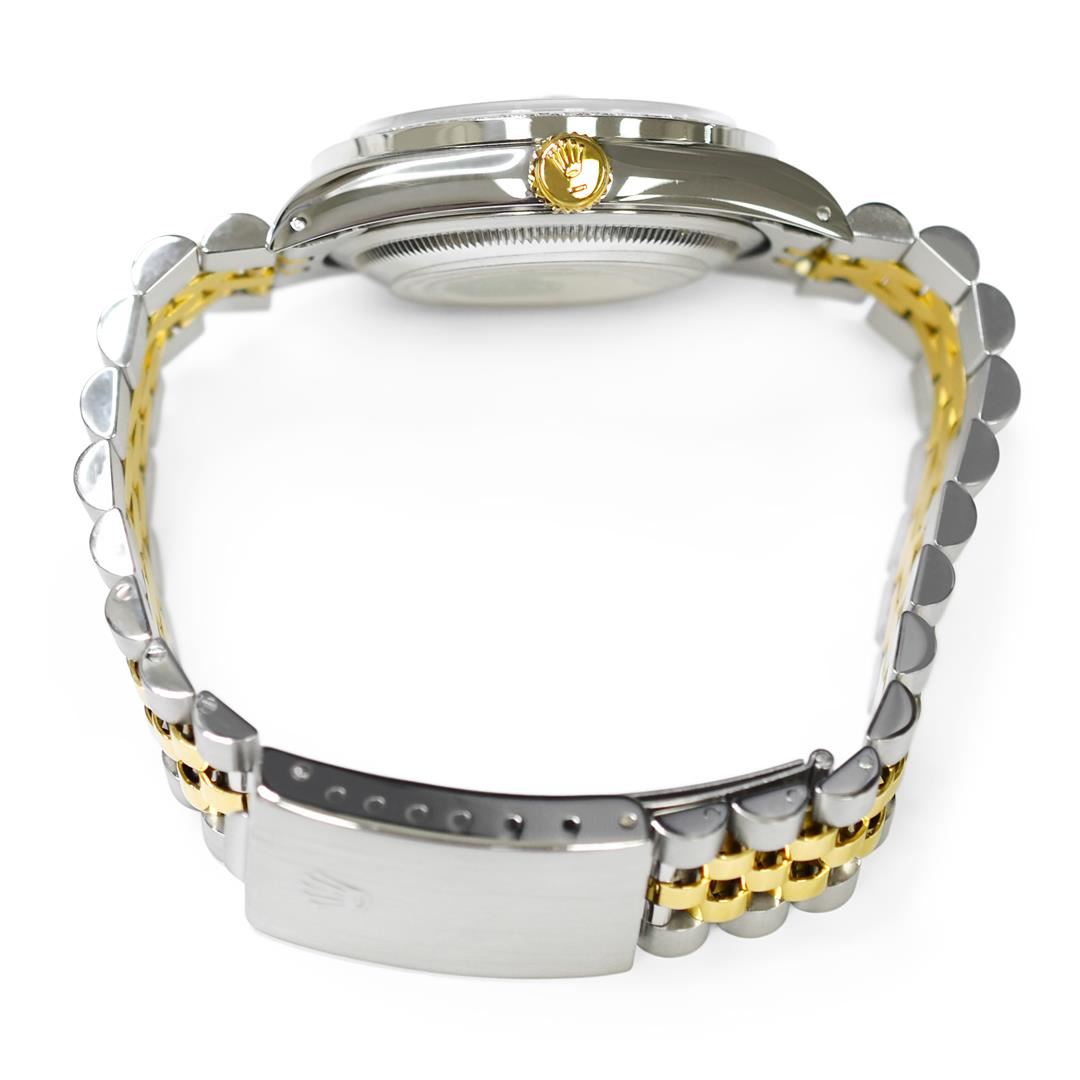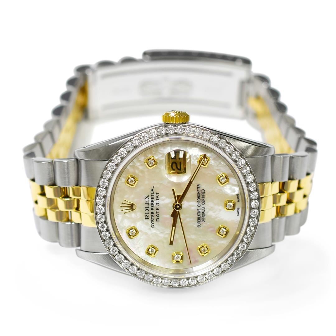 Rolex Datejust Men's 36mm MOP Diamond Dial 18KT Yellow & Steel Polished & Electronically Tested. Model: Datejust 16233. Case: Stainless Steel and 18KT Yellow Gold. Bezel: Custom made diamond bezel with round brilliant diamonds all set in prong setting. Total Weight 1.05ctw Clarity: VS-SI Color:G-H. Crystal: Sapphire Bracelet: Stainless Steel and 18KT Yellow Gold, Adjustable Standard Clasp with Rolex Logo, Loose. Dial: Mother of Pearl with 0.10ctw Diamonds. Date Window: 3 O'clock Position date display. Movement: Automatic Winding Movement. Water Resistant: Yes. Case Size: 36mm. Condition: Pre Owned, Watch is free of all Scratches and Dents, Extra Fine G-6.