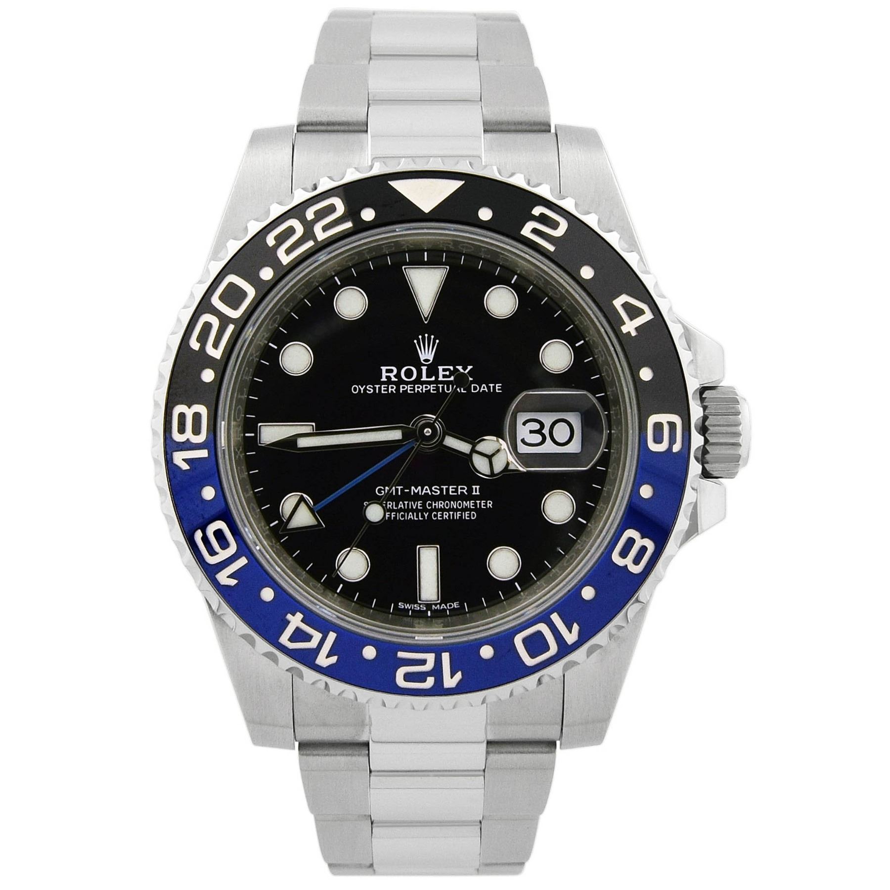Model: GMT-Master II "Batman'. Reference #: 116710BLNR. Case: Stainless Steel. Case Size: 40mm. Bracelet: Oyster Bracelet. Dial: Black Dial w/ Dot Hour Markers. Bezel: Bidirectional Rotating 24-hour Graduated Ceramic GMT Bezel . Bezel Color: Blue and Black "Batman" Bezel. Lume: Luminous Hands & Hour markers. Date Window: 3 O'clock Position w/ Cyclops lens. Movement: Automatic Winding Movement; Rolex Calibre 3186. Power Reserve: 48 Hours. Water Resistant: Yes 100 Meters/330 Feet. Crystal: Scratch Resistant Sapphire Crystal. Condition: Pre-Owned; Great Condition. Rolex Box & PAPERS Included. CIRCA: 2017. All Pre-Owned watches are guaranteed to be 100% genuine. Your watch will come with a 2-year limited warranty, original box, and appraisal.
