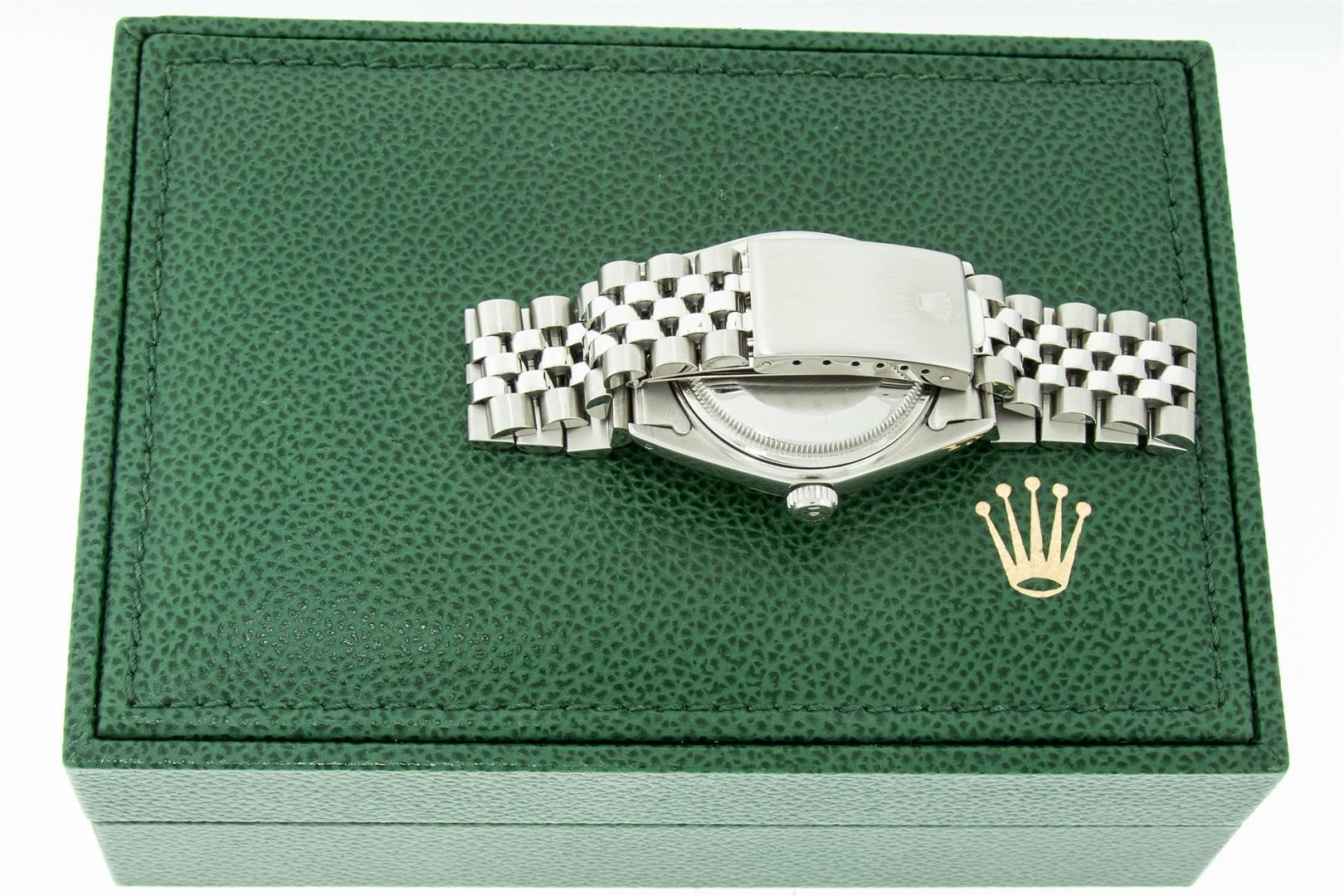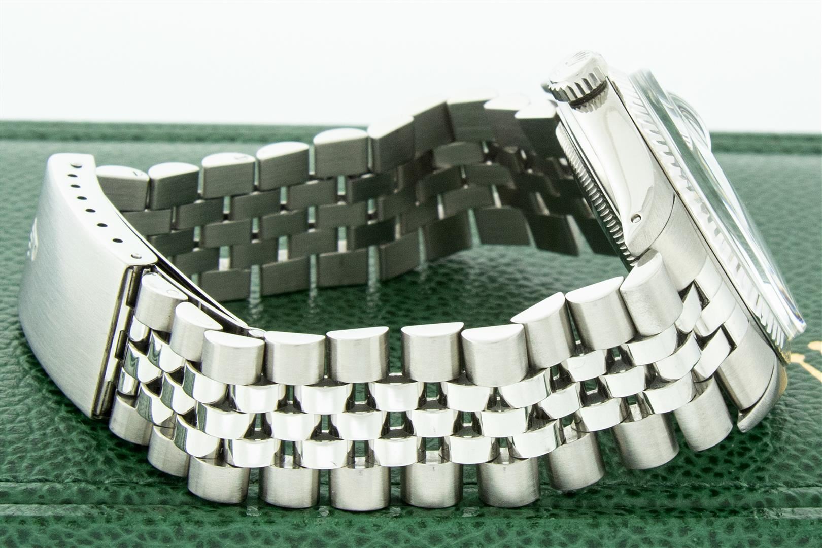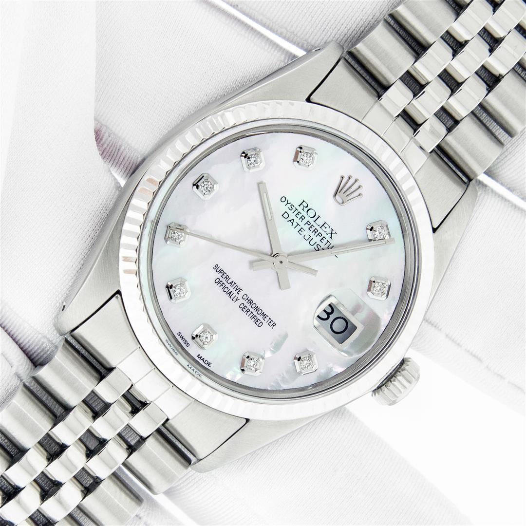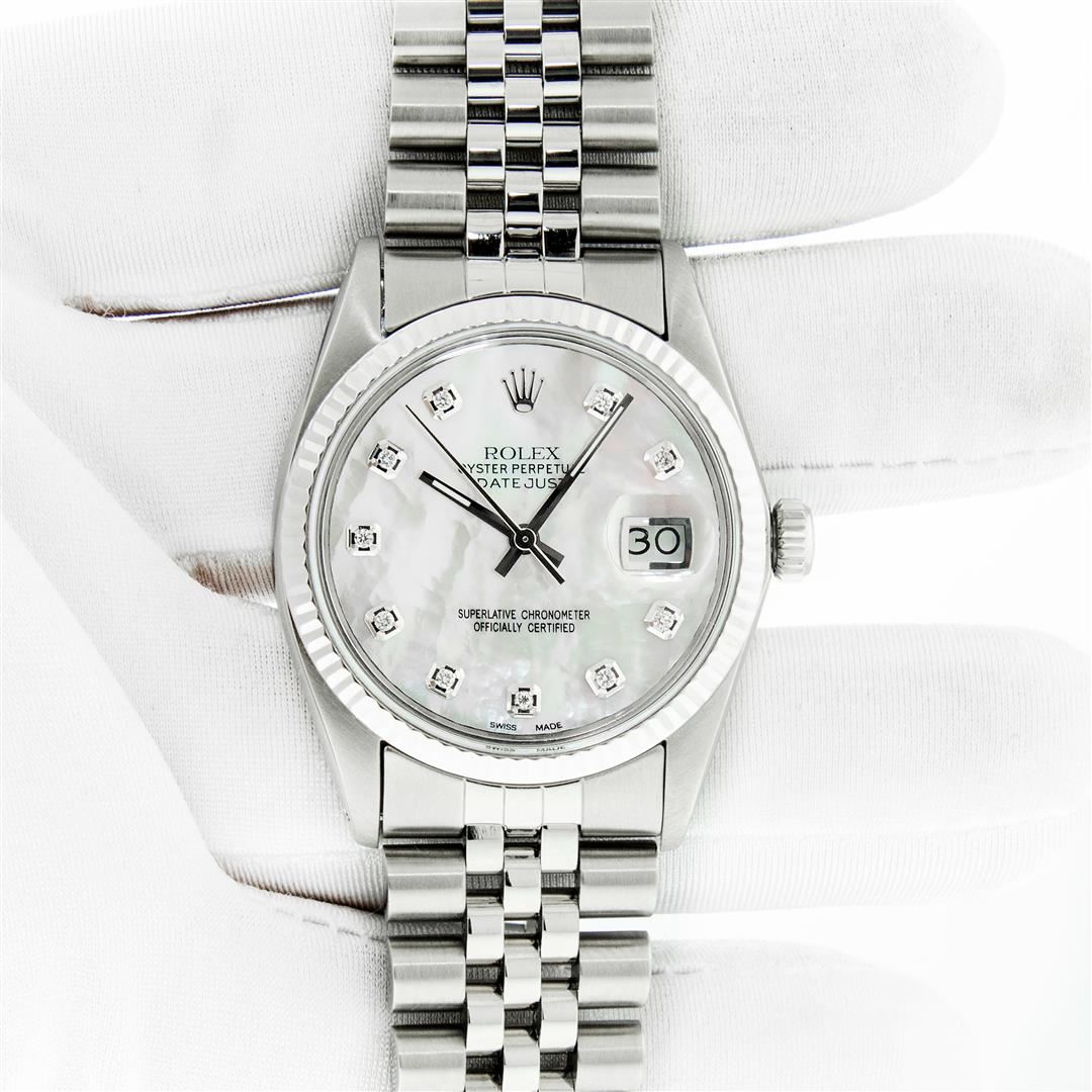 One Men's Stainless Steel Rolex Datejust Polished Bright with Satin Finish, This Watch Has Been Serviced & Electronically Tested, Rolex Stainless Steel Case: 36mm, Rolex Stainless Steel Crown, Rolex Bezel: 14K White Gold Fluted Bezel. Custom Crystal: New Acrylic With Magnified Date Window. Custom Hands: New Luminescent Hands. Rolex Movement: Automatic Winding Movement. Custom Dial: Mother Of Pearl Diamond Dial With Custom Added Diamond Hour Markers, Diamond Count: 10 Diamonds in Dial G To H In Color, SI-VS Clarity. Date Window: 3 O'clock Position Date Display, Quickset, Model: Datejust, Condition: G-6 Extra Fine. Rolex Bracelet: Stainless Steel Jubilee Band. Bright Polish & Satin Finish. 7.0 Inch Length, Adjustable. Standard Clasp, With Rolex Logo. This Pre Owned Watch Has Been Serviced Time Tested And Is In Excellent Condition It Is Free Of All Scratches And Dents.