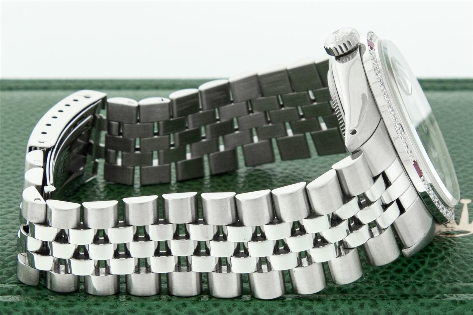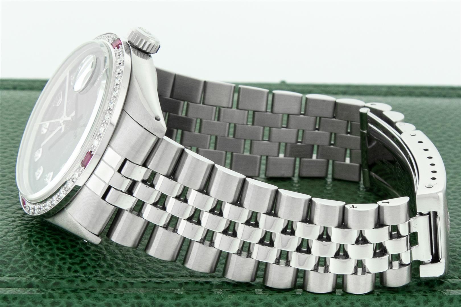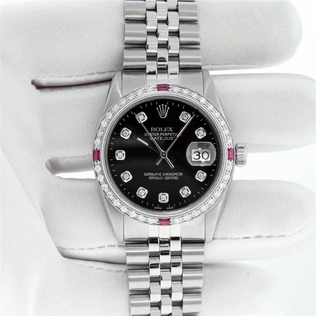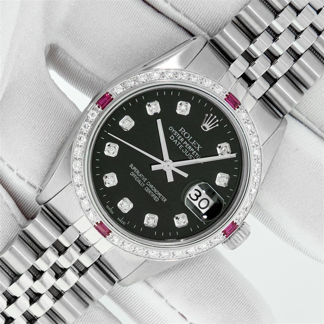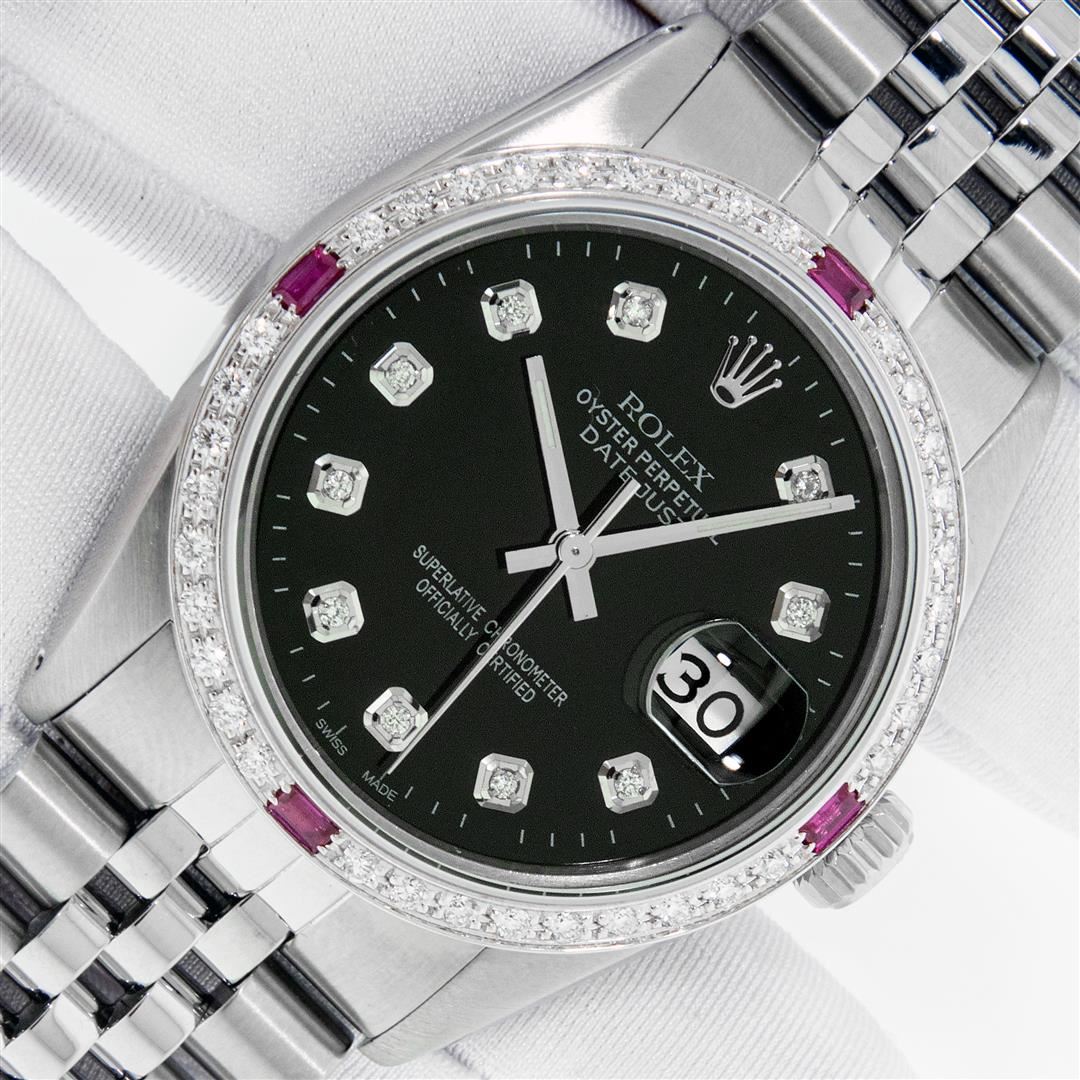 One Men's Stainless Steel Rolex Datejust Polished, Serviced & Electronically Tested, Rolex Stainless Steel Case: 36mm, Rolex Stainless Steel Crown, Custom Bezel: New 18K White Gold Ruby Beadset Diamond Bezel, Diamond + Gem Count: 36 Diamonds + 4 Rubies, Total Weight 1.00 Carat, Clarity: SI-VS, Color: G to H. Custom Crystal: New Sapphire With Magnified Date Window. Custom Hands: New Luminescent Hands. Rolex Movement: Automatic Winding Movement. Custom Dial: Refinished To Black With Added Diamond Hour Markers, 10 Diamonds in Dial, G To H In Color, Clarity: SI-VS. Date Window: 3 O'clock Position Date Display, Quickset, Model: Datejust. Condition: G-6 Extra Fine. Rolex Bracelet: Stainless Steel Jubilee Band. Bright Polish & Satin Finish. 7.0 Inch Length, Adjustable. Standard Clasp, With Rolex Logo. This Pre Owned Watch Has Been Serviced Time Tested And Is In Excellent Condition It Is Free Of All Scratches And Dents. This Watch Comes With A Rolex Box.