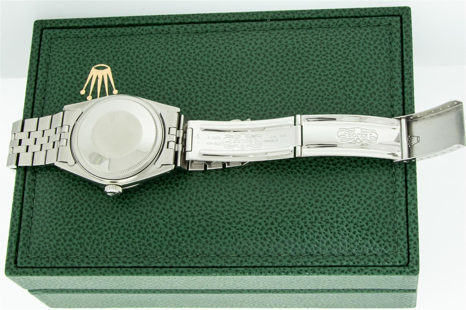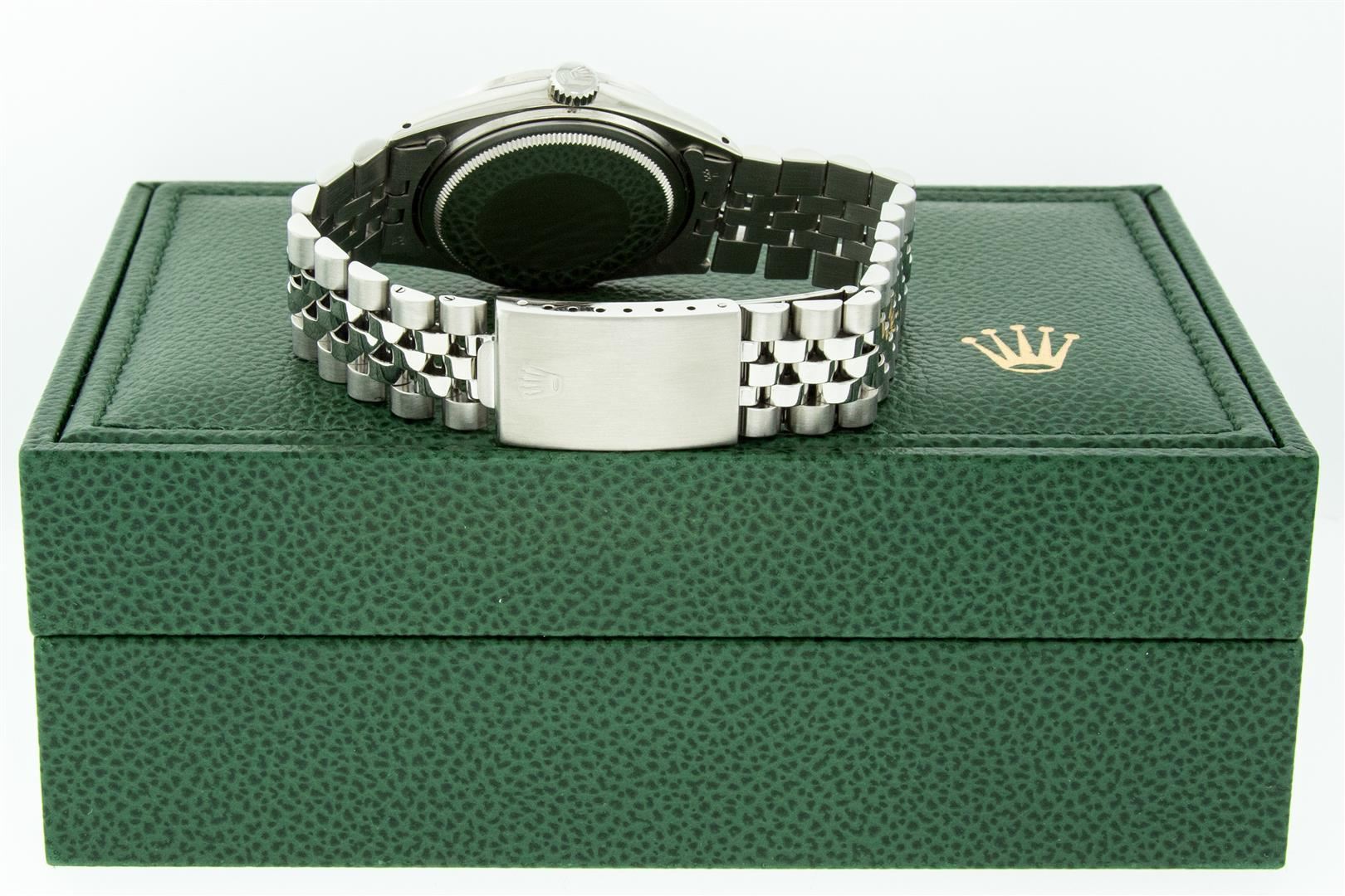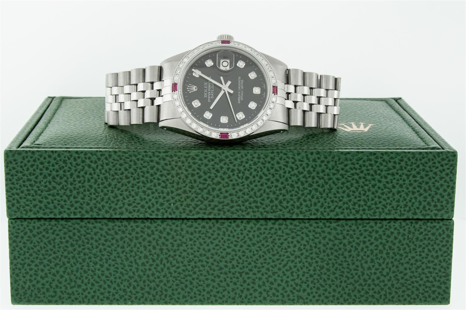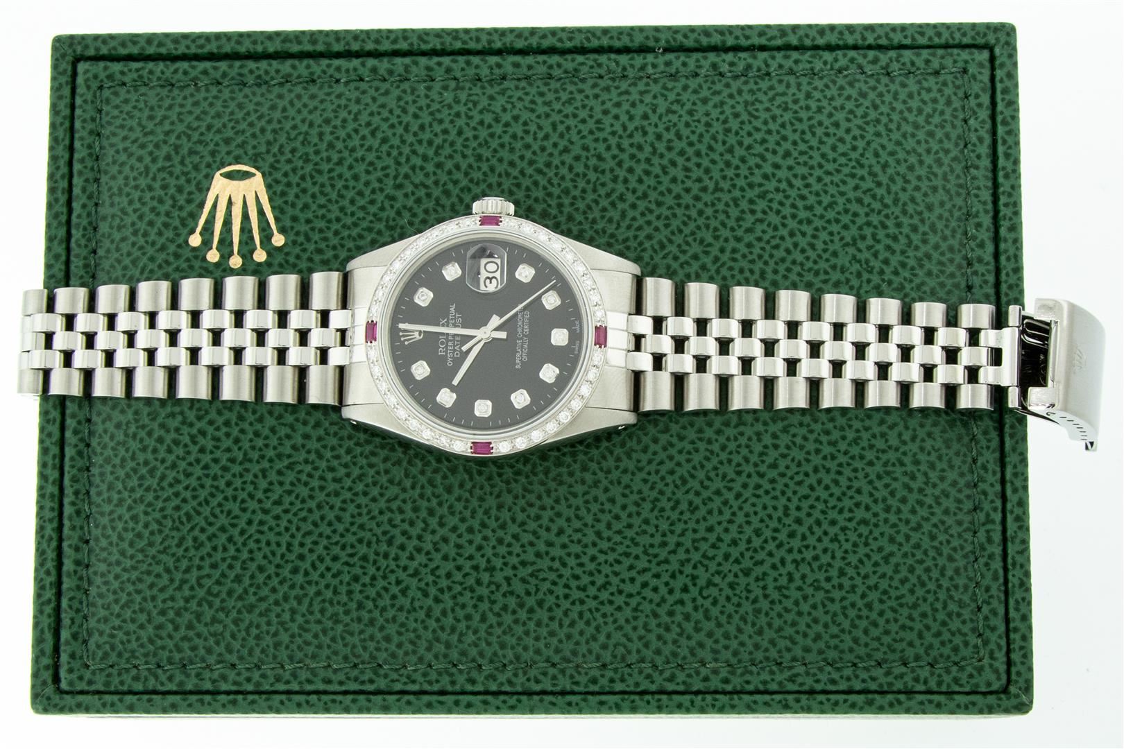 One Men's Stainless Steel Rolex Datejust Polished, Serviced & Electronically Tested, Rolex Stainless Steel Case: 36mm, Rolex Stainless Steel Crown, Custom Bezel: New 18K White Gold Ruby Beadset Diamond Bezel, Diamond + Gem Count: 36 Diamonds + 4 Rubies, Total Weight 1.00 Carat, Clarity: SI-VS, Color: G to H. Custom Crystal: New Sapphire With Magnified Date Window. Custom Hands: New Luminescent Hands. Rolex Movement: Automatic Winding Movement. Custom Dial: Refinished To Black With Added Diamond Hour Markers, 10 Diamonds in Dial, G To H In Color, Clarity: SI-VS. Date Window: 3 O'clock Position Date Display, Quickset, Model: Datejust. Condition: G-6 Extra Fine. Rolex Bracelet: Stainless Steel Jubilee Band. Bright Polish & Satin Finish. 7.0 Inch Length, Adjustable. Standard Clasp, With Rolex Logo. This Pre Owned Watch Has Been Serviced Time Tested And Is In Excellent Condition It Is Free Of All Scratches And Dents. This Watch Comes With A Rolex Box.