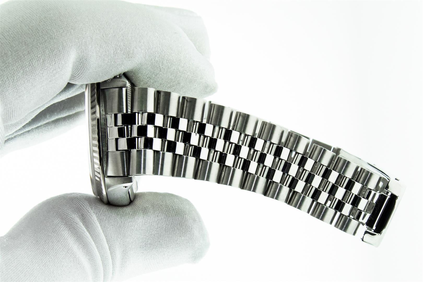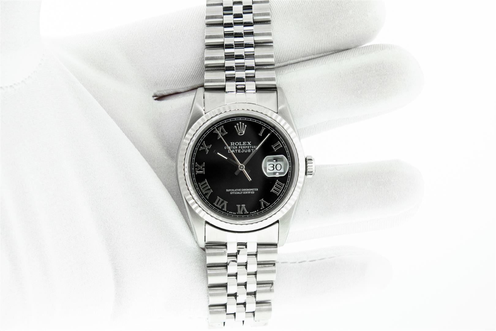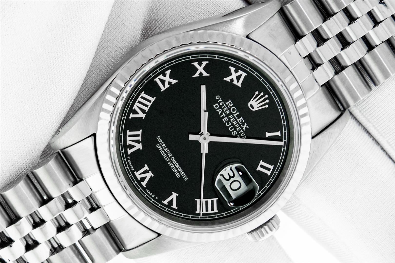 One Men's Stainless Steel Rolex Datejust Polished Bright with Satin Finish, This Watch Has Been Serviced & Electronically Tested, Rolex Stainless Steel Case: 36mm, Rolex Stainless Steel Crown, Rolex Bezel: 18K White Gold Fluted Bezel. Custom Crystal: New Sapphire With Magnified Date Window. Custom Hands: New Luminescent Hands. Rolex Movement: Automatic Winding Movement Caliber 3135. Rolex Dial: Rolex Black Dial With Roman Numerical Hour Markers Date Window: 3 O'clock Position Date Display, Quickset, Model: Sapphire Datejust, Condition: G-6 Extra Fine. Rolex Bracelet: Stainless Steel Jubilee Band. Bright Polish & Satin Finish. 7.0 Inch Length, Adjustable. Standard Clasp, With Rolex Logo. This Pre Owned Watch Has Been Serviced Time Tested And Is In Excellent Condition It Is Free Of All Scratches And Dents. This Watch Comes With Rolex Box.