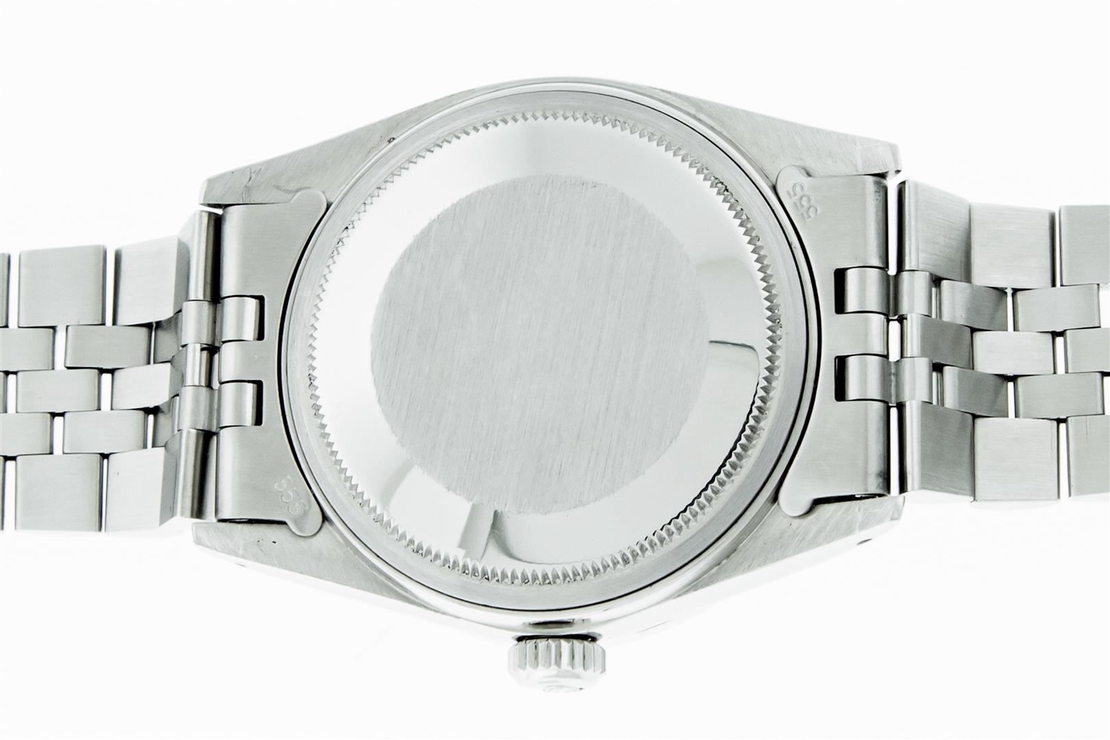 One Men's Rolex Datejust Polished Bright with Satin Finish, Serviced & Electronically Tested, Rolex Stainless Steel Case: 36mm, Custom Diamond Lugs: 28 Diamonds On Lugs, Color: G to H, Clarity: SI-VS. Rolex Stainless Steel Crown, Custom Bezel: 18K White Gold Diamond Beadset Bezel, Diamond Count: 44 Diamonds, Total Weight 1.00 Carat, Clarity: SI-VS, Color: G to H. Custom Crystal: New Sapphire With Magnified Date Window. Custom Hands: New Luminescent Hands. Rolex Movement: Automatic Winding Movement. Custom Dial: Black String Diamond Dial, Stone Count: 43 Diamonds On Dial, Diamond Color: G To H In Color, Clarity: VS. Date Window: 3 O'clock Position Date Display, Quickset, Model: Datejust Condition: G-6 Extra Fine. Rolex Bracelet: Stainless Steel Jubilee Band. Bright Polish & Satin Finish. 7.0 Inch Length, Adjustable. Standard Clasp, With Rolex Logo. This Pre Owned Watch Has Been Serviced And Polished And Its Free Of All Dents And Scratches. This Watch Comes With A Rolex Box And Booklets.