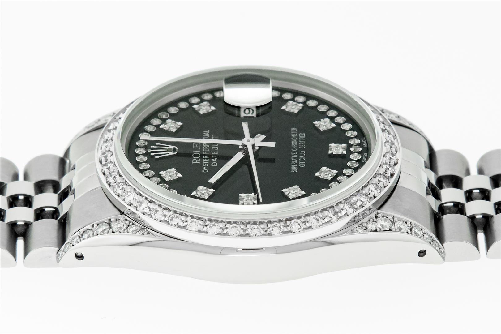 One Men's Rolex Datejust Polished Bright with Satin Finish, Serviced & Electronically Tested, Rolex Stainless Steel Case: 36mm, Custom Diamond Lugs: 28 Diamonds On Lugs, Color: G to H, Clarity: SI-VS. Rolex Stainless Steel Crown, Custom Bezel: 18K White Gold Diamond Beadset Bezel, Diamond Count: 44 Diamonds, Total Weight 1.00 Carat, Clarity: SI-VS, Color: G to H. Custom Crystal: New Sapphire With Magnified Date Window. Custom Hands: New Luminescent Hands. Rolex Movement: Automatic Winding Movement. Custom Dial: Black String Diamond Dial, Stone Count: 43 Diamonds On Dial, Diamond Color: G To H In Color, Clarity: VS. Date Window: 3 O'clock Position Date Display, Quickset, Model: Datejust Condition: G-6 Extra Fine. Rolex Bracelet: Stainless Steel Jubilee Band. Bright Polish & Satin Finish. 7.0 Inch Length, Adjustable. Standard Clasp, With Rolex Logo. This Pre Owned Watch Has Been Serviced And Polished And Its Free Of All Dents And Scratches. This Watch Comes With A Rolex Box And Booklets.