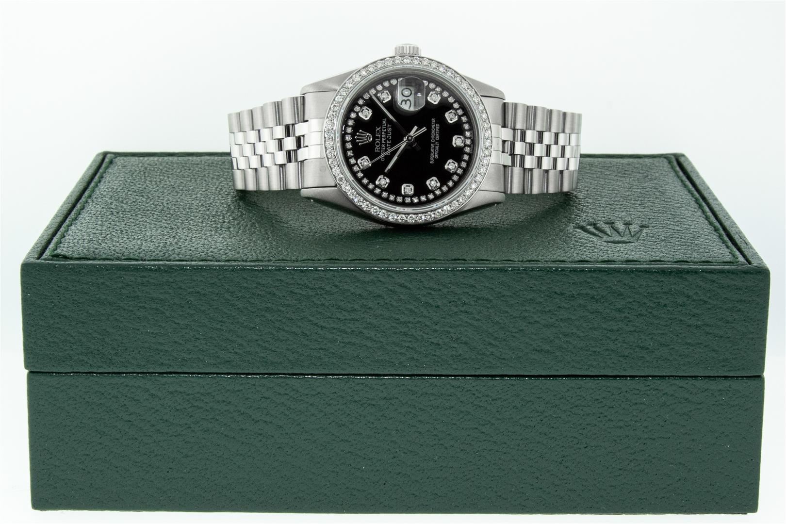 One Men's Rolex Stainless Steel Datejust Polished Bright with Satin Finish, This Watch Has Been Serviced & Electronically Tested, Rolex Stainless Steel Case: 36mm, Rolex Stainless Steel Crown, Custom Bezel: New Stainless Steel Beadset Diamond Bezel, Diamond Count: 54 Diamonds, Total Weight 1.00 Carat, Clarity: SI-VS, Color: G to H. Custom Crystal: New Sapphire With Cyclops Lens. Custom Hands: New Luminescent Hands. Rolex Movement: Automatic Winding Movement. Custom Dial: Refinished To Black String With Added Diamond Hour Markers, Diamond Count: 58 Diamonds In Dial, Color: G to H, Clarity: VS2-SI1. Date Window: 3 O'clock Position Date Display, Quickset, Model: Datejust. Condition: G-6 Extra Fine. Rolex Bracelet: Stainless Steel Jubilee Band. Bright Polish & Satin Finish. 7.0 Inch Length, Adjustable. Standard Clasp, With Rolex Logo. This Pre Owned Watch Has Been Serviced Time Tested And Is In Excellent Condition It Is Free Of All Scratches And Dents. This Watch Comes With A Rolex Box.
