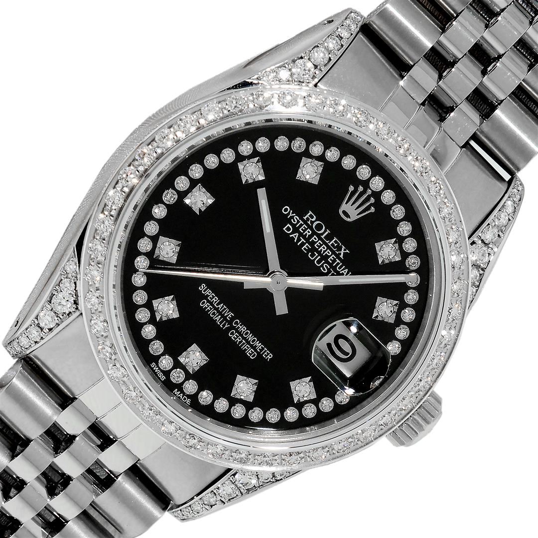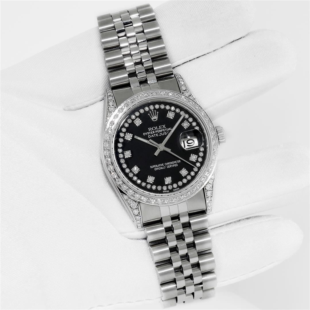 One Men's Rolex Datejust Polished Bright with Satin Finish, Serviced & Electronically Tested, Rolex Stainless Steel Case: 36mm, Custom Diamond Lugs: 28 Diamonds On Lugs, Color: G to H, Clarity: SI-VS. Rolex Stainless Steel Crown, Custom Bezel: 18K White Gold Diamond Beadset Bezel, Diamond Count: 44 Diamonds, Total Weight 1.00 Carat, Clarity: SI-VS, Color: G to H. Custom Crystal: New Sapphire With Magnified Date Window. Custom Hands: New Luminescent Hands. Rolex Movement: Automatic Winding Movement. Custom Dial: Black String Diamond Dial, Stone Count: 43 Diamonds On Dial, Diamond Color: G To H In Color, Clarity: VS. Date Window: 3 O'clock Position Date Display, Quickset, Model: Datejust Condition: G-6 Extra Fine. Rolex Bracelet: Stainless Steel Jubilee Band. Bright Polish & Satin Finish. 7.0 Inch Length, Adjustable. Standard Clasp, With Rolex Logo. This Pre Owned Watch Has Been Serviced And Polished And Its Free Of All Dents And Scratches. This Watch Comes With A Rolex Box And Booklets.