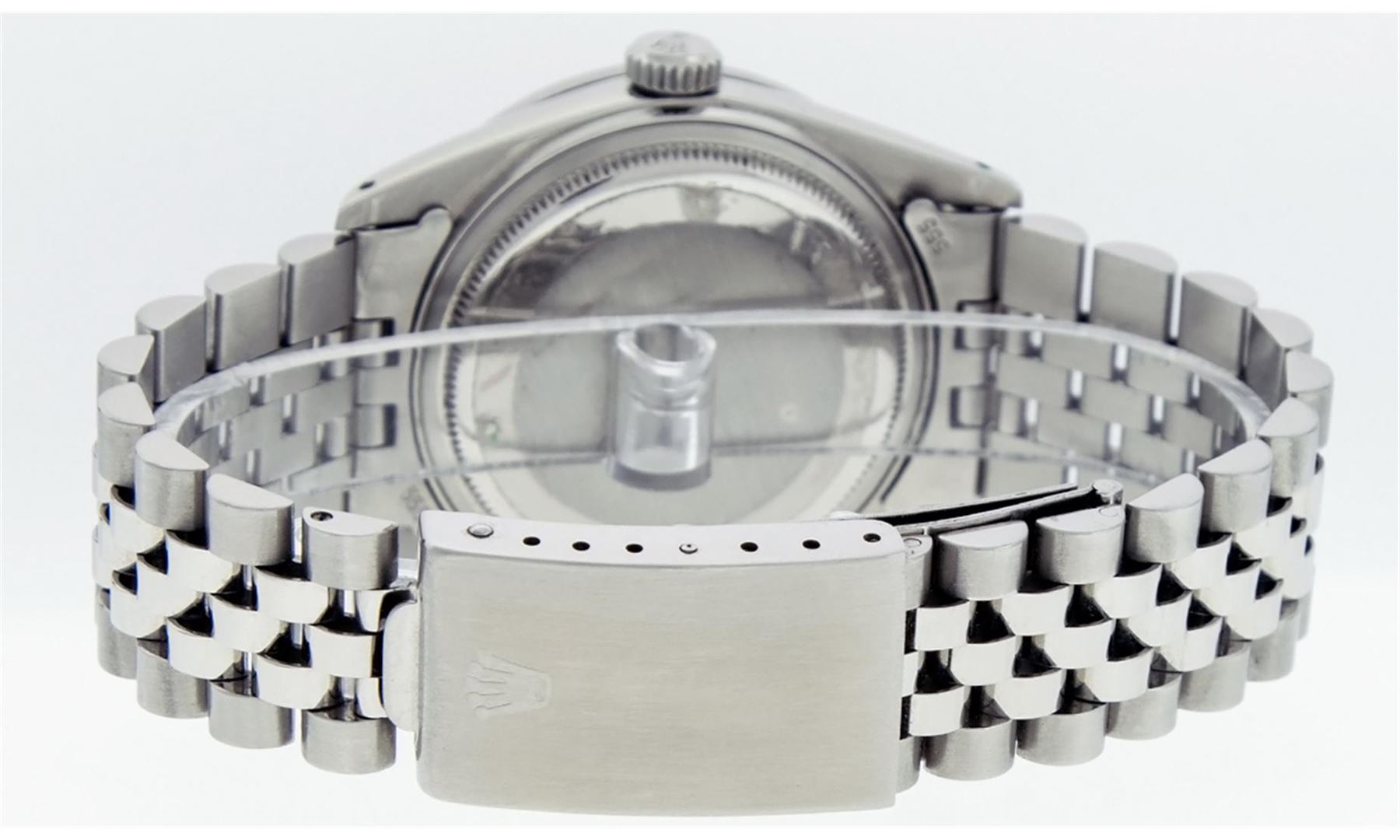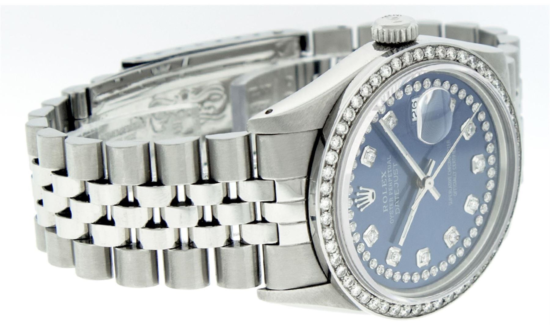 One Mens Rolex Stainless Steel Datejust Polished Bright with Satin Finish, This Watch Has Been Serviced & Electronically Tested, Stainless Steel Case: 36mm, Stainless Steel Crown, Custom Bezel: Stainless Steel Beadset Diamond Bezel, Diamond Count: 54 Diamonds, Total Weight 1.00 Carat, Clarity: SI-VS, Color: G to H. Custom Crystal: New Synthetic Sapphire Cyclops Lens. Custom Hands: New Luminescent Hands. Movement: Automatic Winding Movement Caliber 3035. Custom Dial: Blue String Diamond Dial, Diamond Count: 58 Diamonds In Dial, Color: G to H, Clarity: VS2-SI1. Date Window: 3 O'Clock Position Date Display, Quickset, Model: Datejust. Condition: G-6 Extra Fine. Bracelet: Stainless Steel Jubilee Band. Bright Polish & Satin Finish. 7.0 Inch Length, Adjustable. Standard Clasp, With Rolex Logo. This Watch Has Been Serviced Time Tested And Is In Excellent Condition It Is Free Of All Scratches And Dents.