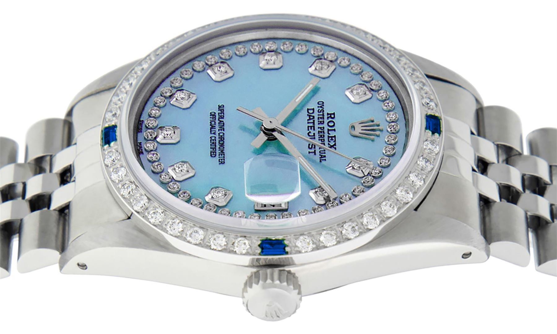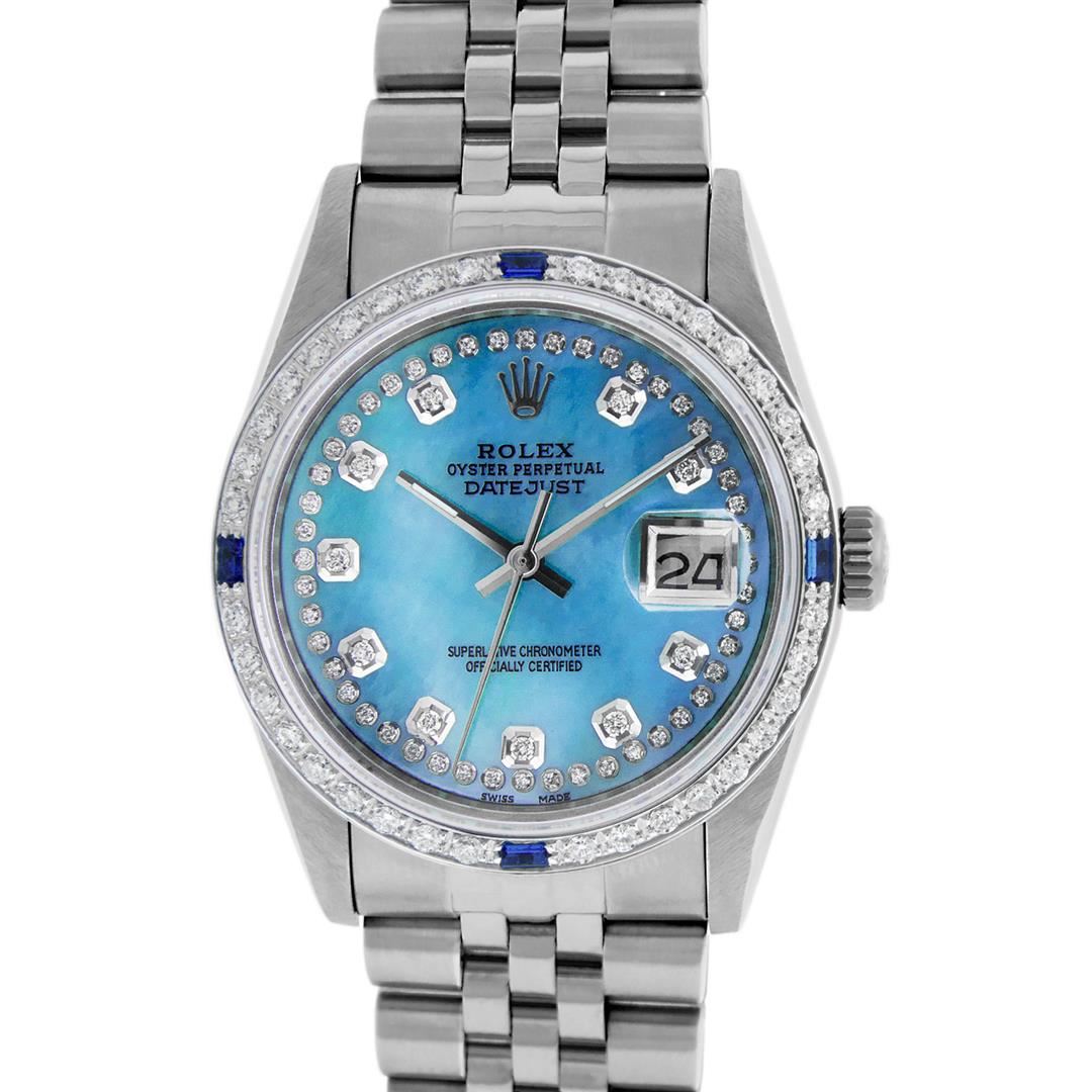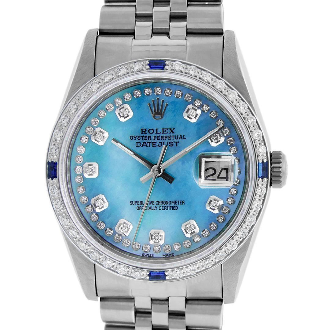 One Men's Rolex Datejust Polished Bright with Satin Finish, Serviced & Electronically Tested, Stainless Steel Case: 36mm, Stainless Steel Crown, Custom Bezel: 18K White Gold Diamond + Sapphire Beadset, Diamond Count: 36 Diamonds + 4 Sapphires, Total Weight 1.00 Carat, Clarity: SI-VS, Color: G to H. Custom Crystal: New Scratch Resistant Synthetic Sapphire Cyclops Lens. Custom Hands: New Luminescent Hands. Movement: Automatic Winding Movement.. Custom Dial: Blue Mother Of Pearl String Diamond Dial, Stone Count: 58 Diamonds In Dial, Diamond Color: G To H In Color, Clarity: VS. Date Window: 3 O'clock Position Date Display, Quickset, Model: Datejust Condition: G-6 Extra Fine. Bracelet: Stainless Steel Jubilee Band. Bright Polish & Satin Finish. 7.0 Inch Length, Adjustable. Standard Clasp, With Rolex Logo. This Watch Has Been Serviced And Polished And Its Free Of All Dents And Scratches.