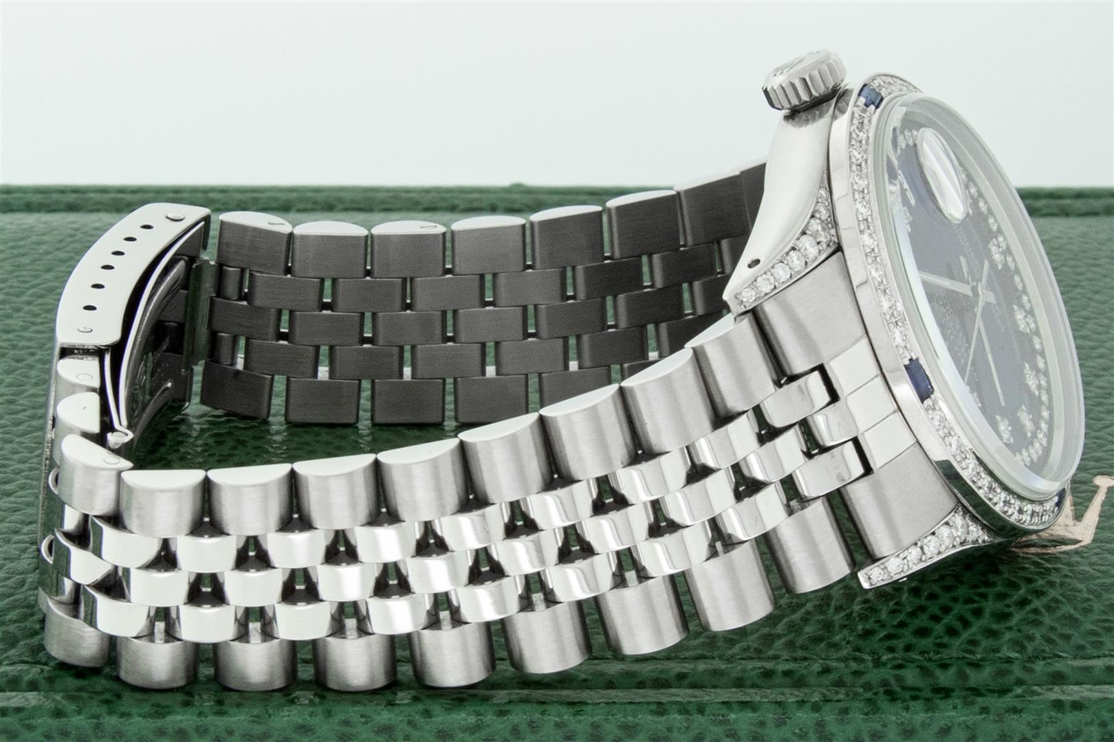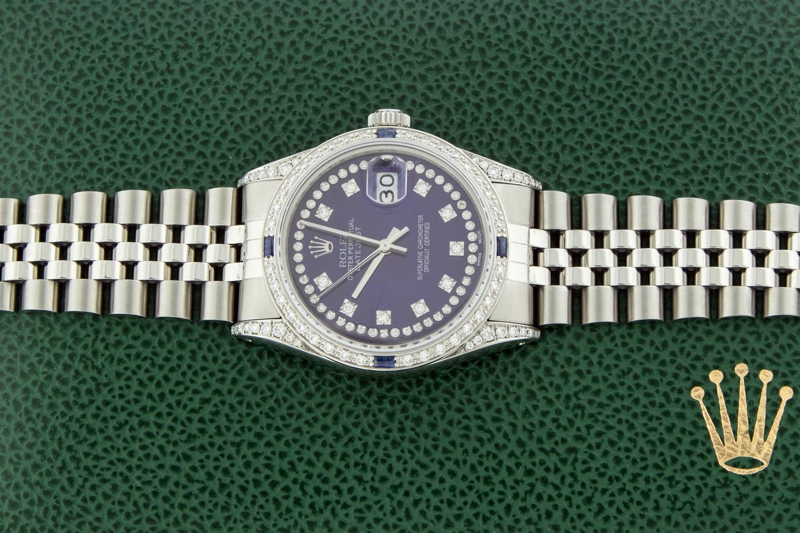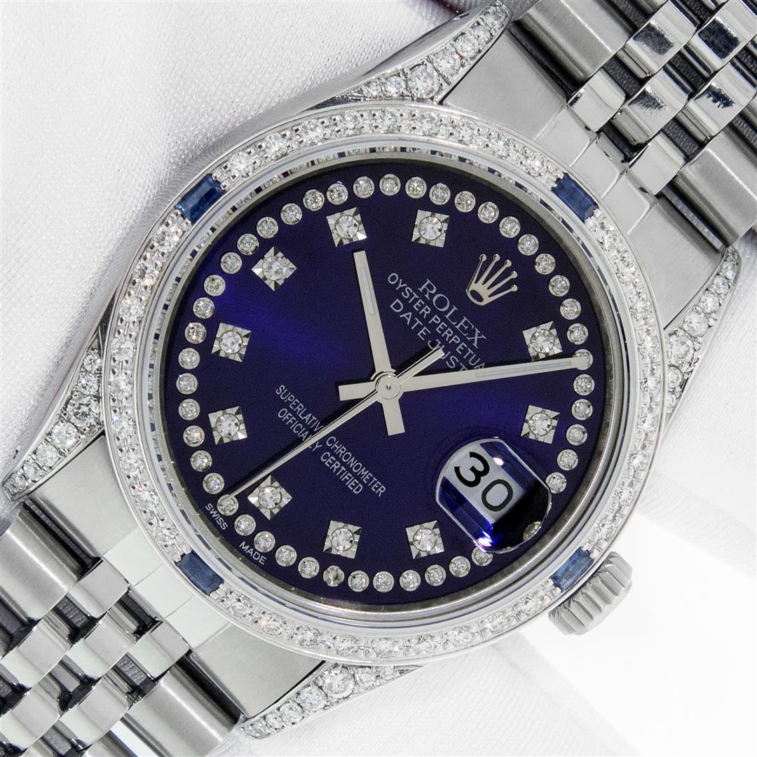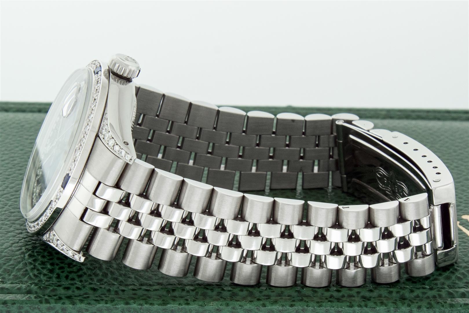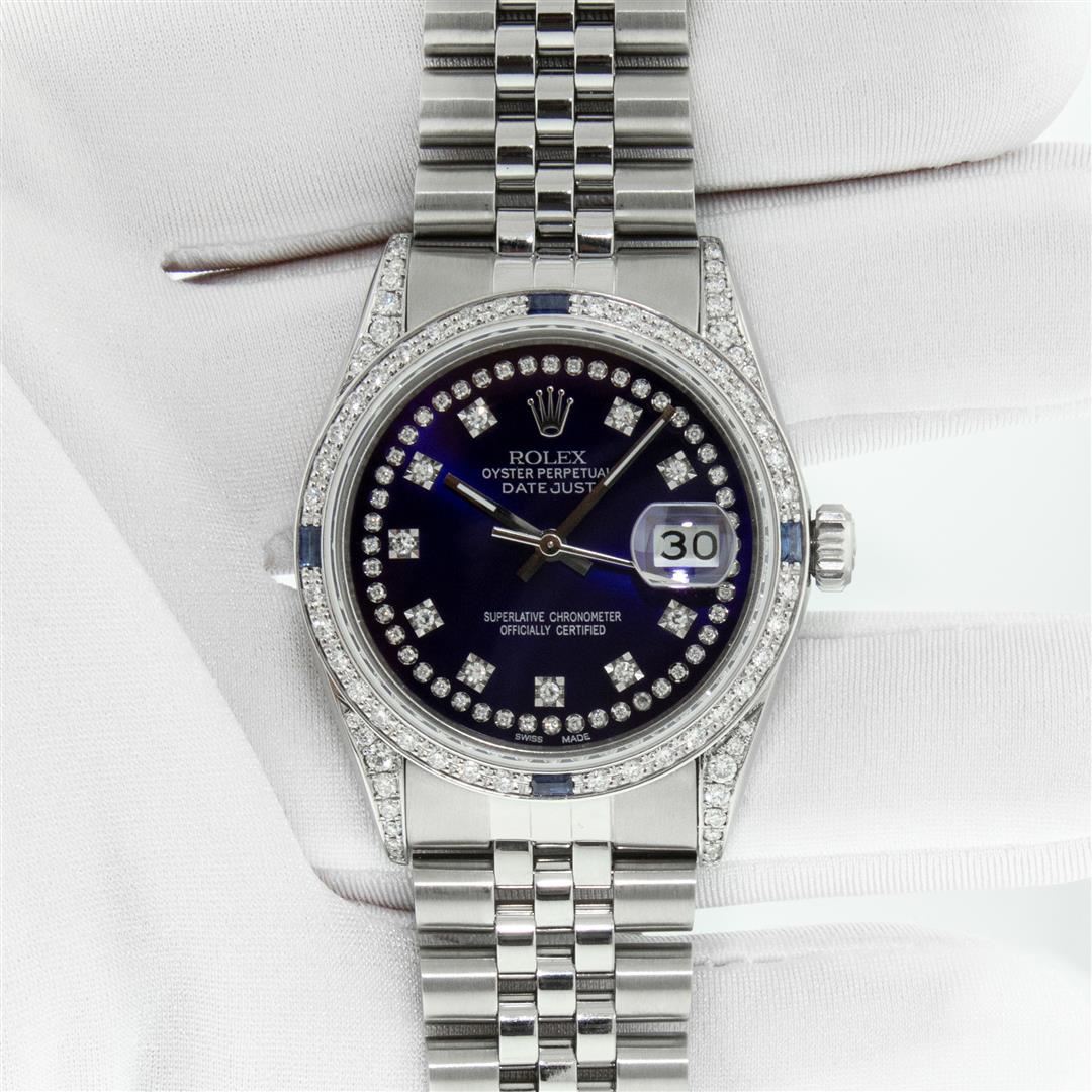 One Men's Rolex Datejust Polished Bright with Satin Finish, Serviced & Electronically Tested, Rolex Stainless Steel Case: 36mm, Custom Diamond Lugs: 28 Diamonds On Lugs, Color: G to H, Clarity: SI-VS. Rolex Stainless Steel Crown, Custom Bezel: New 18K White Gold Diamond + Sapphire Beadset, Diamond Count: 36 Diamonds + 4 Sapphires, Total Weight 1.00 Carat, Clarity: SI-VS, Color: G to H. Custom Crystal: New Sapphire With Magnified Date Window. Custom Hands: New Luminescent Hands. Rolex Movement: Automatic Winding Movement. Custom Dial: Refinished To Blue With Added String Diamonds, Stone Count: 43 Diamonds On Dial, Diamond Color: G To H In Color, Clarity: VS. Date Window: 3 O'clock Position Date Display, Quickset, Model: Datejust Condition: G-6 Extra Fine. Rolex Bracelet: Stainless Steel Jubilee Band. Bright Polish & Satin Finish. 7.0 Inch Length, Adjustable. Standard Clasp, With Rolex Logo. This Pre Owned Watch Has Been Serviced And Polished And Its Free Of All Dents And Scratches. This Watch Comes With A Rolex Box.