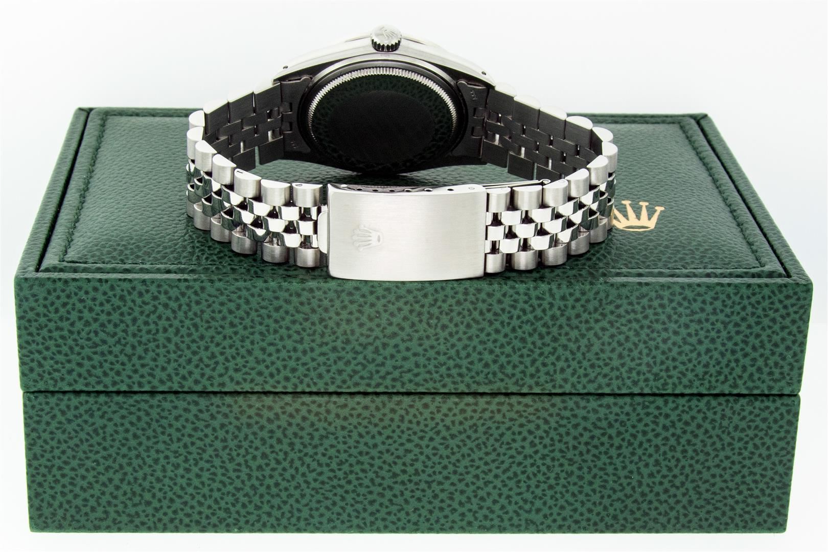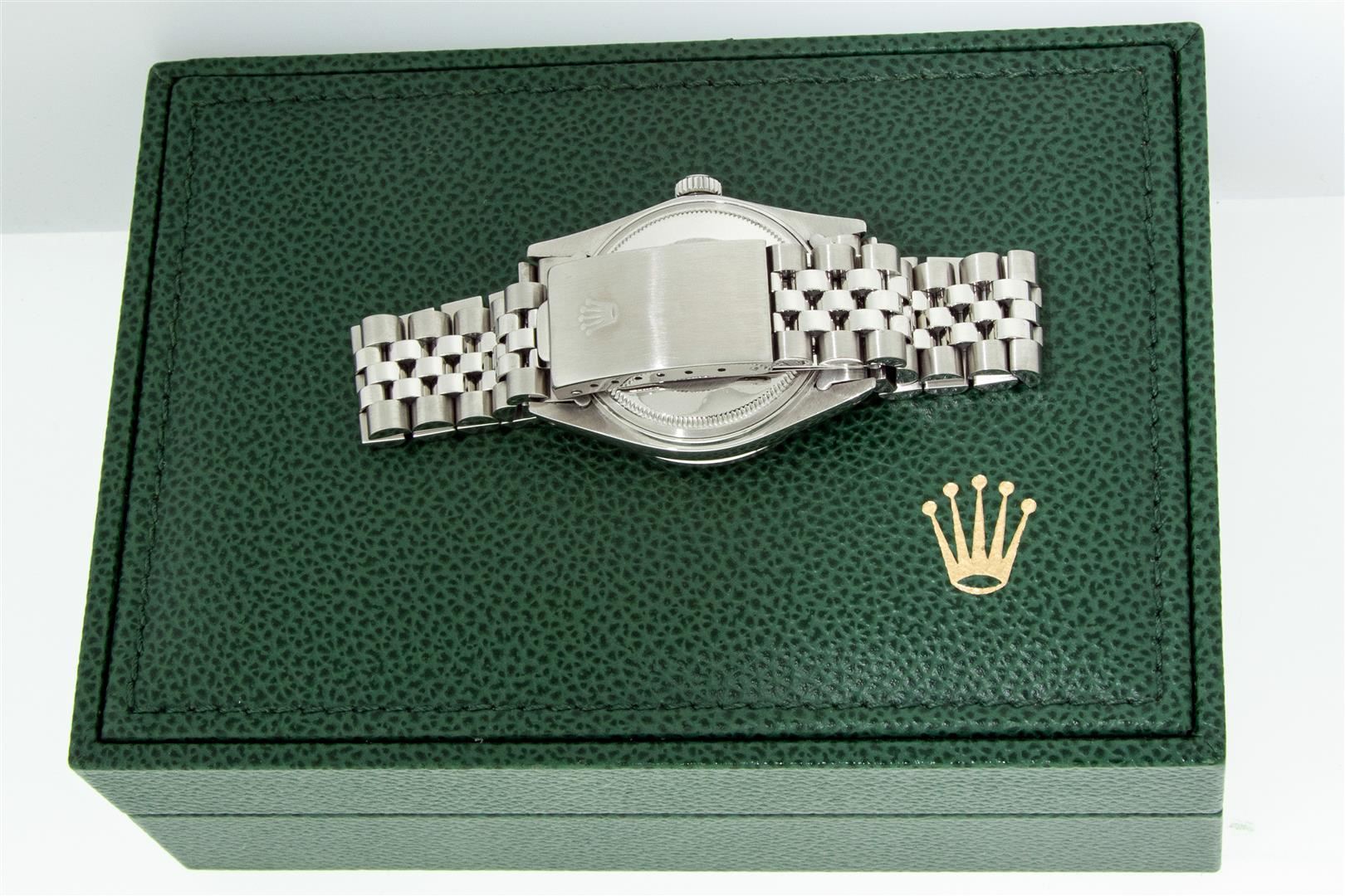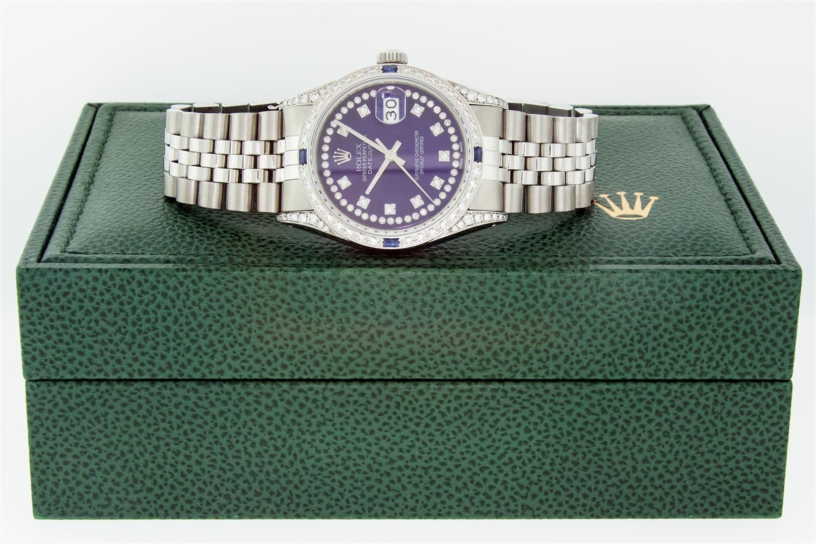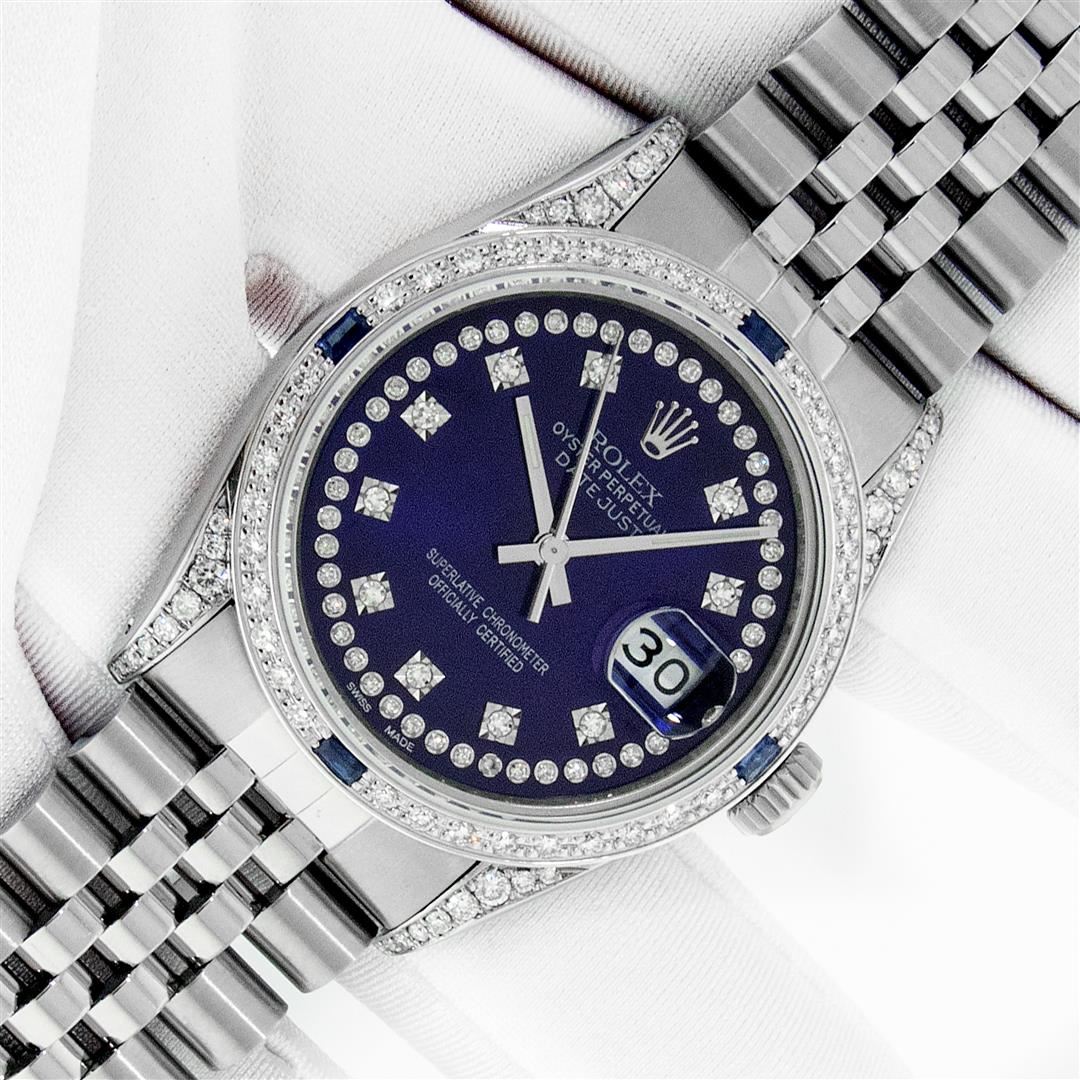 One Men's Rolex Datejust Polished Bright with Satin Finish, Serviced & Electronically Tested, Rolex Stainless Steel Case: 36mm, Custom Diamond Lugs: 28 Diamonds On Lugs, Color: G to H, Clarity: SI-VS. Rolex Stainless Steel Crown, Custom Bezel: New 18K White Gold Diamond + Sapphire Beadset, Diamond Count: 36 Diamonds + 4 Sapphires, Total Weight 1.00 Carat, Clarity: SI-VS, Color: G to H. Custom Crystal: New Sapphire With Magnified Date Window. Custom Hands: New Luminescent Hands. Rolex Movement: Automatic Winding Movement. Custom Dial: Refinished To Blue With Added String Diamonds, Stone Count: 43 Diamonds On Dial, Diamond Color: G To H In Color, Clarity: VS. Date Window: 3 O'clock Position Date Display, Quickset, Model: Datejust Condition: G-6 Extra Fine. Rolex Bracelet: Stainless Steel Jubilee Band. Bright Polish & Satin Finish. 7.0 Inch Length, Adjustable. Standard Clasp, With Rolex Logo. This Pre Owned Watch Has Been Serviced And Polished And Its Free Of All Dents And Scratches. This Watch Comes With A Rolex Box.