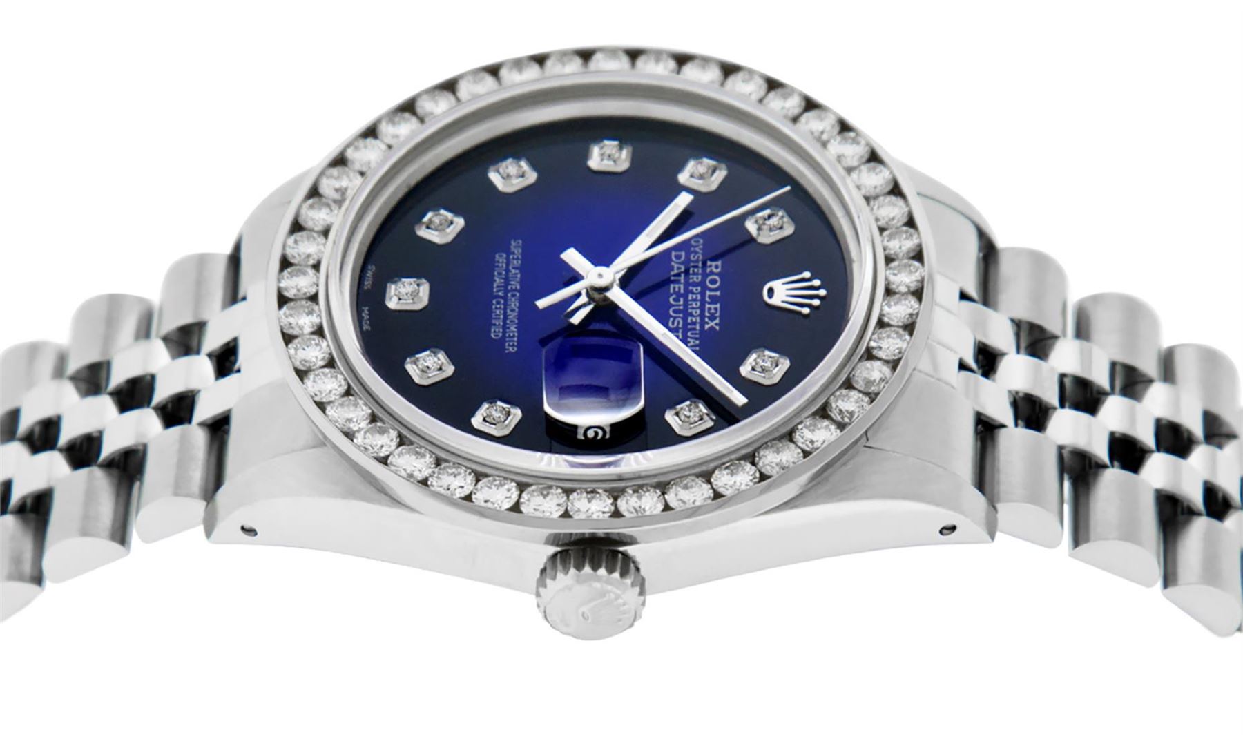 One Men's Stainless Steel Rolex Datejust Polished Bright with Satin Finish, Fully Serviced & Electronically Tested, Stainless Steel Case:36mm, Stainless Steel Crown, Custom Bezel: 18K White Gold 3.00 Ctw Diamond Bezel, Diamond Count: 40 Diamonds, Total Weight 3.0 Carat, Clarity: SI-VS, Color: G to H. Custom Crystal: New Synthetic Sapphire Cyclops Lens. Custom Hands: New Luminescent Hands. Movement: Automatic Winding Movement Caliber 3035. Custom Dial: Blue Vignette Diamond Dial, 10 Diamonds in Dial, G To H In Color, Clarity: SI-VS. Date Window: 3 O'clock Position Date Display, Quickset, Model: Datejust 36mm, Condition: G-6 Extra Fine. Bracelet: Rolex Stainless Steel Jubilee Band. Bright Polish & Satin Finish. 7.0 Inch Length, Adjustable. Standard Clasp, With Rolex Logo. Watch Has Been Serviced And Polished It Is Free Of All Scratches And Dents.