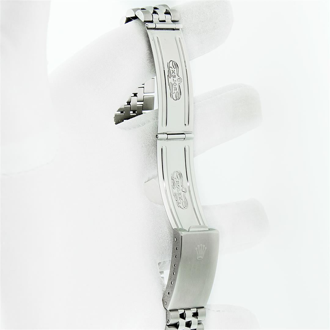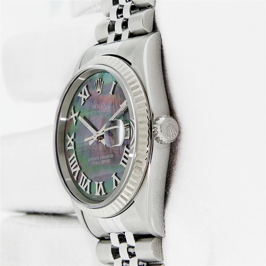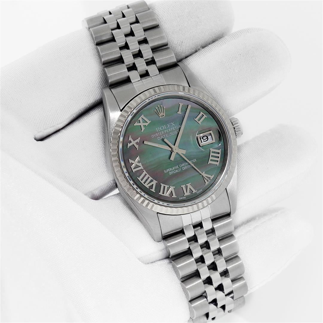 One Men's Stainless Steel Rolex Datejust Polished Bright with Satin Finish, This Watch Has Been Serviced & Electronically Tested, Stainless Steel Case: 36mm, Rolex Stainless Steel Crown, Rolex Bezel: White Gold Fluted Bezel. Custom Crystal: New Sapphire With Magnified Date Window. Custom Hands: New Luminescent Hands. Rolex Movement: Automatic Winding Movement Caliber 3135. Custom Dial: Tahitian MOP Dial With Roman Numerical Hour Markers. Date Window: 3 O'clock Position Date Display, Quickset, Model: Datejust, Condition: G-6 Extra Fine. Rolex Bracelet: Stainless Steel Jubilee Band. Bright Polish & Satin Finish. 7.0 Inch Length, Adjustable. Standard Clasp, With Rolex Logo. This Pre Owned Watch Has Been Serviced Time Tested And Is In Excellent Condition It Is Free Of All Scratches And Dents.