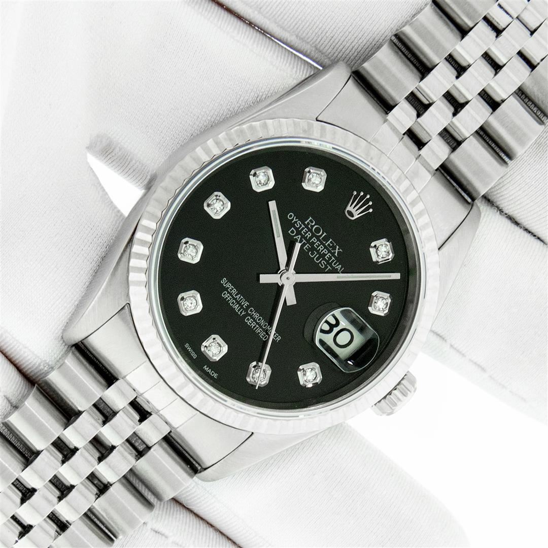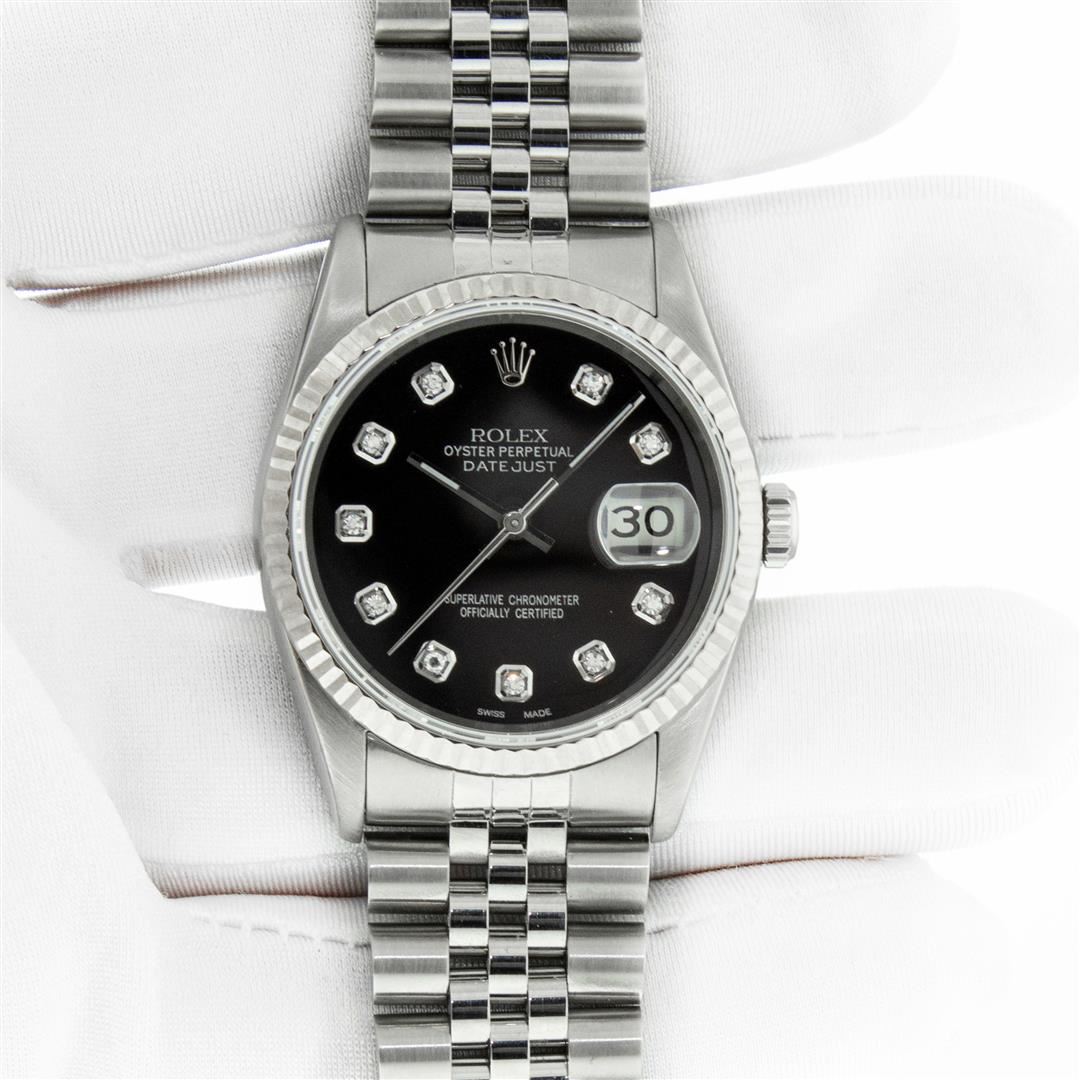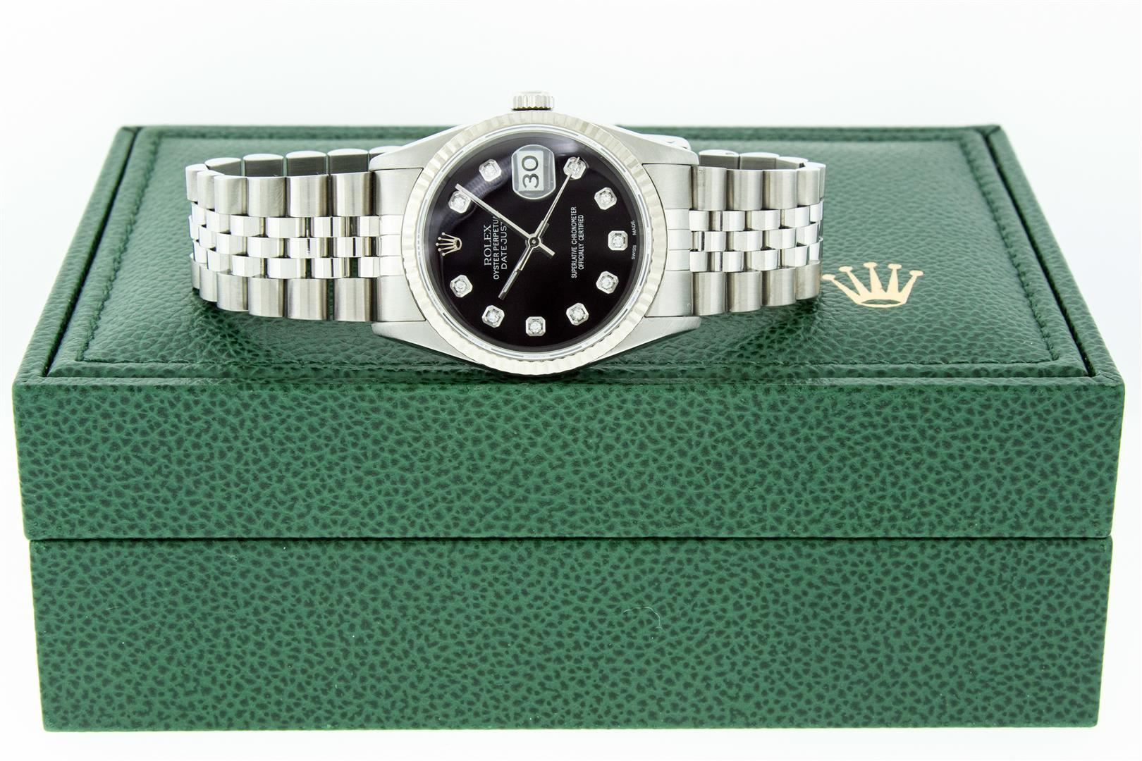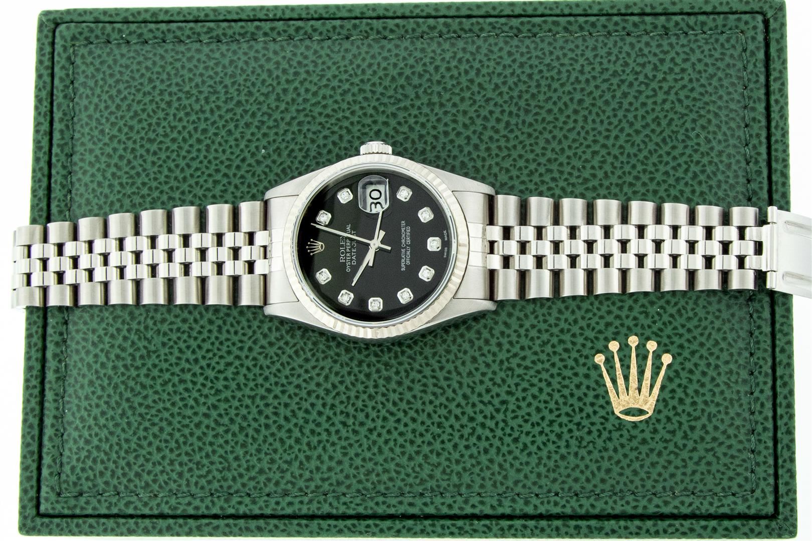One Men's Stainless Steel Rolex Datejust Polished Bright with Satin Finish, This Watch Has Been Serviced & Electronically Tested, Rolex Stainless Steel Case: 36mm, Rolex Stainless Steel Crown, Original Bezel: 14K White Gold Fluted Bezel. Custom Crystal: New Sapphire With Magnified Date Window. Custom Hands: New Luminescent Hands. Rolex Movement: Automatic Winding Movement Caliber 3135. Custom Dial: Refinished To Black With Custom Added Diamonds, Diamond Count: 10 Diamonds On Dial, G To H In Color, SI-VS Clarity. Date Window: 3 O'clock Position Date Display, Quickset, Model: Datejust, Condition: G-6 Extra Fine. Rolex Bracelet: Stainless Steel Jubilee Band. Bright Polish & Satin Finish. 7.0 Inch Length, Adjustable. Standard Clasp, With Rolex Logo. This Pre Owned Watch Has Been Serviced Time Tested And Is In Excellent Condition It Is Free Of All Scratches And Dents. This Watch Comes With A Rolex Box.