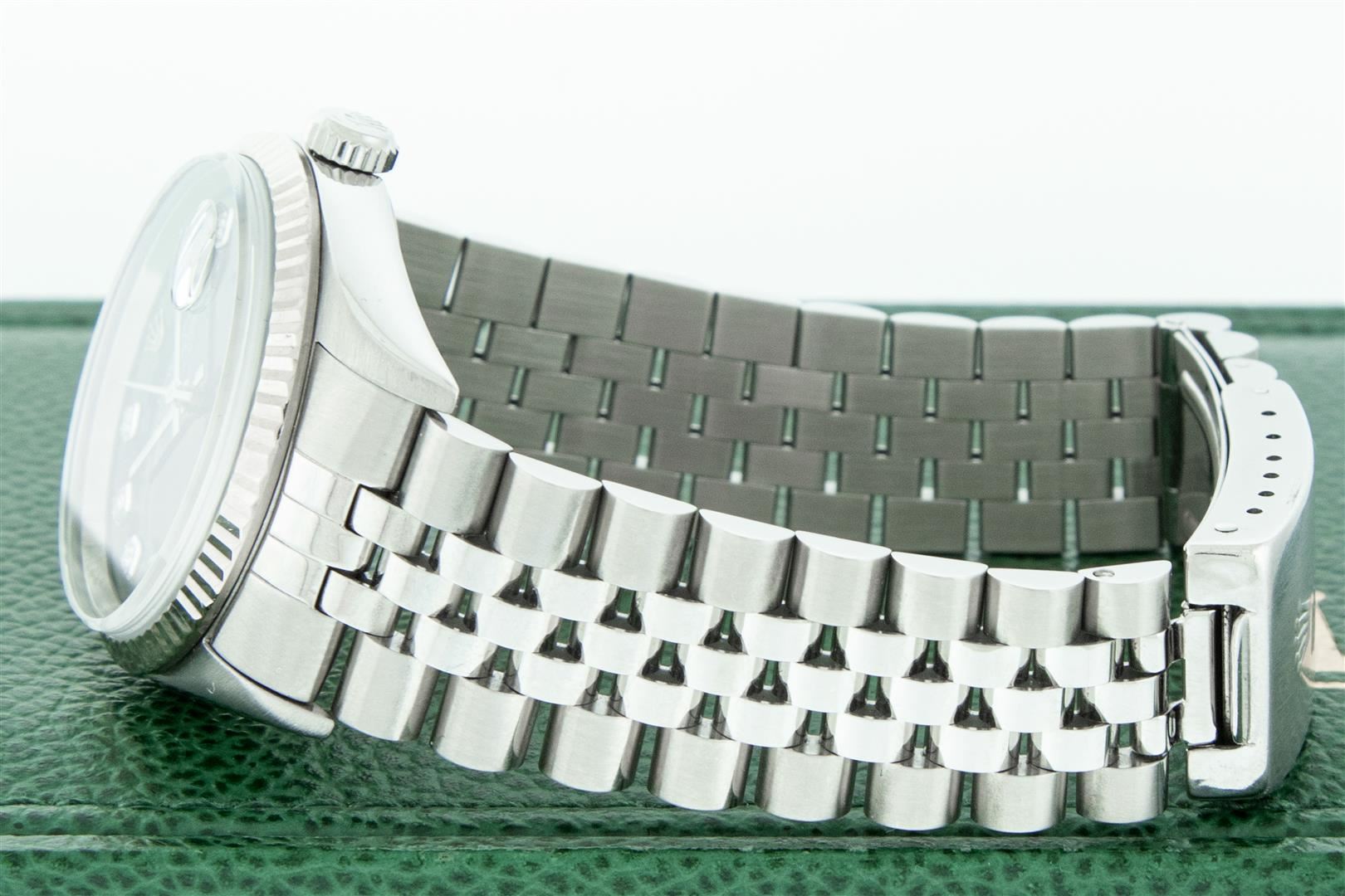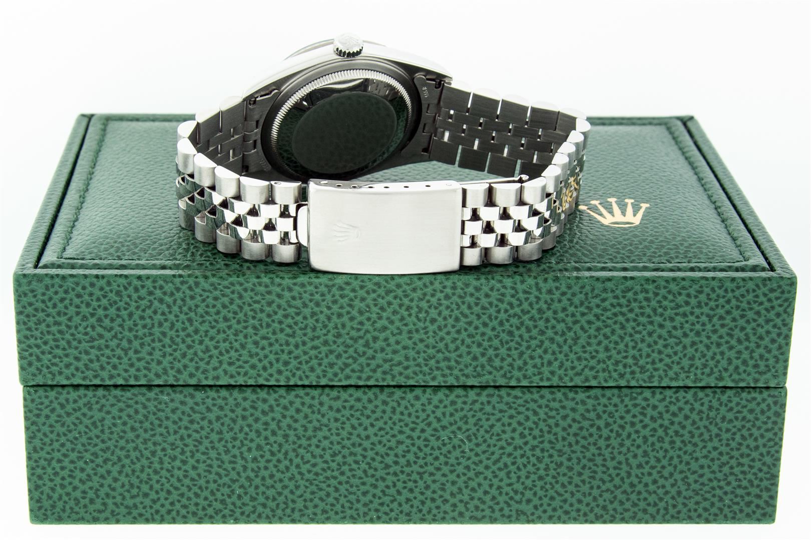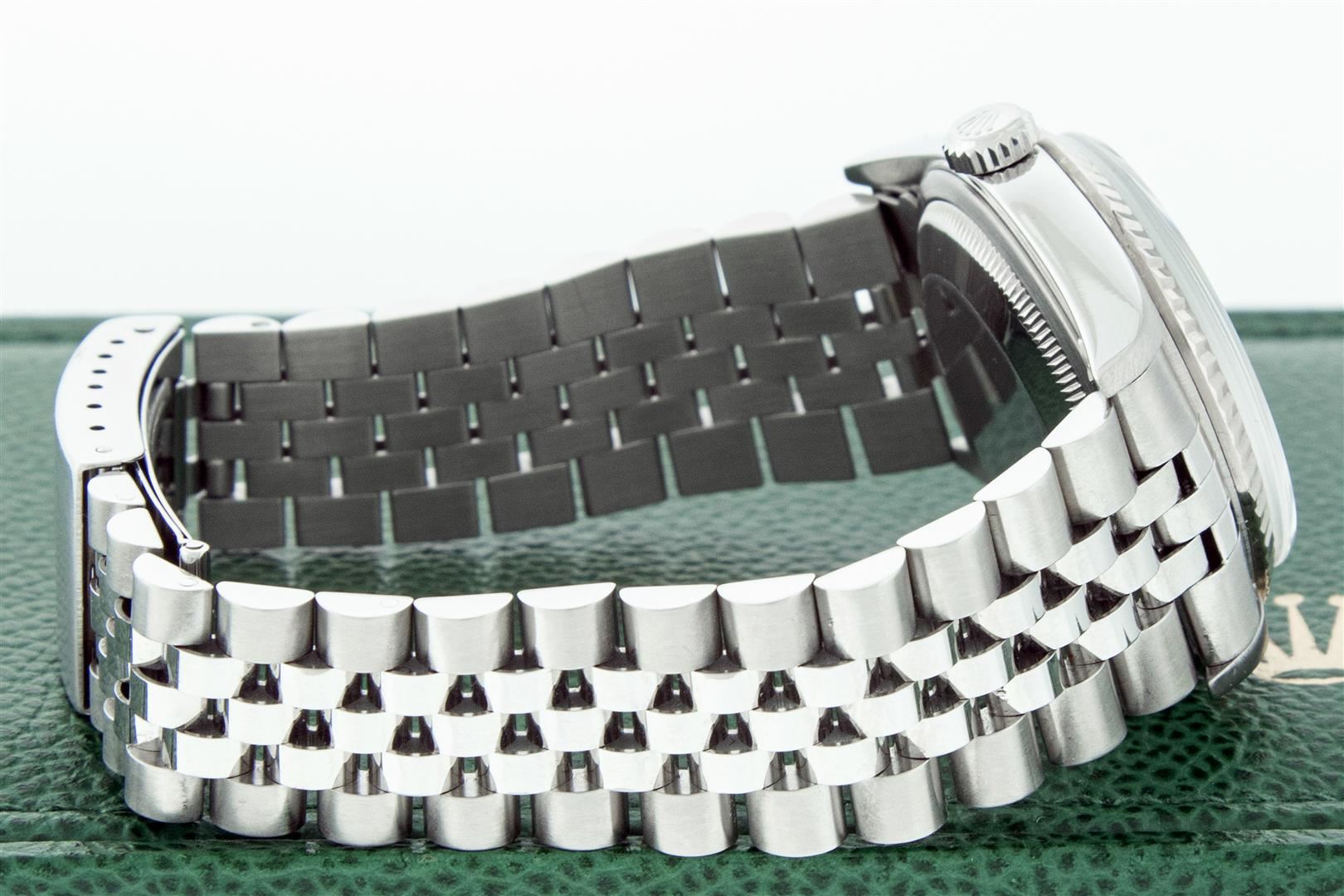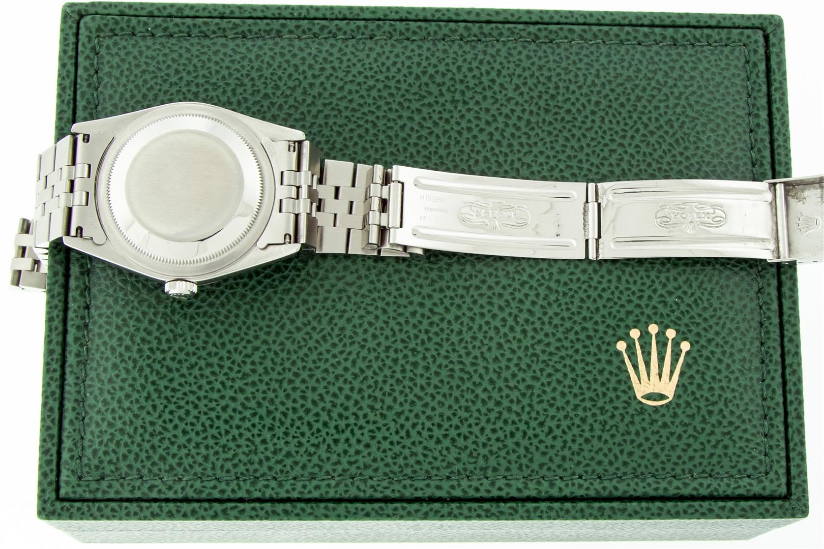 One Men's Stainless Steel Rolex Datejust Polished Bright with Satin Finish, This Watch Has Been Serviced & Electronically Tested, Rolex Stainless Steel Case: 36mm, Rolex Stainless Steel Crown, Original Bezel: 14K White Gold Fluted Bezel. Custom Crystal: New Sapphire With Magnified Date Window. Custom Hands: New Luminescent Hands. Rolex Movement: Automatic Winding Movement Caliber 3135. Custom Dial: Refinished To Black With Custom Added Diamonds, Diamond Count: 10 Diamonds On Dial, G To H In Color, SI-VS Clarity. Date Window: 3 O'clock Position Date Display, Quickset, Model: Datejust, Condition: G-6 Extra Fine. Rolex Bracelet: Stainless Steel Jubilee Band. Bright Polish & Satin Finish. 7.0 Inch Length, Adjustable. Standard Clasp, With Rolex Logo. This Pre Owned Watch Has Been Serviced Time Tested And Is In Excellent Condition It Is Free Of All Scratches And Dents. This Watch Comes With A Rolex Box.