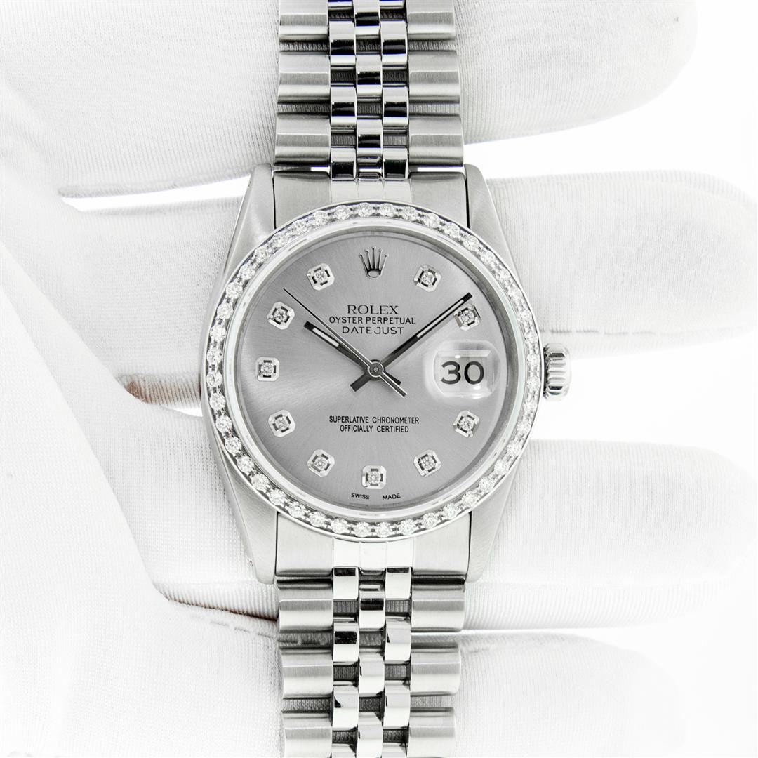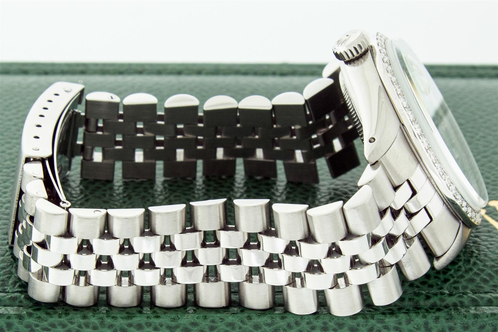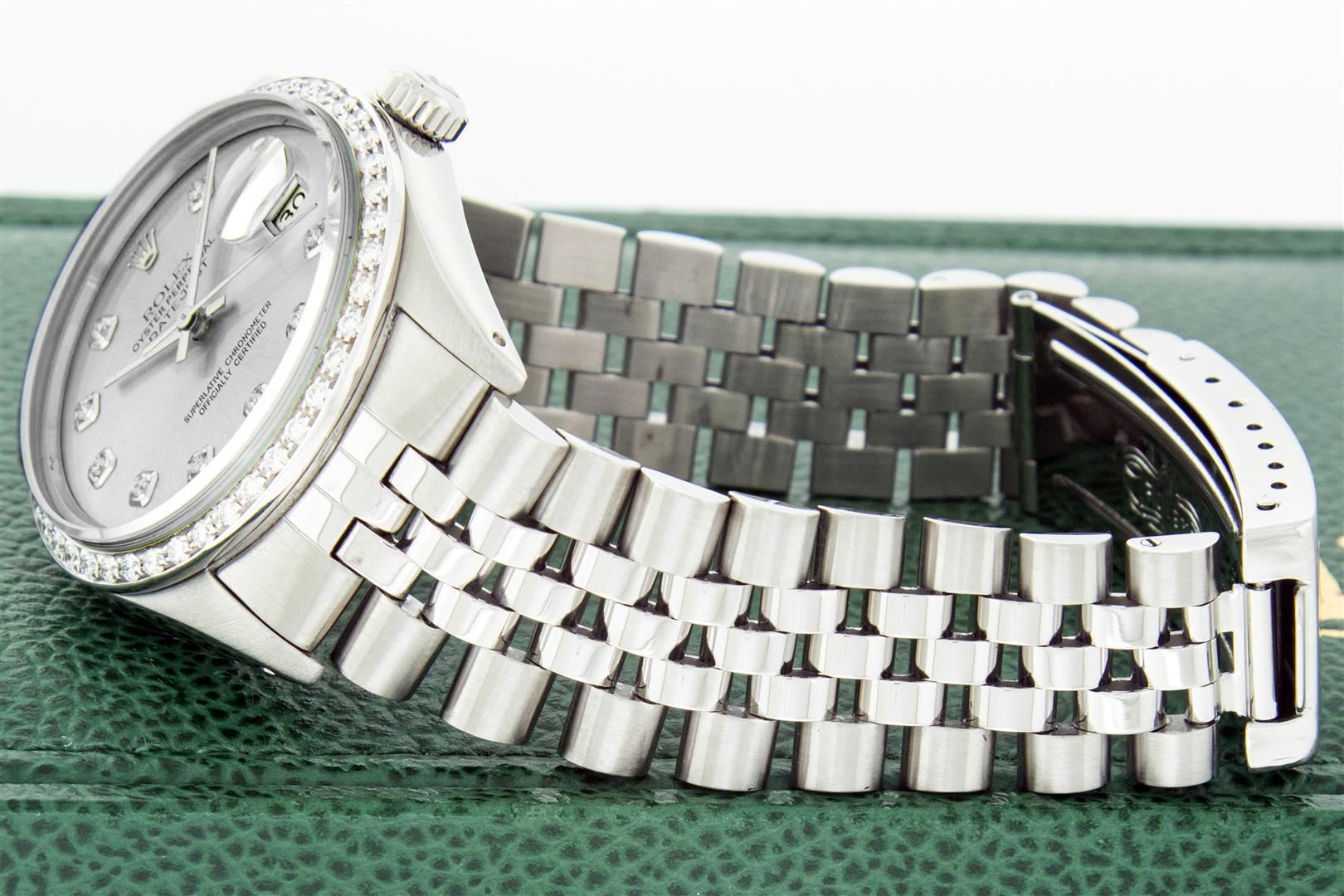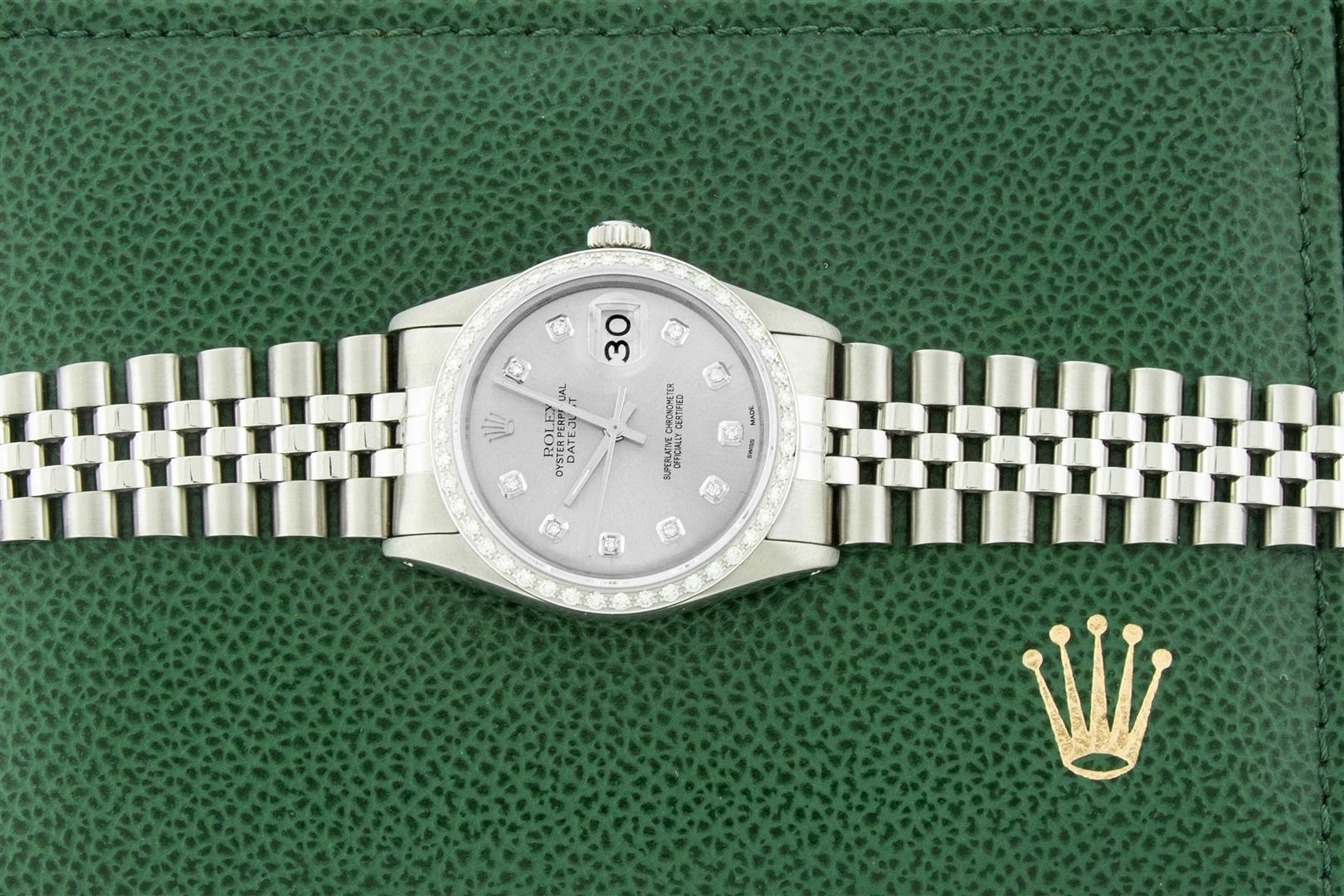 One Men's Stainless Steel Rolex Datejust Polished, Serviced & Electronically Tested, Stainless Steel Case: 36mm, Rolex Stainless Steel Crown, Custom Bezel: New 18K White Gold Beadset Diamond Bezel, Diamond Count: 44 Diamonds In Bezel, Clarity: SI-VS, Color: G to H. Custom Crystal: New Sapphire with Magnified Date Window. Custom Hands: New Luminescent Hands. Rolex Movement: Automatic Winding Movement. Custom Dial: Refinished To Silver with Added Diamond Hour Markers, Diamond Count: 10 Diamonds in Dial, G To H In Color, Clarity: SI-VS. Date Window: 3 O'Clock Position Date Display, Quickset, Model: Datejust. Condition: G-6 Extra Fine. Rolex Bracelet: Stainless Steel Jubilee Band. Bright Polish & Satin Finish. 7.0 Inch Length, Adjustable. Standard Clasp, with Rolex Logo. This Pre Owned Watch Has Been Serviced Time Tested And Is In Excellent Condition It Is Free Of All Scratches And Dents. This Watch Comes with A Rolex Box.