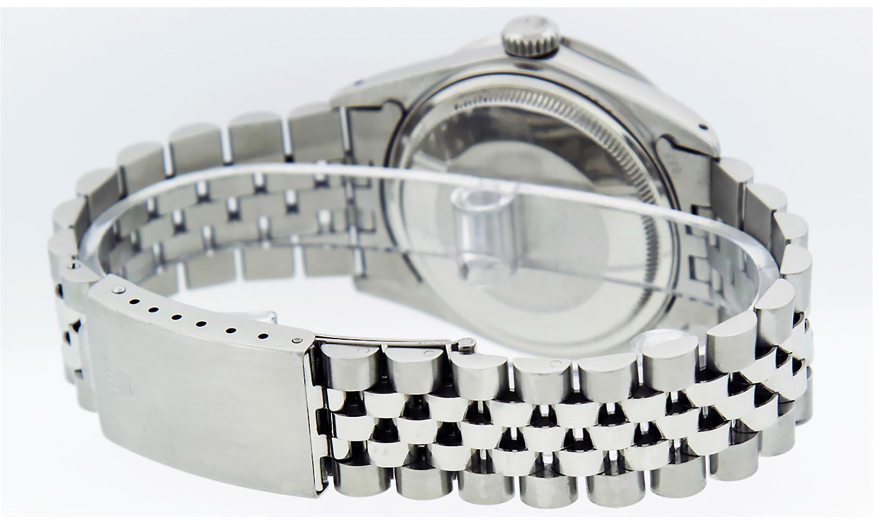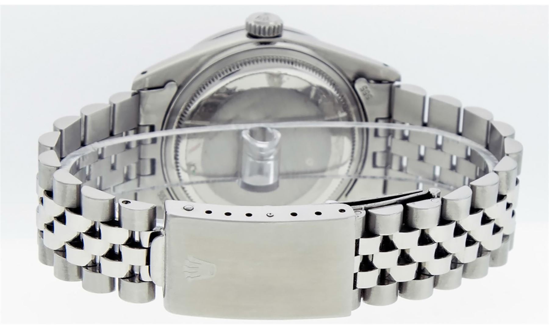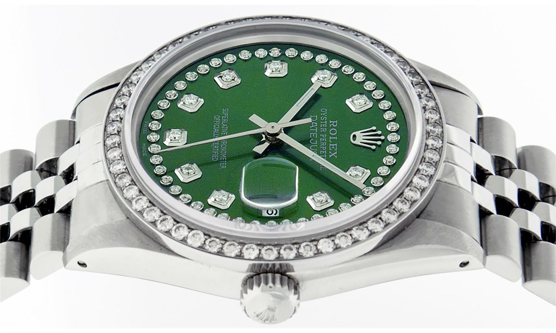 One Men's Rolex Stainless Steel Datejust Polished Bright with Satin Finish, This Watch Has Been Serviced & Electronically Tested, Stainless Steel Case: 36mm, Stainless Steel Crown, Custom Bezel: New Stainless Steel Bead-set Diamond Bezel, Diamond Count: 54 Diamonds, Total Weight 1.00 Carat, Clarity: SI-VS, Color: G to H. Custom Crystal: New Synthetic Sapphire Cyclops Lens. Custom Hands: New Luminescent Hands. Movement: Automatic Winding Movement.. Custom Dial: Green String Diamond Dial, Diamond Count: 58 Diamonds In Dial, Color: G to H, Clarity: VS2-SI1. Date Window: 3 O'clock Position Date Display, Quick-Set, Model: Datejust. Condition: G-6 Extra Fine. Bracelet: Stainless Steel Jubilee Band. Bright Polish & Satin Finish. 7.0 Inch Length, Adjustable. Standard Clasp, With Rolex Logo. This Watch Has Been Serviced Time Tested And Is In Excellent Condition It Is Free Of All Scratches And Dents.