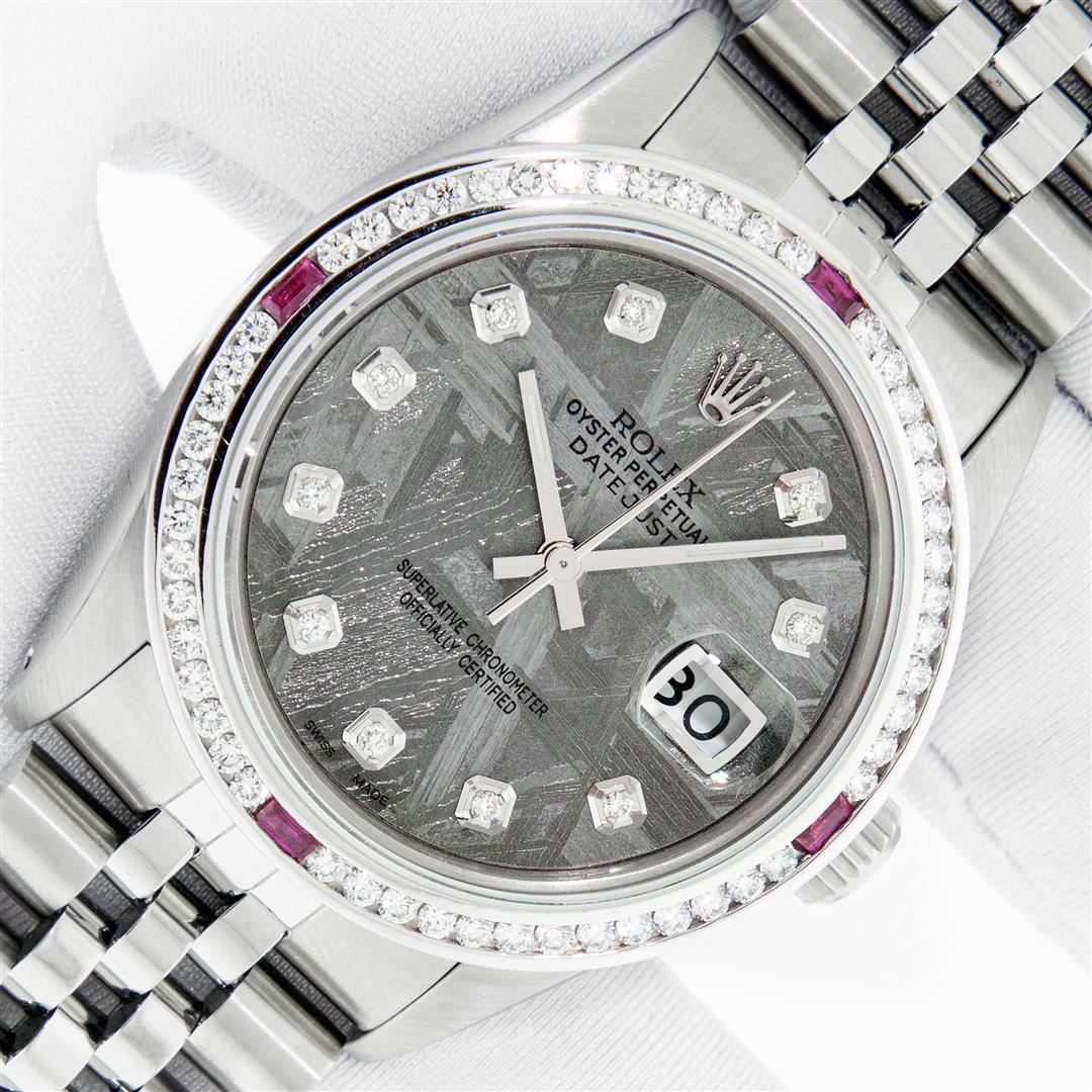 One Mens Stainless Steel Rolex Datejust Polished Bright with Satin Finish, This Watch Has Been Serviced & Electronically Tested, Rolex Stainless Steel Case: 36mm, Rolex Stainless Steel Crown, Custom Bezel: New 18K White Gold Ruby Channel Set Diamond Bezel, Diamond + Gem Count: 52 Diamonds + 4 Rubies, Total Weight 1.30 Carat, Clarity: SI-VS, Color: G to H. Custom Crystal: New Sapphire With Magnified Date Window. Custom Hands: New Luminescent Hands. Rolex Movement: Automatic Winding Movement. Custom Dial: Custom Meteorite Diamond Dial, Diamond Count: 10 Diamonds in Dial, Diamond Color: G To H In Color, Clarity: SI-VS. Date Window: 3 O'Clock Position Date Display, Quickset, Model: Datejust, Condition: G-6 Extra Fine. Rolex Bracelet: Stainless Steel Jubilee Band. Bracelet: 7.0 Inch Length, Adjustable. Standard Clasp, With Rolex Logo. This Pre Owned Watch Has Been Serviced Time Tested And Is In Excellent Condition It Is Free Of All Scratches And Dents. This Watch Comes With A Rolex Box.