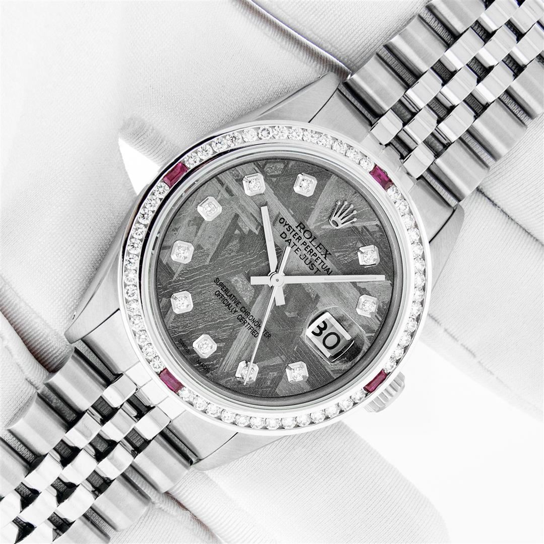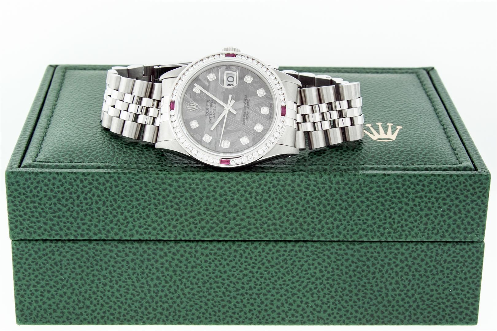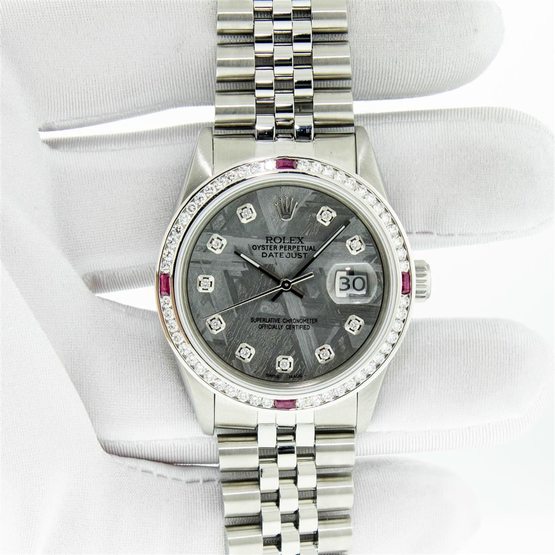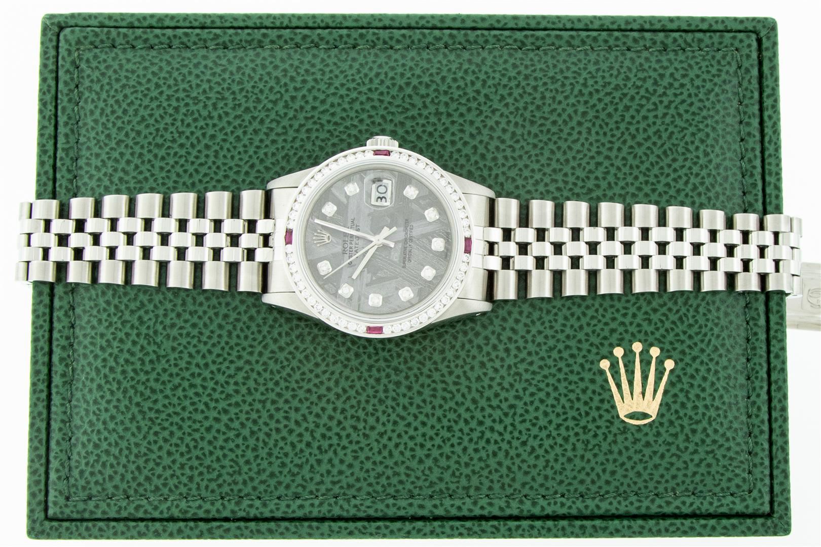 One Mens Stainless Steel Rolex Datejust Polished Bright with Satin Finish, This Watch Has Been Serviced & Electronically Tested, Rolex Stainless Steel Case: 36mm, Rolex Stainless Steel Crown, Custom Bezel: New 18K White Gold Ruby Channel Set Diamond Bezel, Diamond + Gem Count: 52 Diamonds + 4 Rubies, Total Weight 1.30 Carat, Clarity: SI-VS, Color: G to H. Custom Crystal: New Sapphire With Magnified Date Window. Custom Hands: New Luminescent Hands. Rolex Movement: Automatic Winding Movement. Custom Dial: Custom Meteorite Diamond Dial, Diamond Count: 10 Diamonds in Dial, Diamond Color: G To H In Color, Clarity: SI-VS. Date Window: 3 O'Clock Position Date Display, Quickset, Model: Datejust, Condition: G-6 Extra Fine. Rolex Bracelet: Stainless Steel Jubilee Band. Bracelet: 7.0 Inch Length, Adjustable. Standard Clasp, With Rolex Logo. This Pre Owned Watch Has Been Serviced Time Tested And Is In Excellent Condition It Is Free Of All Scratches And Dents. This Watch Comes With A Rolex Box.