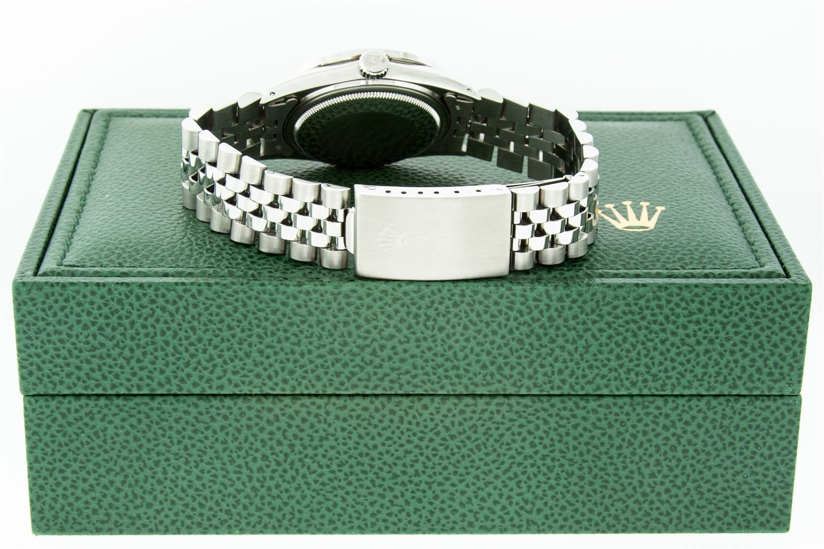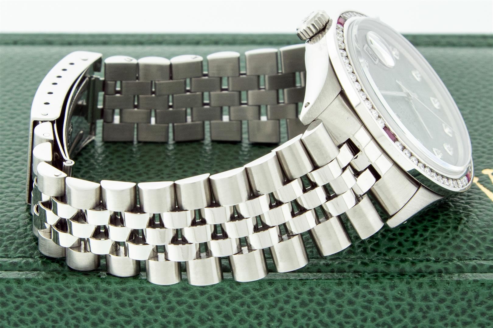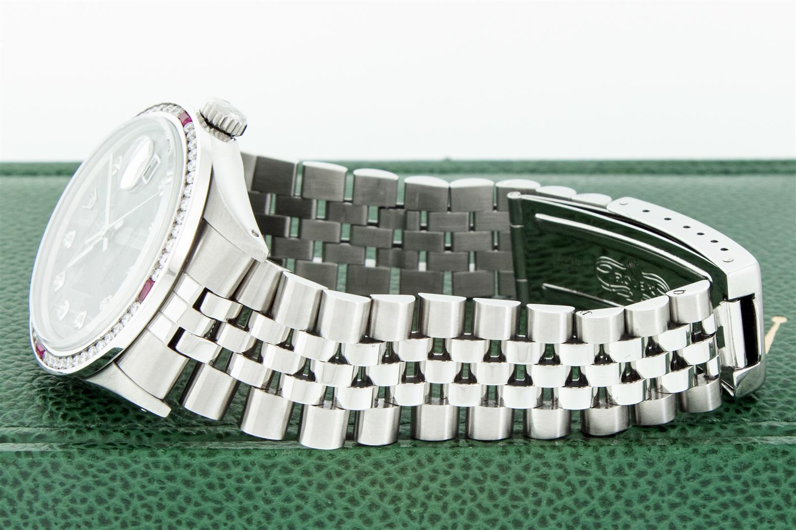 One Mens Stainless Steel Rolex Datejust Polished Bright with Satin Finish, This Watch Has Been Serviced & Electronically Tested, Rolex Stainless Steel Case: 36mm, Rolex Stainless Steel Crown, Custom Bezel: New 18K White Gold Ruby Channel Set Diamond Bezel, Diamond + Gem Count: 52 Diamonds + 4 Rubies, Total Weight 1.30 Carat, Clarity: SI-VS, Color: G to H. Custom Crystal: New Sapphire With Magnified Date Window. Custom Hands: New Luminescent Hands. Rolex Movement: Automatic Winding Movement. Custom Dial: Custom Meteorite Diamond Dial, Diamond Count: 10 Diamonds in Dial, Diamond Color: G To H In Color, Clarity: SI-VS. Date Window: 3 O'Clock Position Date Display, Quickset, Model: Datejust, Condition: G-6 Extra Fine. Rolex Bracelet: Stainless Steel Jubilee Band. Bracelet: 7.0 Inch Length, Adjustable. Standard Clasp, With Rolex Logo. This Pre Owned Watch Has Been Serviced Time Tested And Is In Excellent Condition It Is Free Of All Scratches And Dents. This Watch Comes With A Rolex Box.