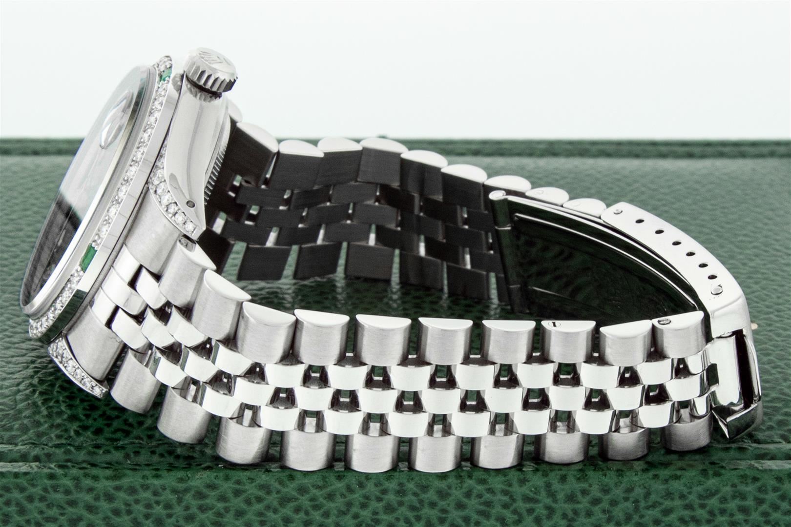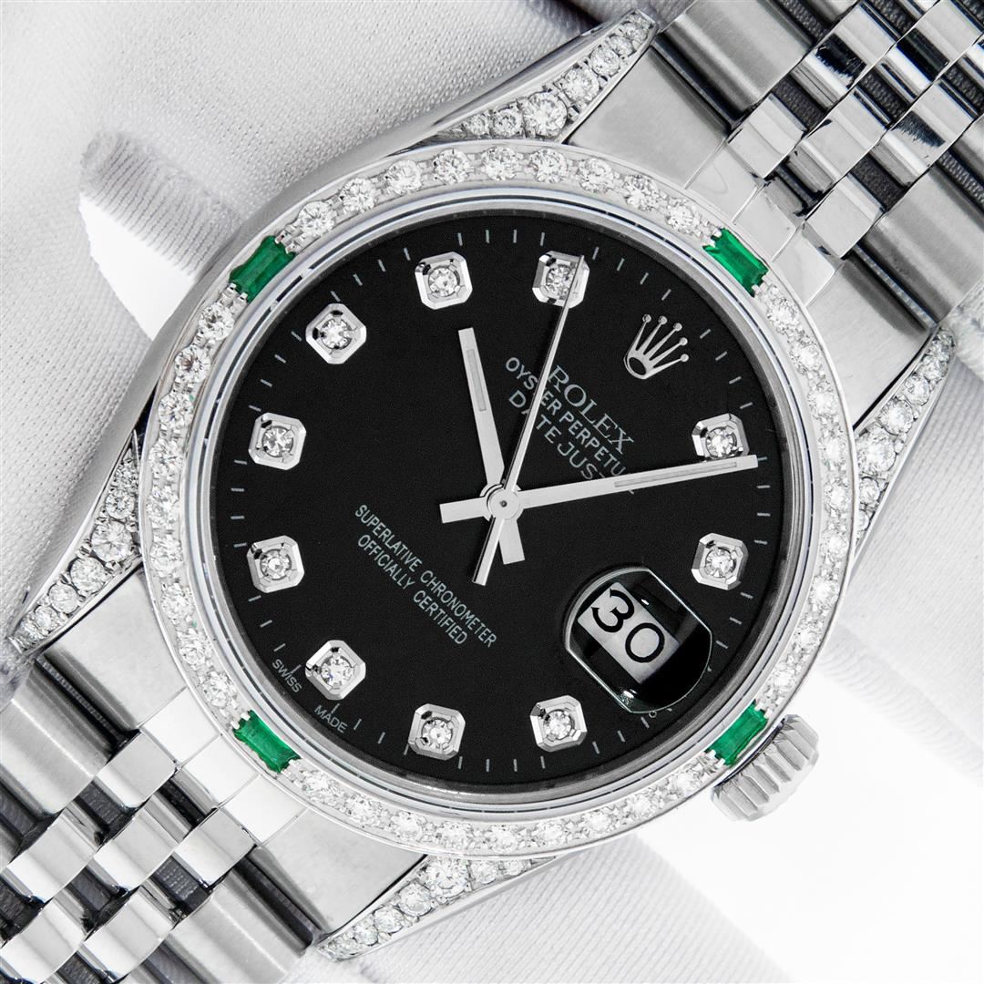One Men's Rolex Datejust Polished Bright with Satin Finish, Serviced & Electronically Tested, Rolex Stainless Steel Case: 36mm, Custom Diamond Lugs: 28 Diamonds In Lugs, Color: G to H, Clarity: SI-VS. Stainless Steel Crown, Custom Bezel: New 18K White Gold Diamond + Emerald Beadset, Diamond Count: 36 Diamonds + 4 Emeralds, Clarity: SI-VS, Color: G to H. Custom Crystal: New Sapphire with Magnified Date Window. Custom Hands: New Luminescent Hands. Rolex Movement: Automatic Winding Movement. Custom Dial: Refinished To Black with Custom Added Diamonds, Stone Count: 10 Diamonds, Diamond Color: G To H In Color, Clarity: SI-VS. Date Window: 3 O'Clock Position Date Display, Quickset, Model: Datejust Condition: G-6 Extra Fine. Rolex Bracelet: Stainless Steel Jubilee Band. Bright Polish & Satin Finish. 7.0 Inch Length, Adjustable. Standard Clasp, with Rolex Logo. This Pre Owned Watch Has Been Serviced And Polished And Its Free Of All Dents And Scratches. This Watch Comes with A Rolex Box.