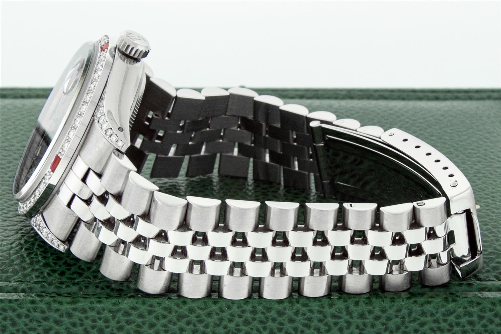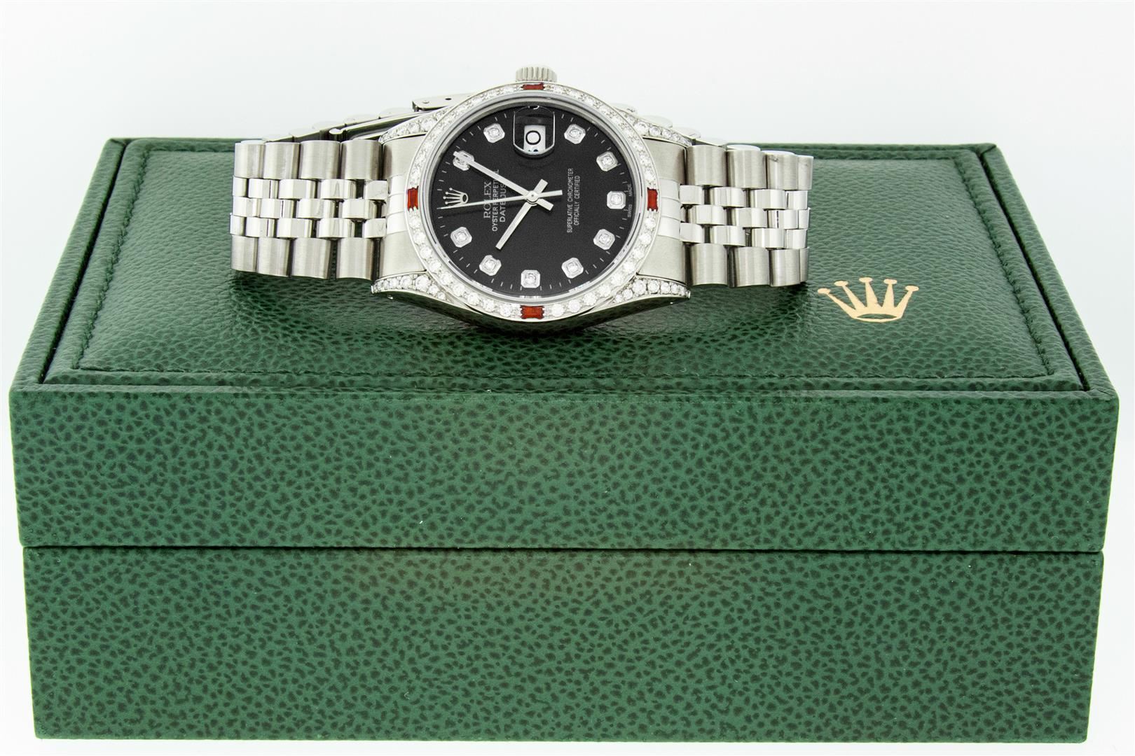One Men's Rolex Datejust Polished Bright with Satin Finish, Serviced & Electronically Tested, Rolex Stainless Steel Case: 36mm, Custom Diamond Lugs: 28 Diamonds In Lugs, Color: G to H, Clarity: SI-VS. Stainless Steel Crown, Custom Bezel: New 18K White Gold Diamond + Ruby Beadset, Diamond Count: 36 Diamonds + 4 Emeralds, Clarity: SI-VS, Color: G to H. Custom Crystal: New Sapphire with Magnified Date Window. Custom Hands: New Luminescent Hands. Rolex Movement: Automatic Winding Movement. Custom Dial: Refinished To Black with Custom Added Diamonds, Stone Count: 10 Diamonds, Diamond Color: G To H In Color, Clarity: SI-VS. Date Window: 3 O'Clock Position Date Display, Quickset, Model: Datejust Condition: G-6 Extra Fine. Rolex Bracelet: Stainless Steel Jubilee Band. Bright Polish & Satin Finish. 7.0 Inch Length, Adjustable. Standard Clasp, with Rolex Logo. This Pre Owned Watch Has Been Serviced And Polished And Its Free Of All Dents And Scratches. This Watch Comes with A Rolex Box.