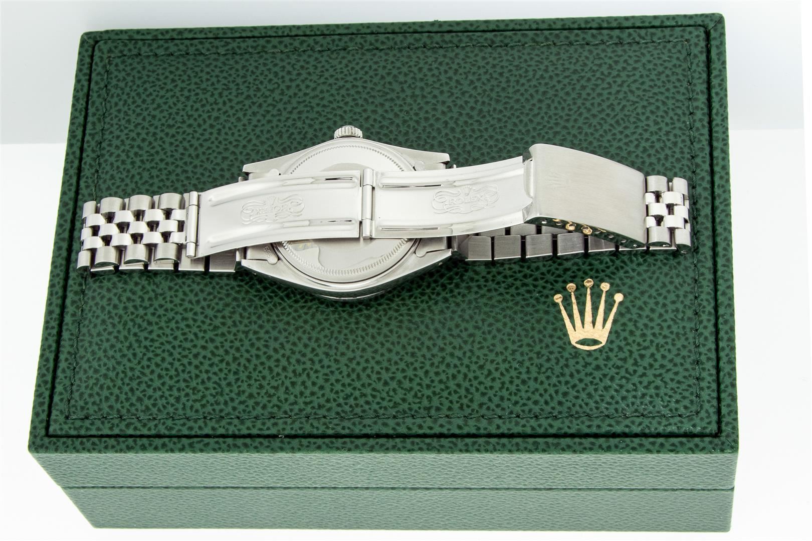 One Men's Rolex Datejust Polished Bright with Satin Finish, Serviced & Electronically Tested, Rolex Stainless Steel Case: 36mm, Custom Diamond Lugs: 28 Diamonds In Lugs, Color: G to H, Clarity: SI-VS. Stainless Steel Crown, Custom Bezel: New 18K White Gold Diamond + Ruby Beadset, Diamond Count: 36 Diamonds + 4 Emeralds, Clarity: SI-VS, Color: G to H. Custom Crystal: New Sapphire with Magnified Date Window. Custom Hands: New Luminescent Hands. Rolex Movement: Automatic Winding Movement. Custom Dial: Refinished To Black with Custom Added Diamonds, Stone Count: 10 Diamonds, Diamond Color: G To H In Color, Clarity: SI-VS. Date Window: 3 O'Clock Position Date Display, Quickset, Model: Datejust Condition: G-6 Extra Fine. Rolex Bracelet: Stainless Steel Jubilee Band. Bright Polish & Satin Finish. 7.0 Inch Length, Adjustable. Standard Clasp, with Rolex Logo. This Pre Owned Watch Has Been Serviced And Polished And Its Free Of All Dents And Scratches. This Watch Comes with A Rolex Box.