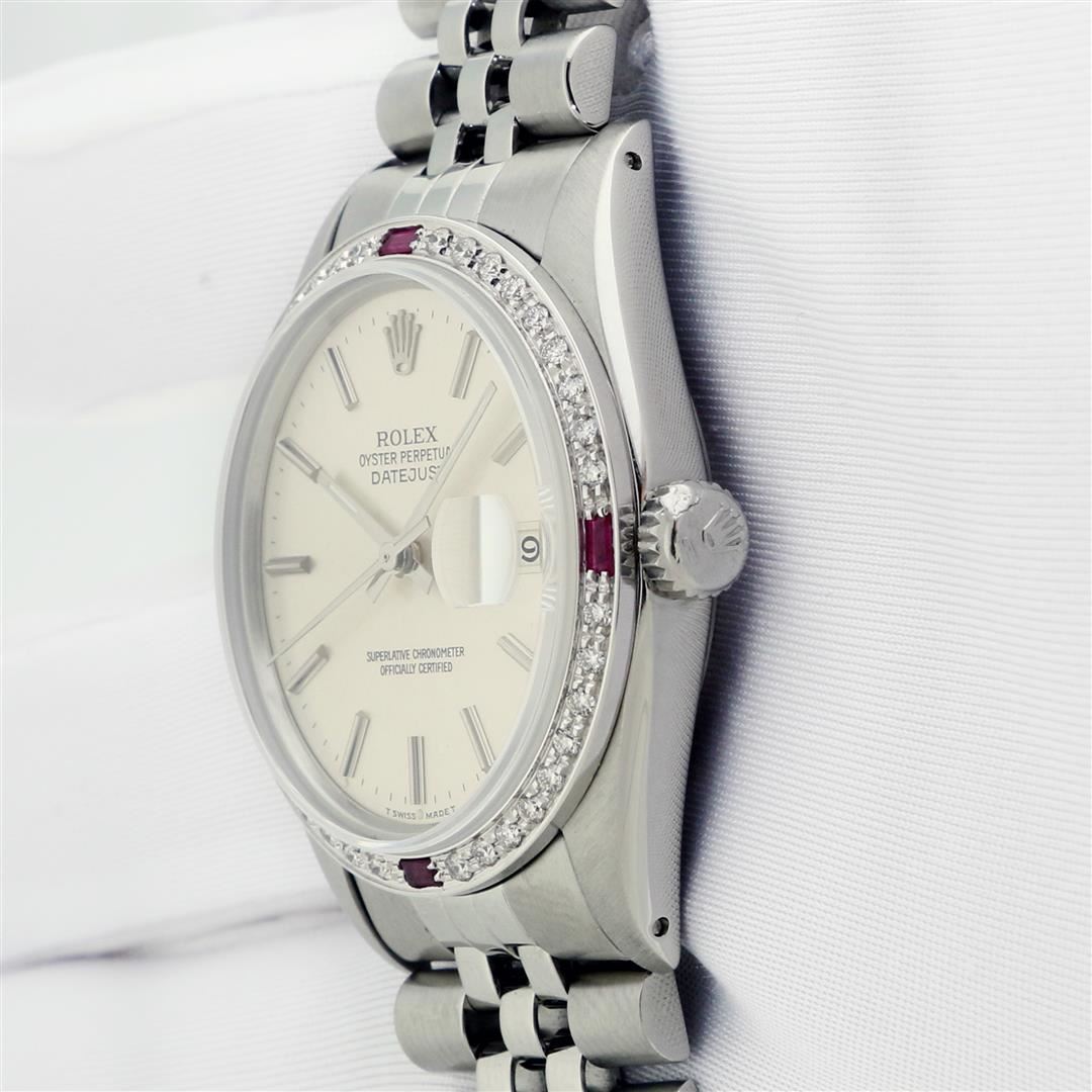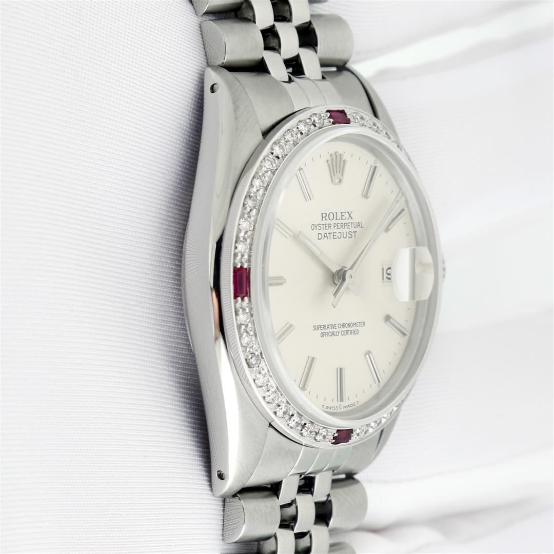 One Men's Rolex Datejust Polished Bright with Satin Finish, This Watch Has Been Serviced & Electronically Tested, Rolex Stainless Steel Case: 36mm, Rolex Stainless Steel Crown, Custom Bezel: New 18K White Gold Ruby Beadset Diamond Bezel, Diamond + Gem Count: 36 Diamonds + 4 Rubies, Clarity: SI-VS, Color: G to H. Custom Crystal: New Sapphire with Date Window. Custom Hands: New Luminescent Hands. Rolex Movement: Automatic Winding Movement. Rolex Dial: Silver Index Dial. Date Window: 3 O'Clock Position Date Display, Quickset, Model: Datejust, Condition: G-6 Extra Fine. Rolex Bracelet: Stainless Steel Jubilee Band. Bracelet: 7.0 Inch Length, Adjustable. Standard Clasp, with Rolex Logo. This Pre Owned Watch Has Been Serviced Time Tested And Is In Excellent Condition It Is Free Of All Scratches And Dents.