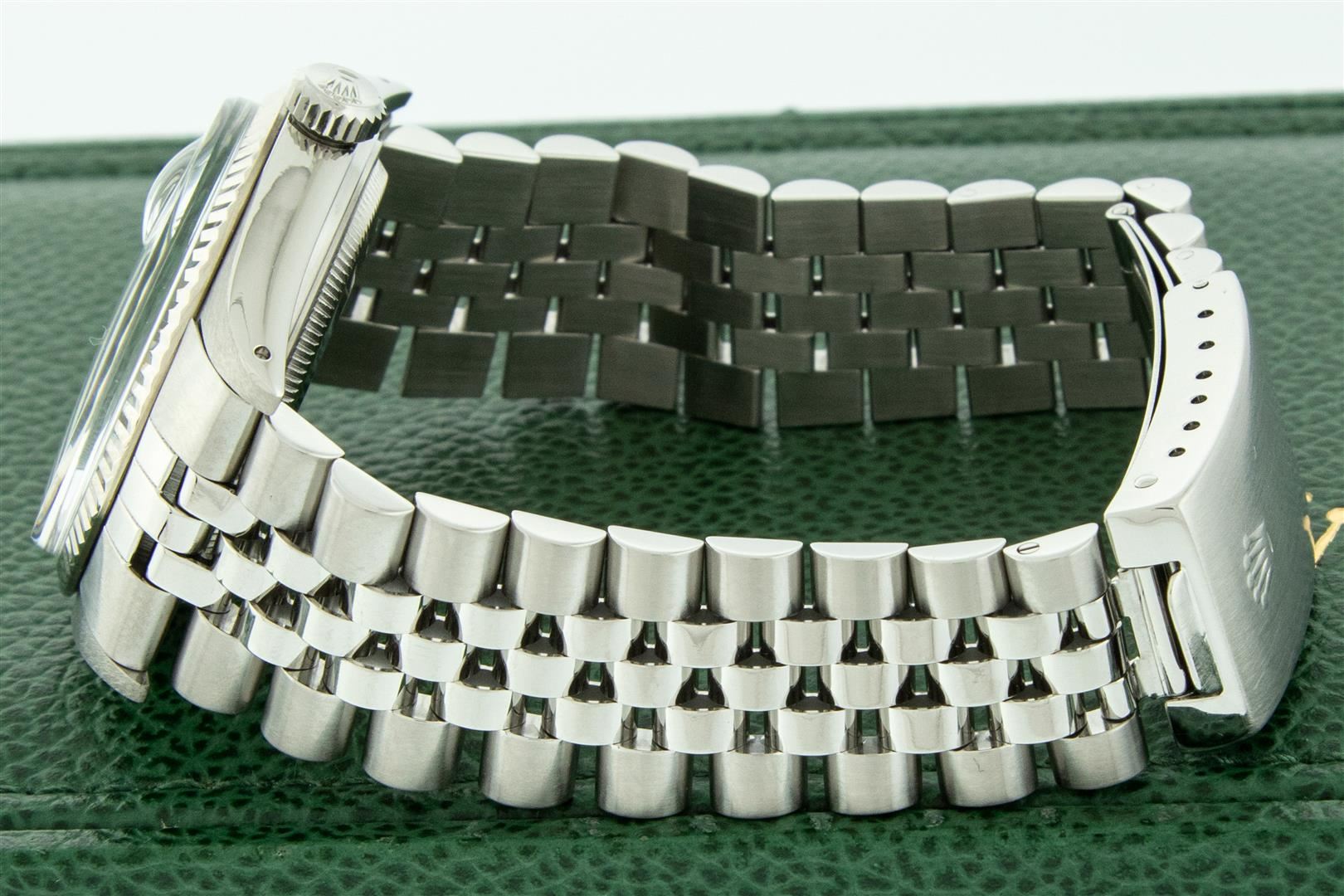 One Men's Pre Owned Stainless Steel Rolex Datejust Polished Bright with Satin Finish, Serviced & Electronically Tested, Rolex Stainless Steel Case: 36mm, Rolex Stainless Steel Crown, Rolex Bezel: 14K White Gold Fluted Bezel. Custom Crystal: New Acrylic Cyclops Lens. Custom Hands: New Luminescent Hands. Rolex Movement: Automatic Winding Movement. Custom Dial: Mother Of Pearl Ruby String Diamond Dial, Stone Count: 10 Rubies + 48 Diamonds in Dial, G To H In Color, SI-VS Clarity. Date Window: 3 O'Clock Position Date Display, Quickset, Model: Datejust, Condition: G-6 Extra Fine. Rolex Bracelet: Stainless Steel Jubilee. Bright Polish & Satin Finish. 7.0 Inch Length, Adjustable. Standard Clasp, with Rolex Logo. This Watch Has Been Serviced And Polished It Is Free Of All Scratches And Dents.