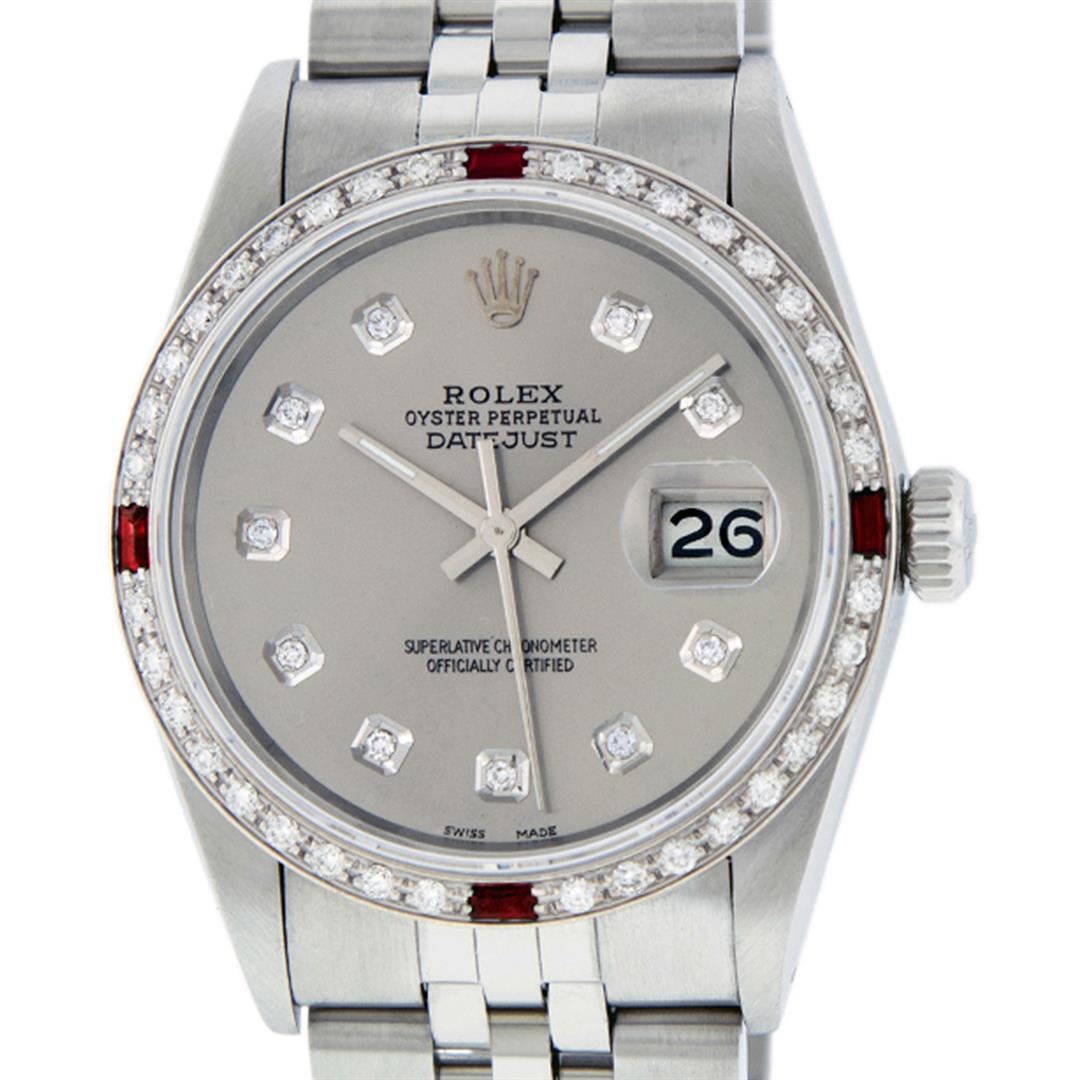 One Men's Stainless Steel Rolex Datejust Polished Bright with Satin Finish, This Watch Has Been Serviced & Electronically Tested, Stainless Steel Case: 36mm, Stainless Steel Crown, Custom Bezel: New 18K White Gold Ruby Beadset Diamond Bezel, Diamond + Gem Count: 36 Diamonds + 4 Rubies, Total Weight 1.00 Carat, Clarity: SI-VS, Color: G to H. Custom Crystal: New Synthetic Sapphire Cyclops Lens. Custom Hands: New Luminescent Hands. Movement: Automatic Winding Movement Caliber 3035. Custom Dial: Slate Grey With Diamond Hour Markers, Diamond Count: 10 Diamonds in Dial, Diamond Color: G To H In Color, Clarity: SI-VS. Date Window: 3 O'clock Position Date Display, Quickset, Model: Datejust, Condition: G-6 Extra Fine. Bracelet: Stainless Steel Jubilee. Bracelet: 7.0 Inch Length, Adjustable. Standard Clasp, With Rolex Logo. This Watch Has Been Serviced Time Tested And Is In Excellent Condition It Is Free Of All Scratches And Dents.