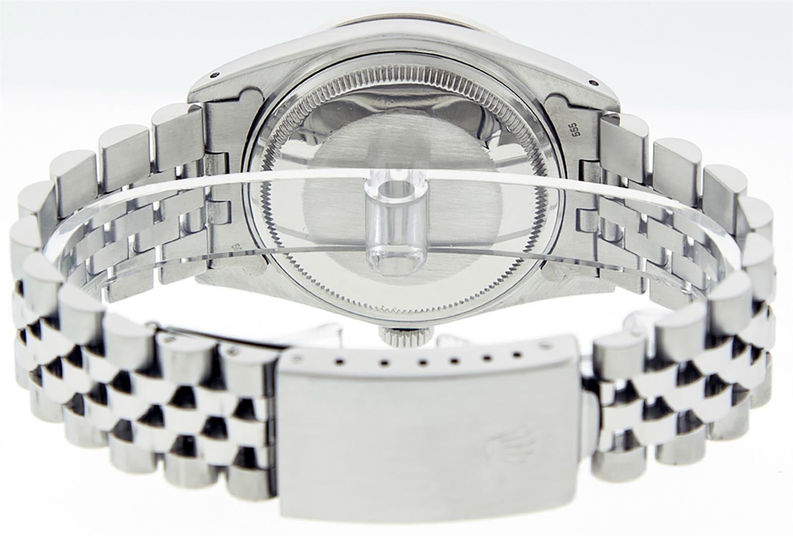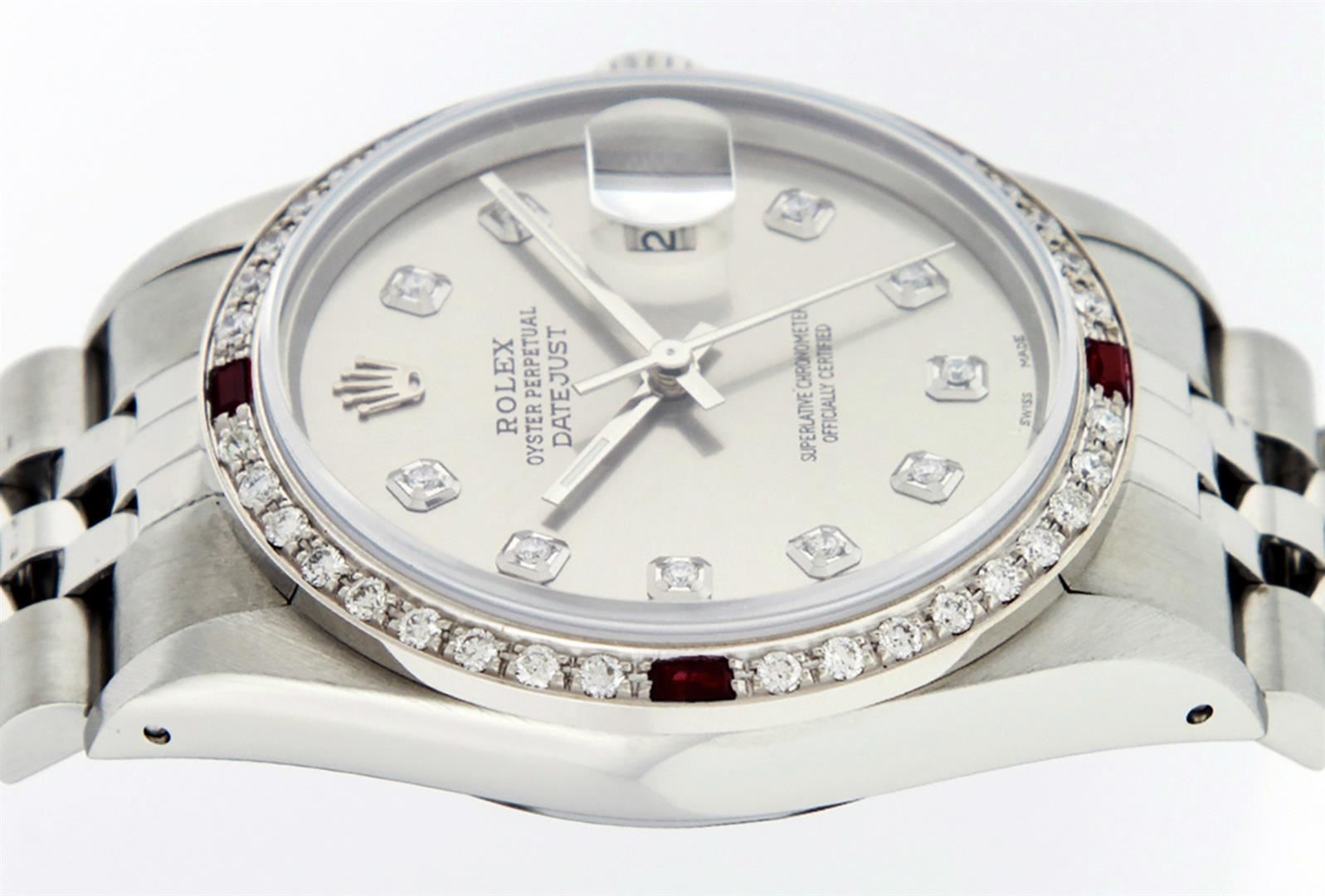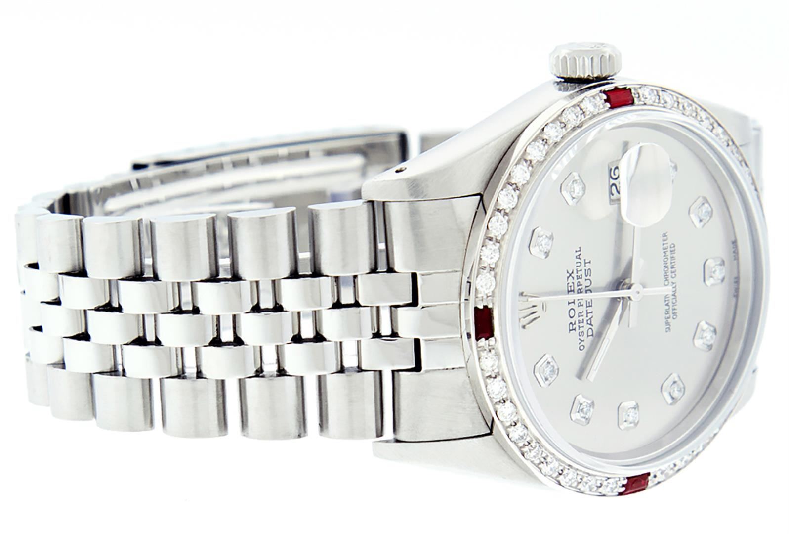 One Men's Stainless Steel Rolex Datejust Polished Bright with Satin Finish, This Watch Has Been Serviced & Electronically Tested, Stainless Steel Case: 36mm, Stainless Steel Crown, Custom Bezel: New 18K White Gold Ruby Beadset Diamond Bezel, Diamond + Gem Count:  36 Diamonds + 4 Rubies, Total Weight 1.00 Carat, Clarity: SI-VS, Color: G to H. Custom Crystal: New Synthetic Sapphire Cyclops Lens. Custom Hands: New Luminescent Hands. Movement: Automatic Winding Movement Caliber 3035. Custom Dial: Slate Grey With Diamond Hour Markers, Diamond Count: 10 Diamonds in Dial, Diamond Color: G To H In Color, Clarity: SI-VS. Date Window: 3 O'clock Position Date Display, Quickset, Model: Datejust, Condition: G-6 Extra Fine. Bracelet: Stainless Steel Jubilee. Bracelet: 7.0 Inch Length, Adjustable. Standard Clasp, With Rolex Logo. This Watch Has Been Serviced Time Tested And Is In Excellent Condition It Is Free Of All Scratches And Dents.