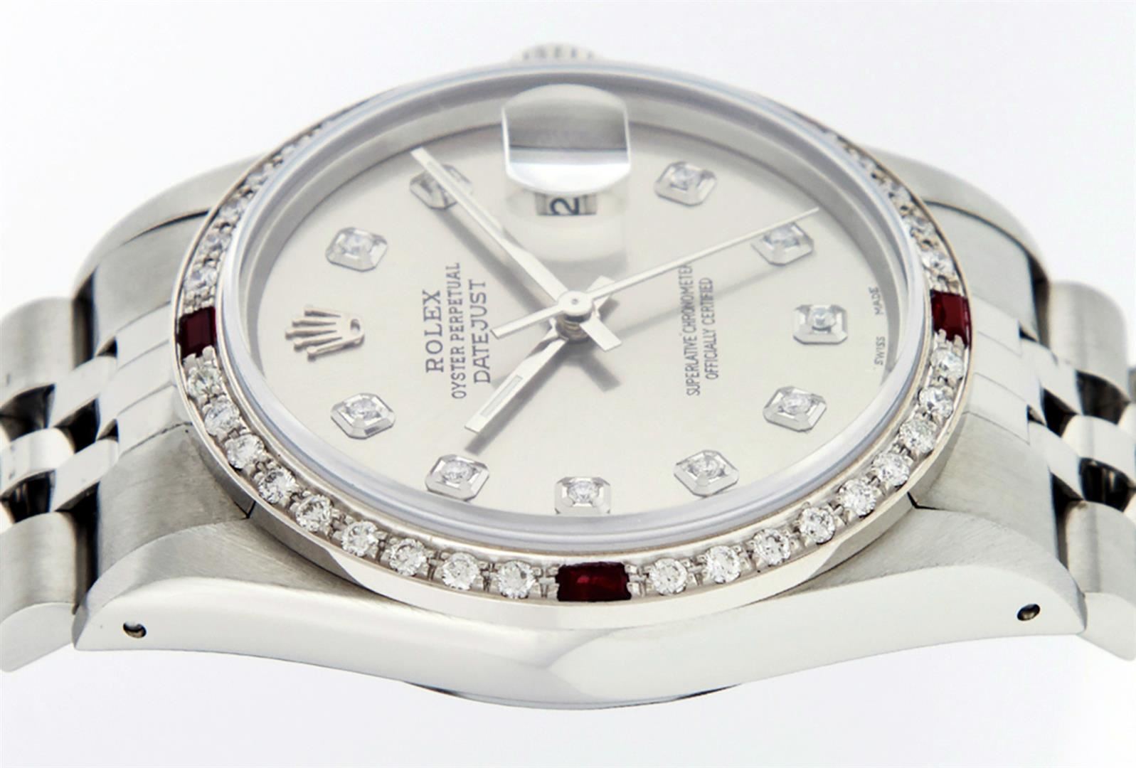 One Men's Stainless Steel Rolex Datejust Polished Bright with Satin Finish, This Watch Has Been Serviced & Electronically Tested, Stainless Steel Case: 36mm, Stainless Steel Crown, Custom Bezel: New 18K White Gold Ruby Beadset Diamond Bezel, Diamond + Gem Count: 36 Diamonds + 4 Rubies, Total Weight 1.00 Carat, Clarity: SI-VS, Color: G to H. Custom Crystal: New Synthetic Sapphire Cyclops Lens. Custom Hands: New Luminescent Hands. Movement: Automatic Winding Movement. Custom Dial: Slate Grey With Diamond Hour Markers, Diamond Count: 10 Diamonds in Dial, Diamond Color: G To H In Color, Clarity: SI-VS. Date Window: 3 O'Clock Position Date Display, Quickset, Model: Datejust, Condition: G-6 Extra Fine. Bracelet: Stainless Steel Jubilee. Bracelet: 7.0 Inch Length, Adjustable. Standard Clasp, With Rolex Logo. This Watch Has Been Serviced Time Tested And Is In Excellent Condition It Is Free Of All Scratches And Dents.