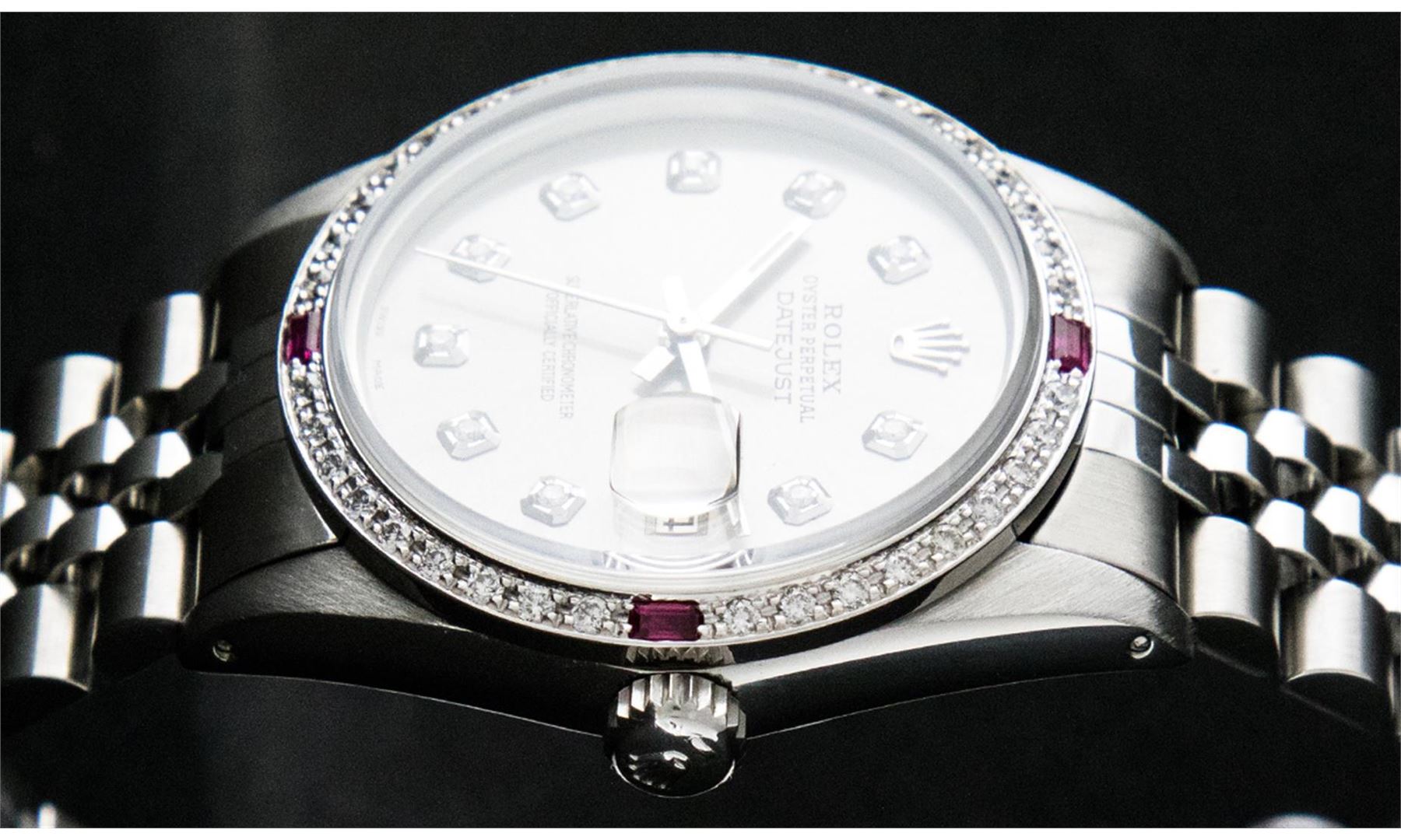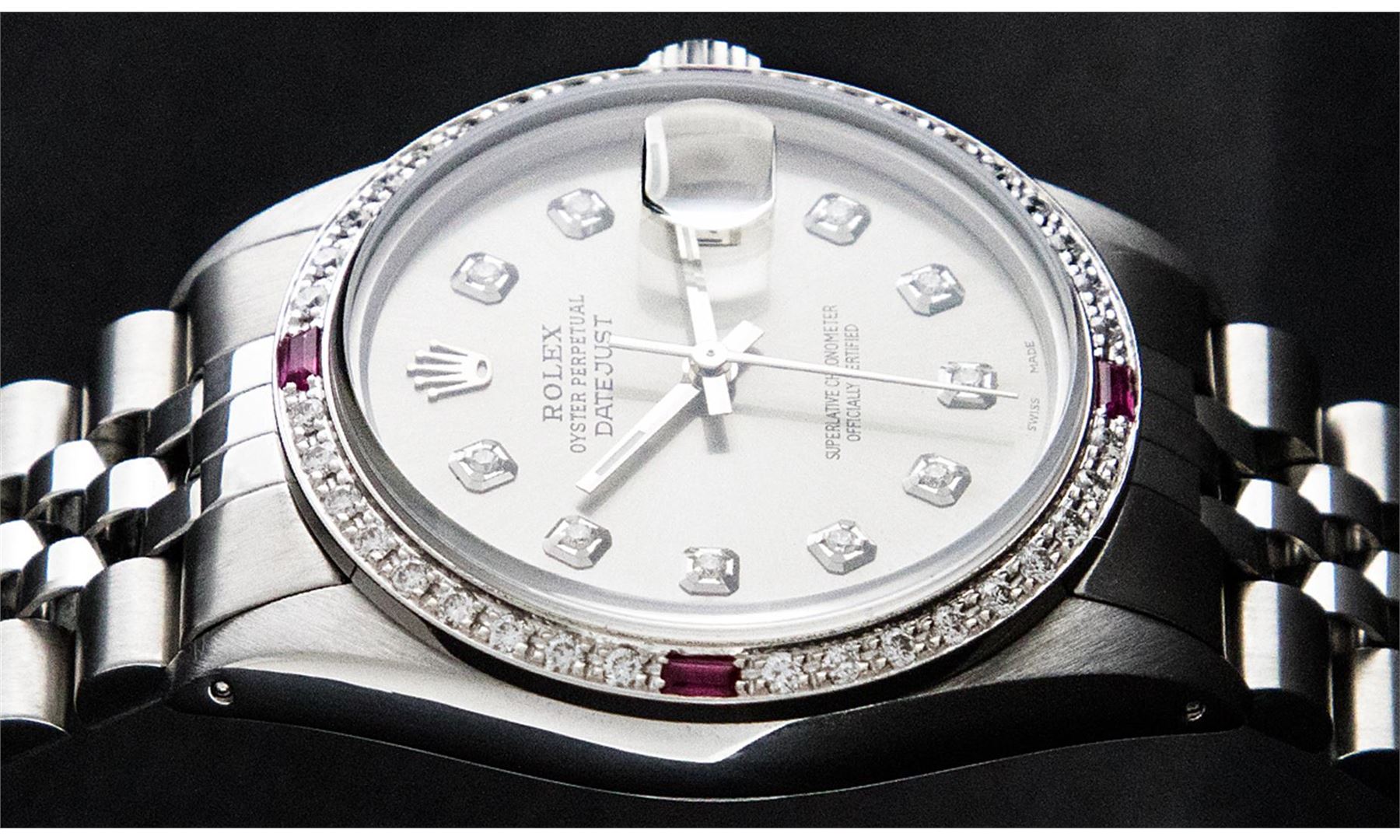 One Men's Stainless Steel Rolex Datejust Polished Bright with Satin Finish, This Watch Has Been Serviced & Electronically Tested, Stainless Steel Case: 36mm, Stainless Steel Crown, Custom Bezel: New 18K White Gold Ruby Beadset Diamond Bezel, Diamond + Gem Count: 36 Diamonds + 4 Rubies, Total Weight 1.00 Carat, Clarity: SI-VS, Color: G to H. Custom Crystal: New Synthetic Sapphire Cyclops Lens. Custom Hands: New Luminescent Hands. Movement: Automatic Winding Movement. Custom Dial: Slate Grey With Diamond Hour Markers, Diamond Count: 10 Diamonds in Dial, Diamond Color: G To H In Color, Clarity: SI-VS. Date Window: 3 O'clock Position Date Display, Quickset, Model: Datejust, Condition: G-6 Extra Fine. Bracelet: Stainless Steel Jubilee. Bracelet: 7.0 Inch Length, Adjustable. Standard Clasp, With Rolex Logo. This Watch Has Been Serviced Time Tested And Is In Excellent Condition It Is Free Of All Scratches And Dents.