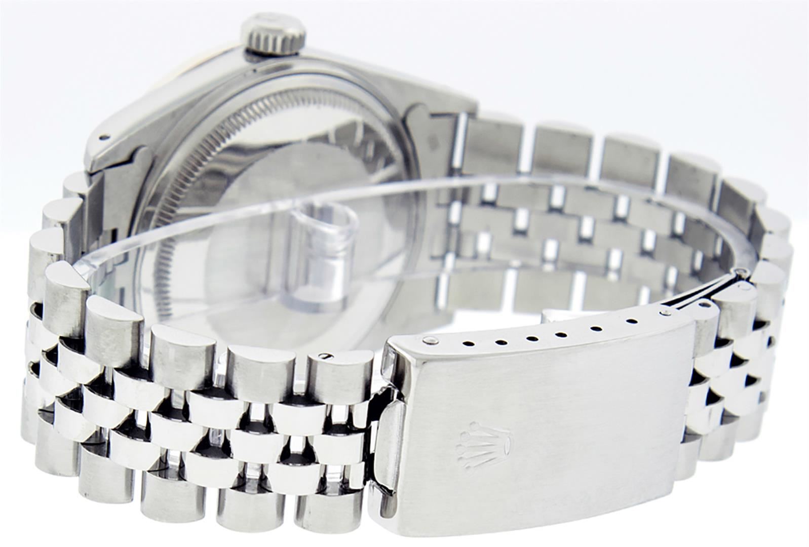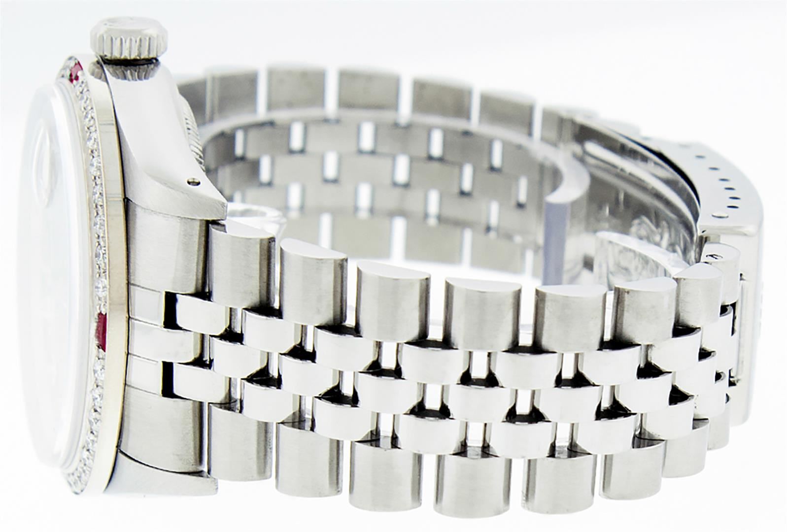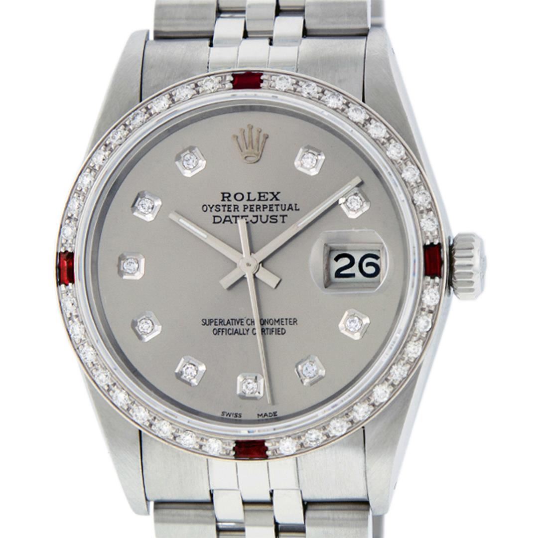 One Men's Stainless Steel Rolex Datejust Polished Bright with Satin Finish, This Watch Has Been Serviced & Electronically Tested, Stainless Steel Case: 36mm, Stainless Steel Crown, Custom Bezel: New 18K White Gold Ruby Beadset Diamond Bezel, Diamond + Gem Count: 36 Diamonds + 4 Rubies, Total Weight 1.00 Carat, Clarity: SI-VS, Color: G to H. Custom Crystal: New Synthetic Sapphire Cyclops Lens. Custom Hands: New Luminescent Hands. Movement: Automatic Winding Movement. Custom Dial: Slate Grey With Diamond Hour Markers, Diamond Count: 10 Diamonds in Dial, Diamond Color: G To H In Color, Clarity: SI-VS. Date Window: 3 O'Clock Position Date Display, Quickset, Model: Datejust, Condition: G-6 Extra Fine. Bracelet: Stainless Steel Jubilee. Bracelet: 7.0 Inch Length, Adjustable. Standard Clasp, With Rolex Logo. This Watch Has Been Serviced Time Tested And Is In Excellent Condition It Is Free Of All Scratches And Dents.
