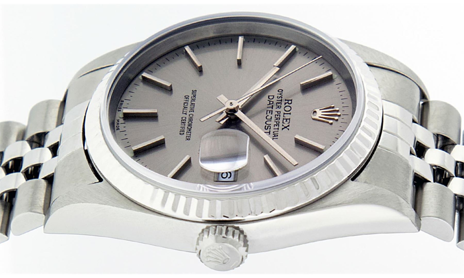 One Men's Rolex Quickset Stainless Steel Datejust Polished Bright with Satin Finish, Serviced & Electronically Tested, Rolex Stainless Steel Case: 36mm, Rolex Stainless Steel Crown, Rolex Bezel: 14K White Gold Fluted Bezel. Crystal: Sapphire With Magnified Date Window. Hands: Solid Hands. Rolex Movement: Automatic Winding Movement Caliber 3135. Custom Dial: Refinished To Gray With Index Hour Markers Dash Track And Lumi Dots. Date Window: 3 O'Clock Position Date Display, Quickset, Model: Quickset Datejust. Condition: G-6 Extra Fine. Rolex Bracelet: Stainless Steel Jubilee Band. Bright Polish & Satin Finish. 7.0 Inch Length, Adjustable. Standard Clasp, With Rolex Logo. This Pre Owned Watch Has Been Serviced Time Tested And Is In Excellent Condition It Is Free Of All Scratches And Dents.