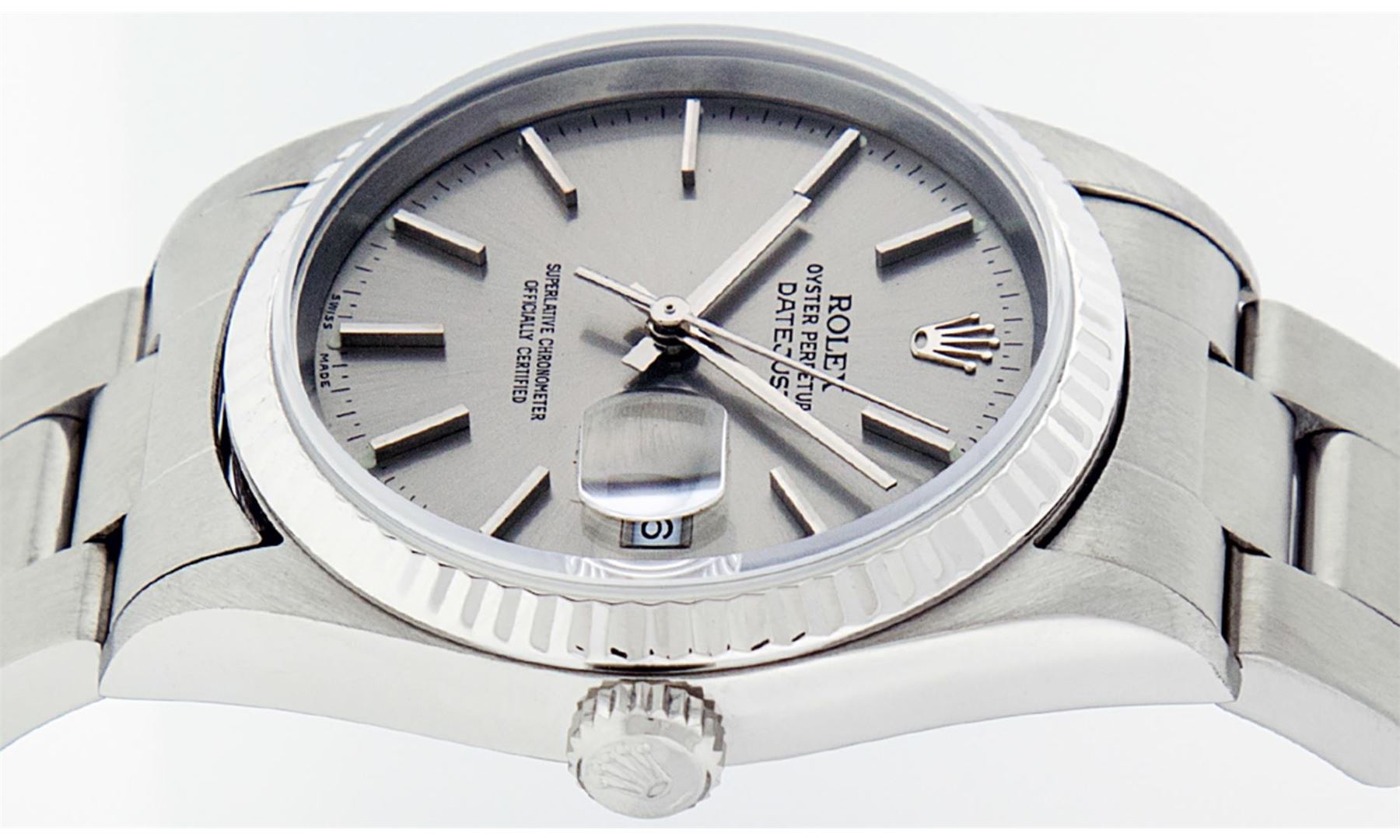 One Men's Rolex Quickset Stainless Steel Datejust Polished Bright with Satin Finish, Serviced & Electronically Tested, Rolex Stainless Steel Case: 36mm, Rolex Stainless Steel Crown, Rolex Bezel: 14K White Gold Fluted Bezel. Crystal: Sapphire With Magnified Date Window. Custom Hands: New Solid Hands. Rolex Movement: Automatic Winding Movement Caliber 3135. Custom Dial: Refinished To Gray With Index Hour Markers Dash Track And Lumi Dots. Date Window: 3 O'Clock Position Date Display, Quickset, Model: Quickset Datejust. Condition: G-6 Extra Fine. Rolex Bracelet: Stainless Steel Oyster Band. Bright Polish & Satin Finish. 7.0 Inch Length, Adjustable. Standard Clasp, With Rolex Logo. This Pre Owned Watch Has Been Serviced Time Tested And Is In Excellent Condition It Is Free Of All Scratches And Dents.