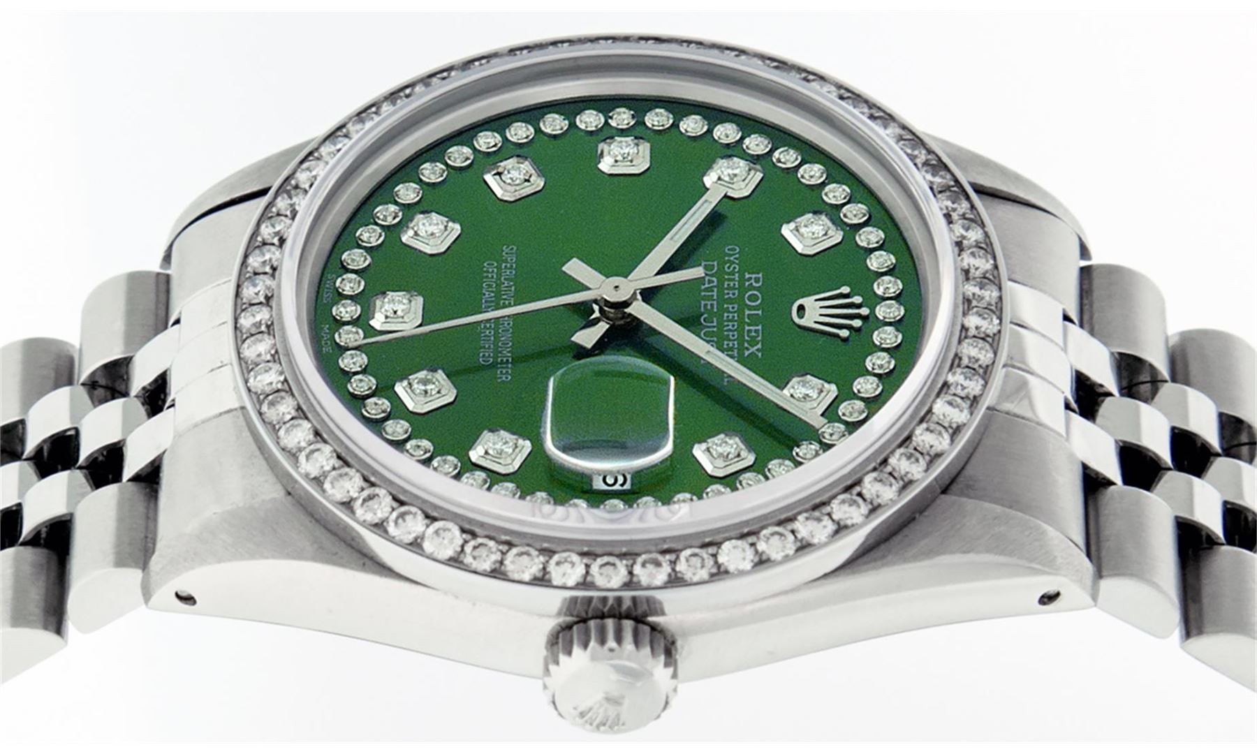 One Men's Rolex Stainless Steel Datejust Polished Bright with Satin Finish, This Watch Has Been Serviced & Electronically Tested, Stainless Steel Case: 36mm, Stainless Steel Crown, Custom Bezel: New Stainless Steel Beadset Diamond Bezel, Diamond Count: 54 Diamonds, Total Weight 1.00 Carat, Clarity: SI-VS, Color: G to H. Custom Crystal: New Synthetic Sapphire Cyclops Lens. Custom Hands: New Luminescent Hands. Movement: Automatic Winding Movement Caliber 3035. Custom Dial: Green String Diamond Dial, Diamond Count: 58 Diamonds In Dial, Color: G to H, Clarity: VS2-SI1. Date Window: 3 O'Clock Position Date Display, Quickset, Model: Datejust. Condition: G-6 Extra Fine. Bracelet: Stainless Steel Jubilee Band. Bright Polish & Satin Finish. 7.0 Inch Length, Adjustable. Standard Clasp, With Rolex Logo. This Watch Has Been Serviced Time Tested And Is In Excellent Condition It Is Free Of All Scratches And Dents.