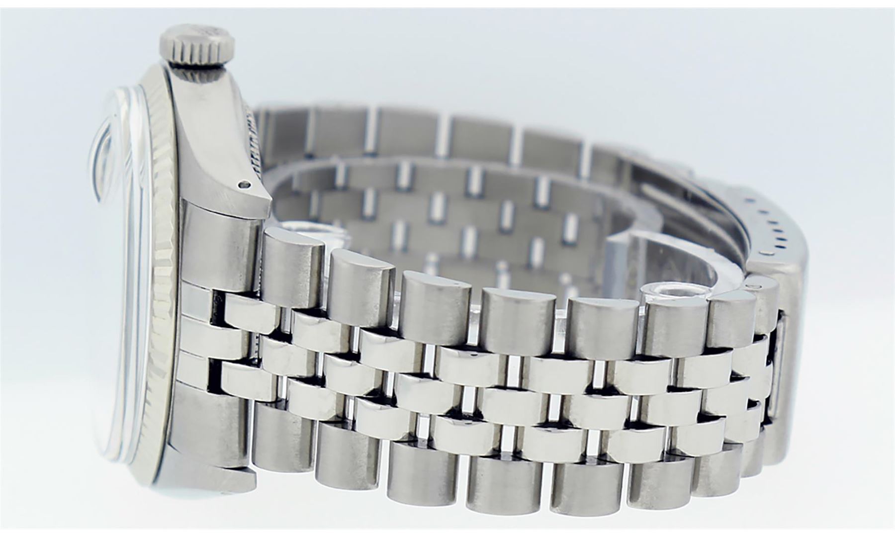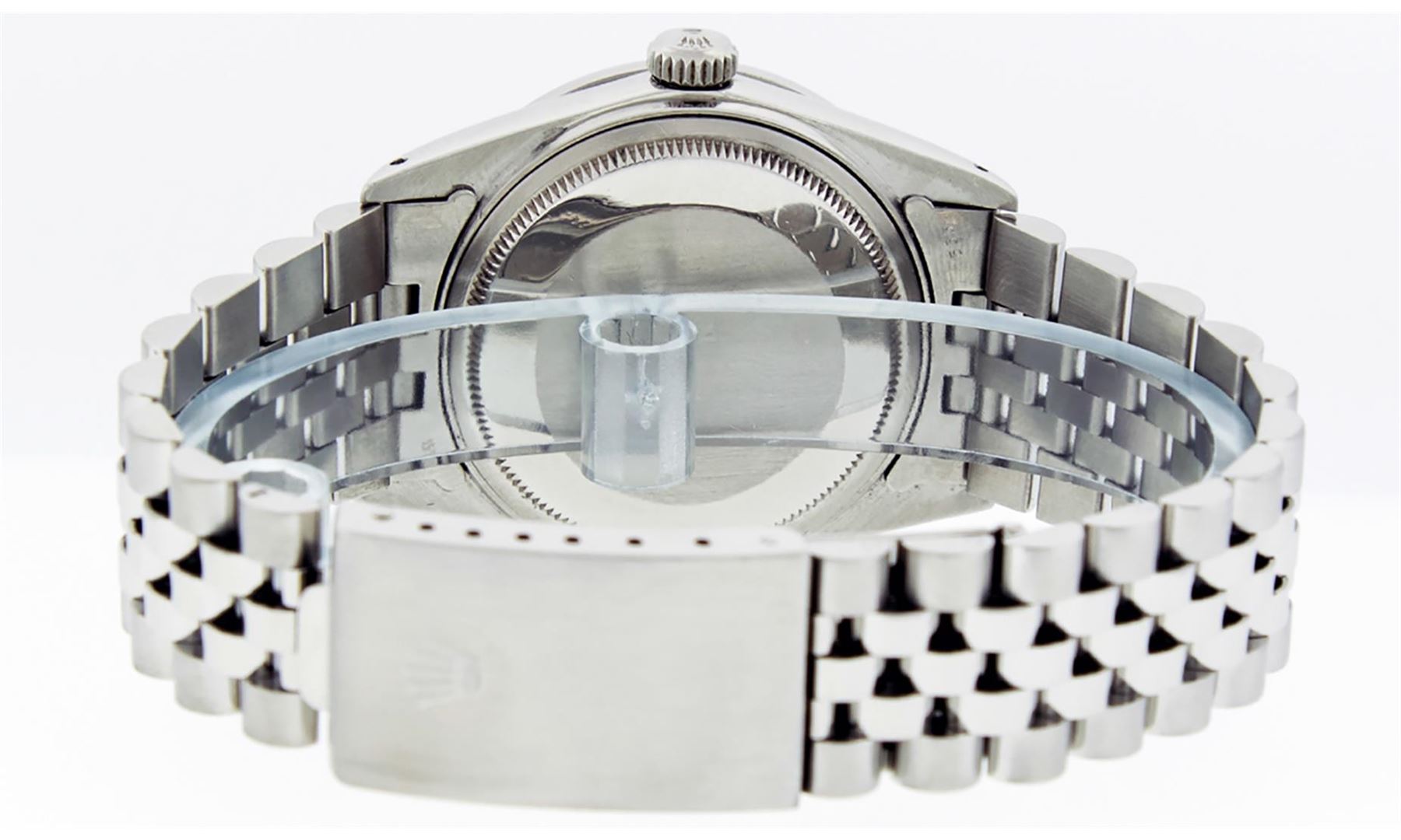 One Men's Stainless Steel Rolex Datejust Polished Bright with Satin Finish, This Watch Has Been Serviced & Electronically Tested, Stainless Steel Case: 36mm, Stainless Steel Crown, Bezel: White Gold Fluted Bezel. Custom Crystal: New Acrylic Cyclops Lens. Custom Hands: New Luminescent Hands. Movement: Automatic Winding Movement.. Custom Dial: Ice Blue Diamond Dial With Diamond Hour Markers, Diamond Count: 10 Diamonds in Dial Color: G To H In Color, SI-VS Clarity. Date Window: 3 O'clock Position Date Display, Quickset, Model: Datejust, Condition: G-6 Extra Fine. Bracelet: Stainless Steel Jubilee. Bright Polish & Satin Finish. 7.0 Inch Length, Adjustable. Standard Clasp, With Rolex Logo. This Watch Has Been Serviced Time Tested And Is In Excellent Condition It Is Free Of All Scratches And Dents