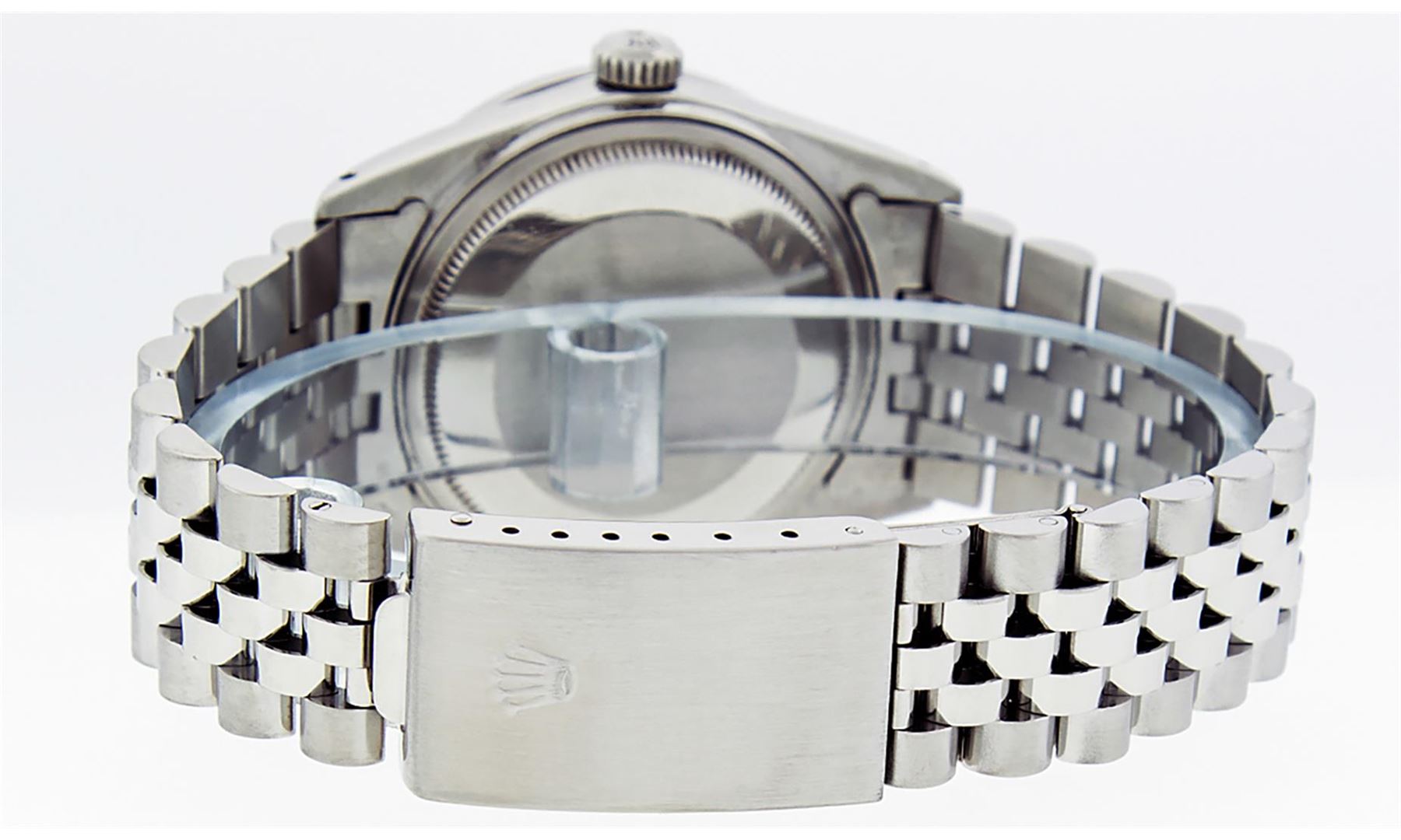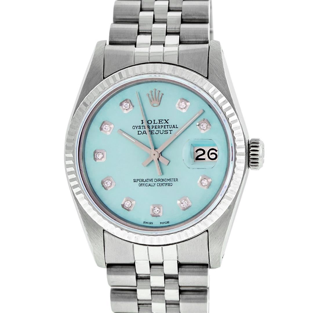 One Men's Stainless Steel Rolex Datejust Polished Bright with Satin Finish, This Watch Has Been Serviced & Electronically Tested, Stainless Steel Case: 36mm, Stainless Steel Crown, Bezel: White Gold Fluted Bezel. Custom Crystal: New Acrylic Cyclops Lens. Custom Hands: New Luminescent Hands. Movement: Automatic Winding Movement.. Custom Dial: Ice Blue Diamond Dial With Diamond Hour Markers, Diamond Count: 10 Diamonds in Dial Color: G To H In Color, SI-VS Clarity. Date Window: 3 O'clock Position Date Display, Quickset, Model: Datejust, Condition: G-6 Extra Fine. Bracelet: Stainless Steel Jubilee. Bright Polish & Satin Finish. 7.0 Inch Length, Adjustable. Standard Clasp, With Rolex Logo. This Watch Has Been Serviced Time Tested And Is In Excellent Condition It Is Free Of All Scratches And Dents