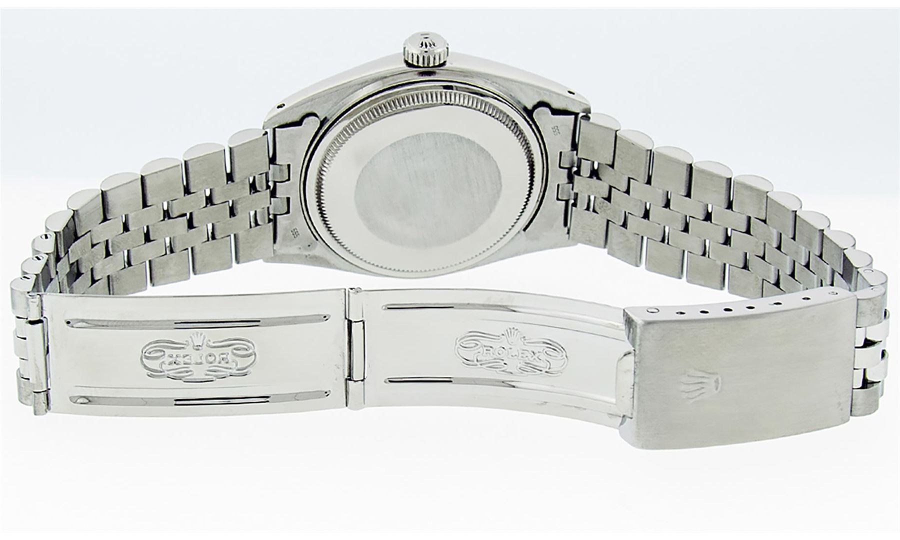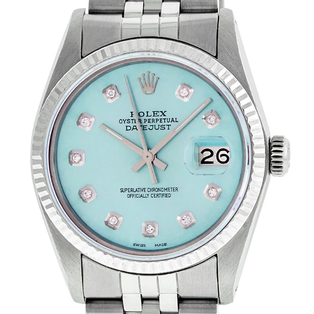 One Men's Stainless Steel Rolex Datejust Polished Bright with Satin Finish, This Watch Has Been Serviced & Electronically Tested, Stainless Steel Case: 36mm, Stainless Steel Crown, Bezel: White Gold Fluted Bezel. Custom Crystal: New Acrylic Cyclops Lens. Custom Hands: New Luminescent Hands. Movement: Automatic Winding Movement.. Custom Dial: Ice Blue Diamond Dial With Diamond Hour Markers, Diamond Count: 10 Diamonds in Dial Color: G To H In Color, SI-VS Clarity. Date Window: 3 O'clock Position Date Display, Quickset, Model: Datejust, Condition: G-6 Extra Fine. Bracelet: Stainless Steel Jubilee. Bright Polish & Satin Finish. 7.0 Inch Length, Adjustable. Standard Clasp, With Rolex Logo. This Watch Has Been Serviced Time Tested And Is In Excellent Condition It Is Free Of All Scratches And Dents