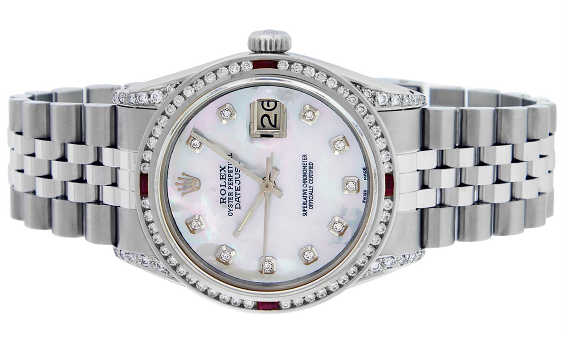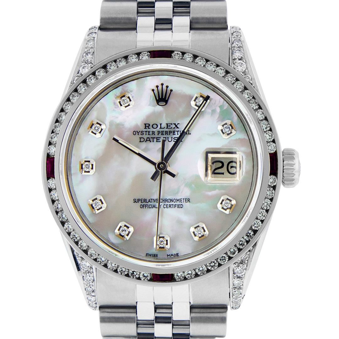 One Men's Rolex Datejust Polished Bright with Satin Finish, Serviced & Electronically Tested, Stainless Steel Case: 36mm, Custom Diamond Lugs: 28 Diamonds In Lugs, Color: G to H, Clarity: SI-VS. Stainless Steel Crown, Custom Bezel: New 18K White Gold Ruby Channel Set Diamond Bezel, Diamond + Gem Count: 52 Diamonds + 4 Rubies, Total Weight 1.30 Carat, Clarity: SI-VS, Color: G to H. Custom Crystal: New Scratch Resistant Synthetic Sapphire Cyclops Lens. Custom Hands: New Luminescent Hands. Movement: Automatic Winding Movement. Custom Dial: Mother Of Pearl Diamond Dial, Diamond Count: 10 Diamonds In Dial, Diamond Color: G To H In Color, Clarity: SI-VS. Date Window: 3 O'clock Position Date Display, Quickset, Model: Datejust Condition: G-6 Extra Fine. Bracelet: Stainless Steel Jubilee Band. Bright Polish & Satin Finish. 7.0 Inch Length, Adjustable. Standard Clasp, With Rolex Logo. This Watch Has Been Serviced And Polished And Its Free Of All Dents And Scratches.