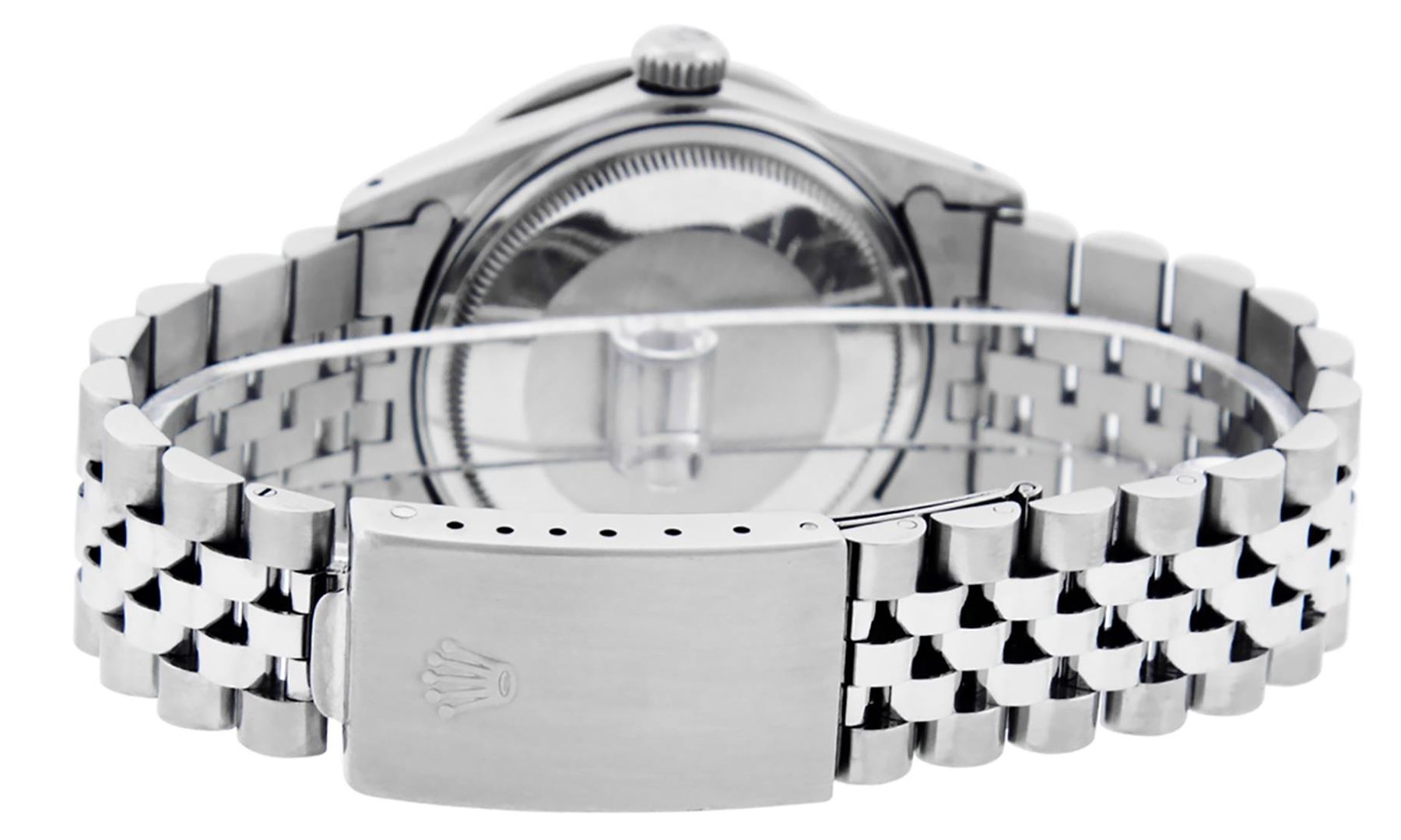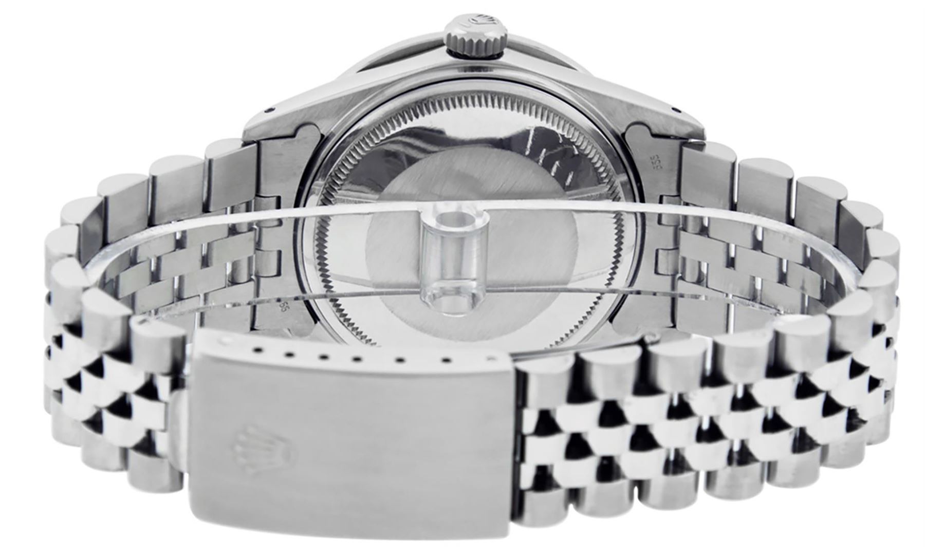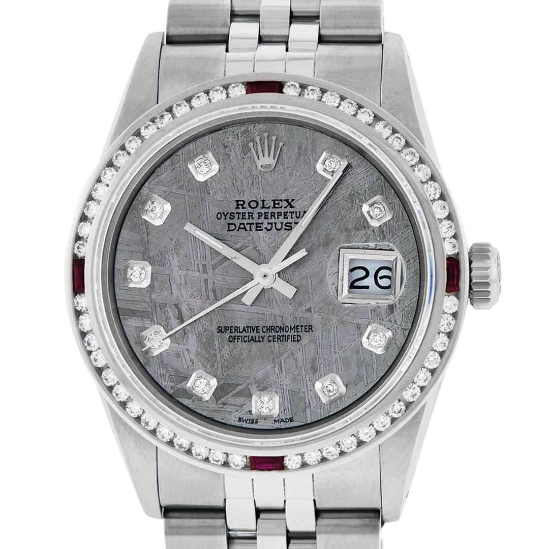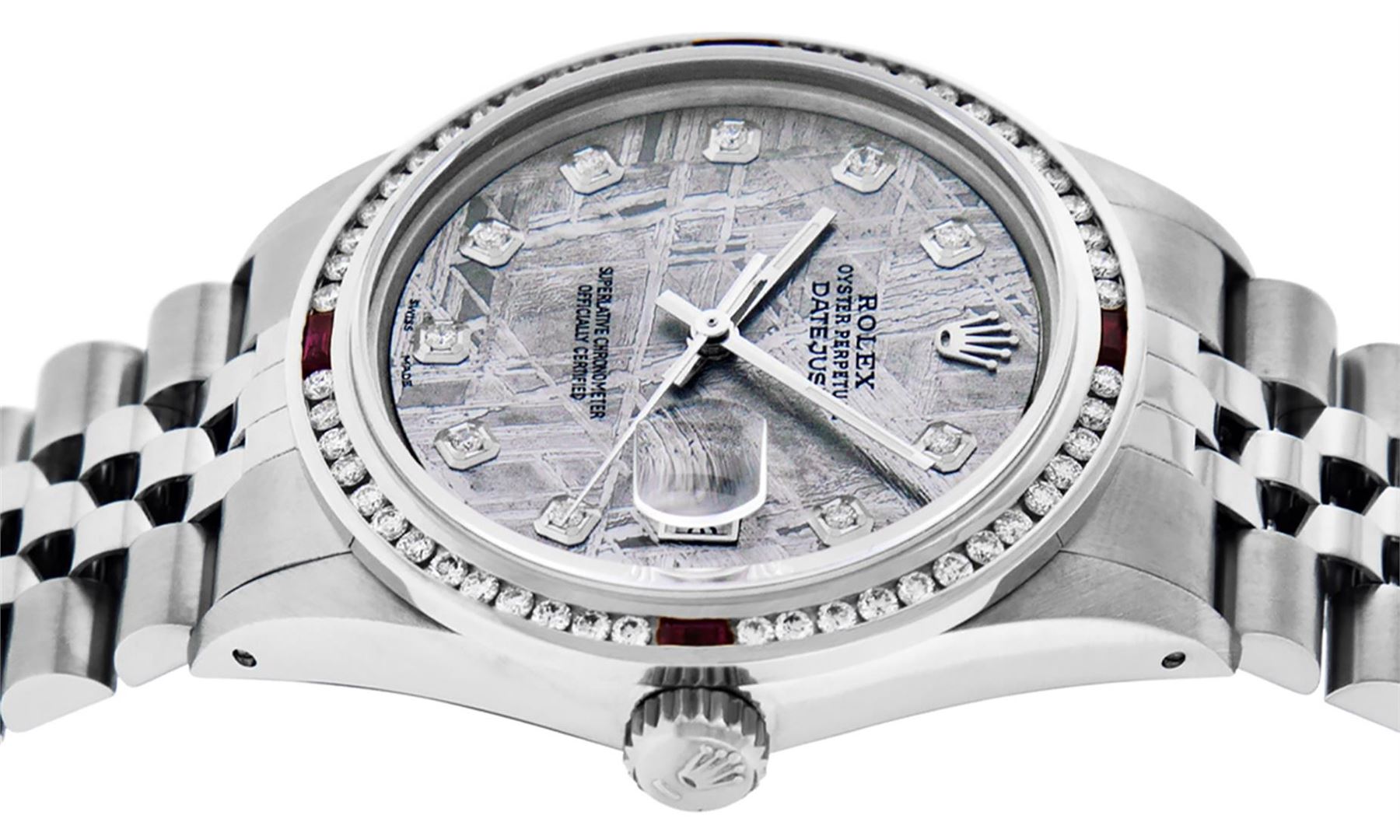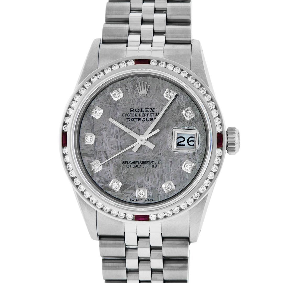 One Men's Stainless Steel Rolex Datejust Polished Bright with Satin Finish, This Watch Has Been Serviced & Electronically Tested, Stainless Steel Case: 36mm, Stainless Steel Crown, Custom Bezel: New 18K White Gold Ruby Channel Set Diamond Bezel, Diamond + Gem Count: 52 Diamonds + 4 Rubies, Total Weight 1.30 Carat, Clarity: SI-VS, Color: G to H. Custom Crystal: New Synthetic Sapphire Cyclops Lens. Custom Hands: New Luminescent Hands. Movement: Automatic Winding Movement Caliber 3035. Custom Dial: Meteorite Diamond Dial, Diamond Count: 10 Diamonds in Dial, Diamond Color: G To H In Color, Clarity: SI-VS. Date Window: 3 O'clock Position Date Display, Quickset, Model: Datejust, Condition: G-6 Extra Fine. Bracelet: Stainless Steel Jubilee. Bracelet: 7.0 Inch Length, Adjustable. Standard Clasp, With Rolex Logo. This Watch Has Been Serviced Time Tested And Is In Excellent Condition It Is Free Of All Scratches And Dents.