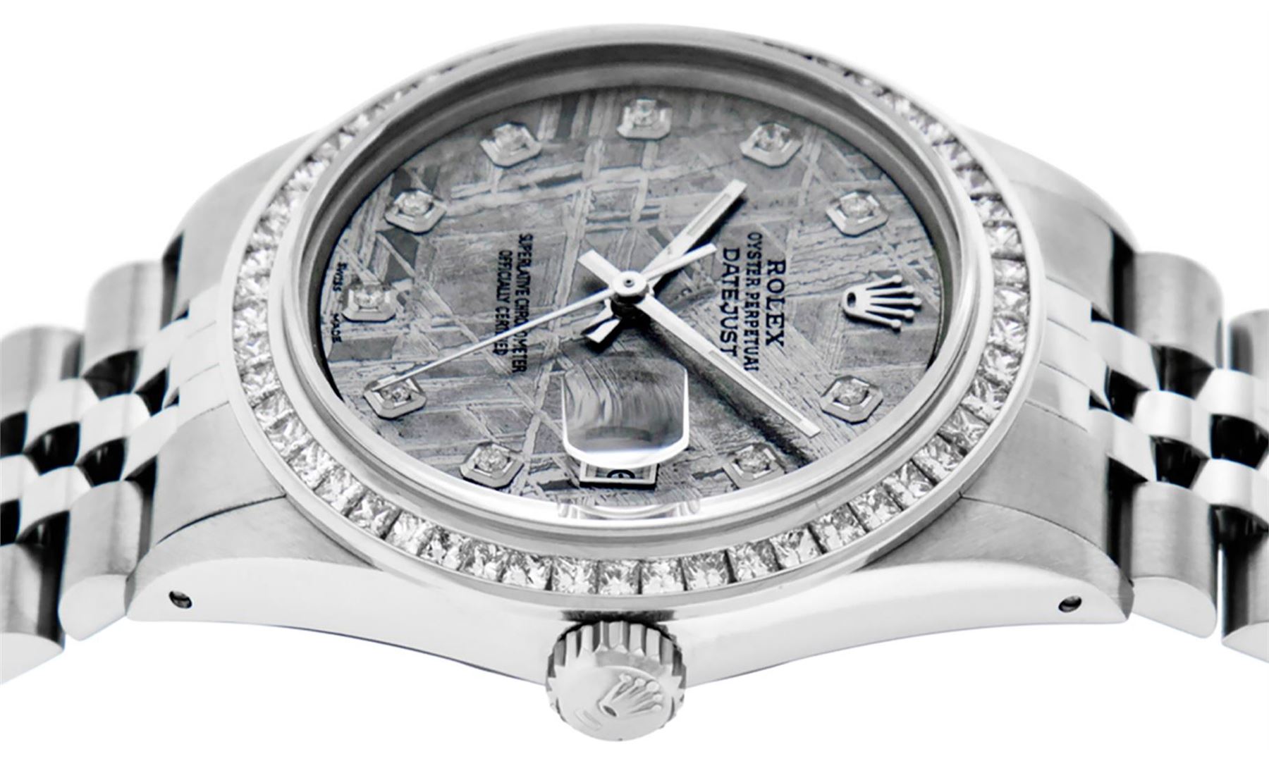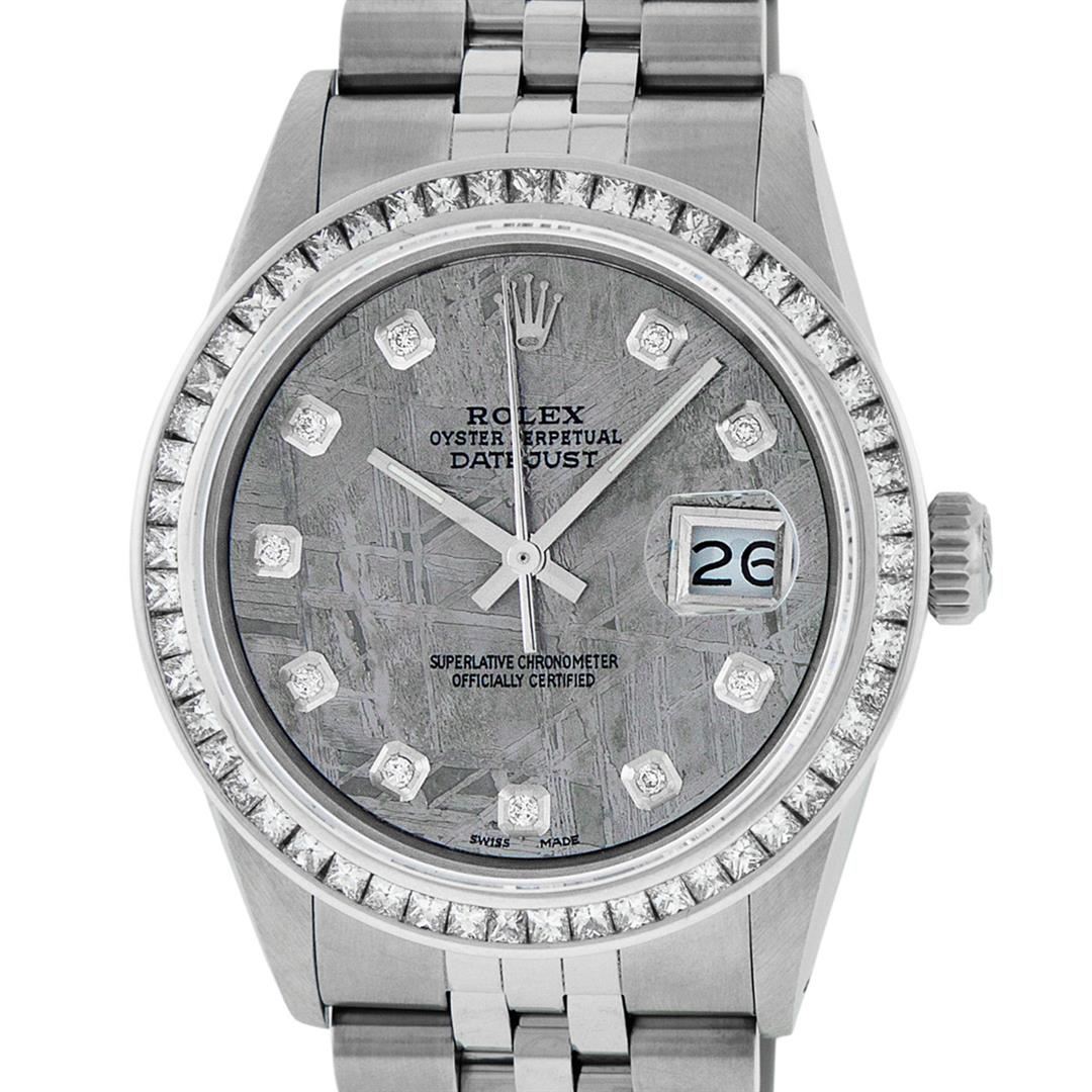 One Men's Stainless Steel Rolex Datejust Polished Bright with Satin Finish, Fully Serviced & Electronically Tested, Stainless Steel Case: 36mm, Stainless Steel Crown, Custom Bezel: New 14K White Gold 2.75 Carat Princess Cut Diamond Bezel, Diamond Count: 53 Diamonds, Total Weight 2.75 Carat, Clarity: SI-VS, Color: G to H. Custom Crystal: New Synthetic Sapphire Cyclops Lens. Custom Hands: New Luminescent Hands. Movement: Automatic Winding Movement Caliber 3035. Custom Dial: Meteorite Diamond Dial, 10 Diamonds in Dial, G To H In Color, Clarity: SI-VS. Date Window: 3 O'clock Position Date Display, Quickset, Model: Datejust 36mm, Condition: G-6 Extra Fine. Bracelet: Rolex Stainless Steel Jubilee Band. Bright Polish & Satin Finish. 7.0 Inch Length, Adjustable. Standard Clasp, With Rolex Logo. Watch Has Been Serviced And Polished It Is Free Of All Scratches And Dents.