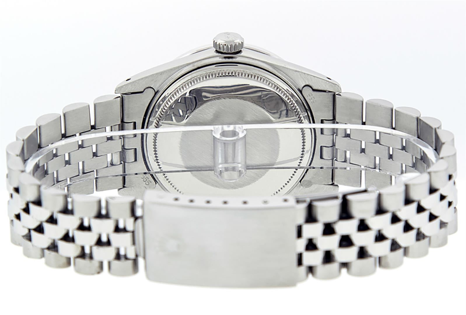 One Men's Stainless Steel Rolex Datejust Polished Bright with Satin Finish, This Watch Has Been Serviced & Electronically Tested, Stainless Steel Case: 36mm, Stainless Steel Crown, Bezel: 14K White Gold Fluted Bezel. Custom Crystal: New Acrylic Cyclops Lens. Custom Hands: New Luminescent Hands. Movement: Automatic Winding Movement Caliber 3035. Custom Dial: Ice Pink Diamond Dial With Diamond Hour Markers, Diamond Count: 10 Diamonds in Dial G To H In Color, SI-VS Clarity. Date Window: 3 O'clock Position Date Display, Quickset, Model: Datejust, Condition: G-6 Extra Fine. Bracelet: Stainless Steel Jubilee. Bright Polish & Satin Finish. 7.0 Inch Length, Adjustable. Standard Clasp, With Rolex Logo. This Watch Has Been Serviced Time Tested And Is In Excellent Condition It Is Free Of All Scratches And Dents