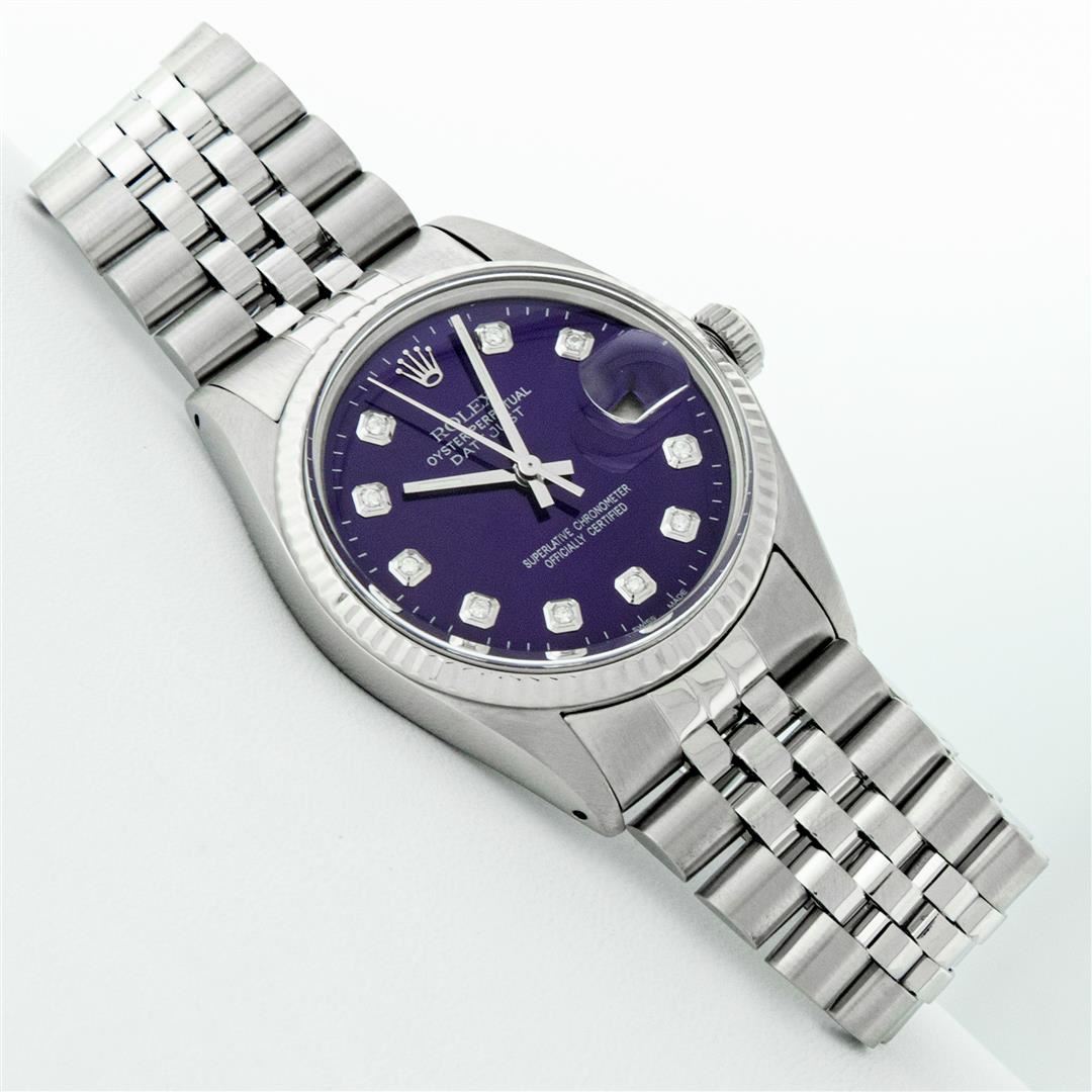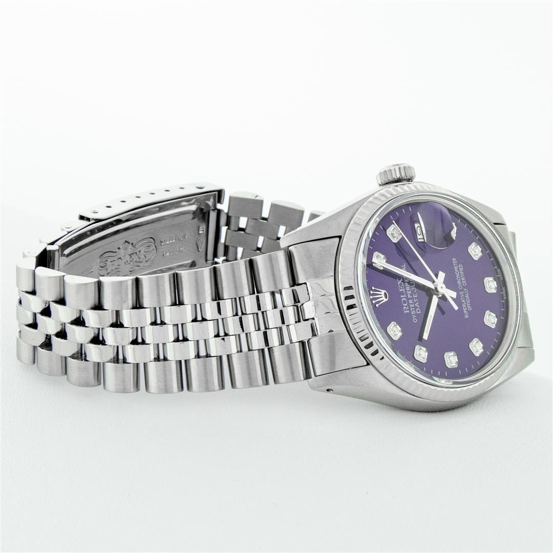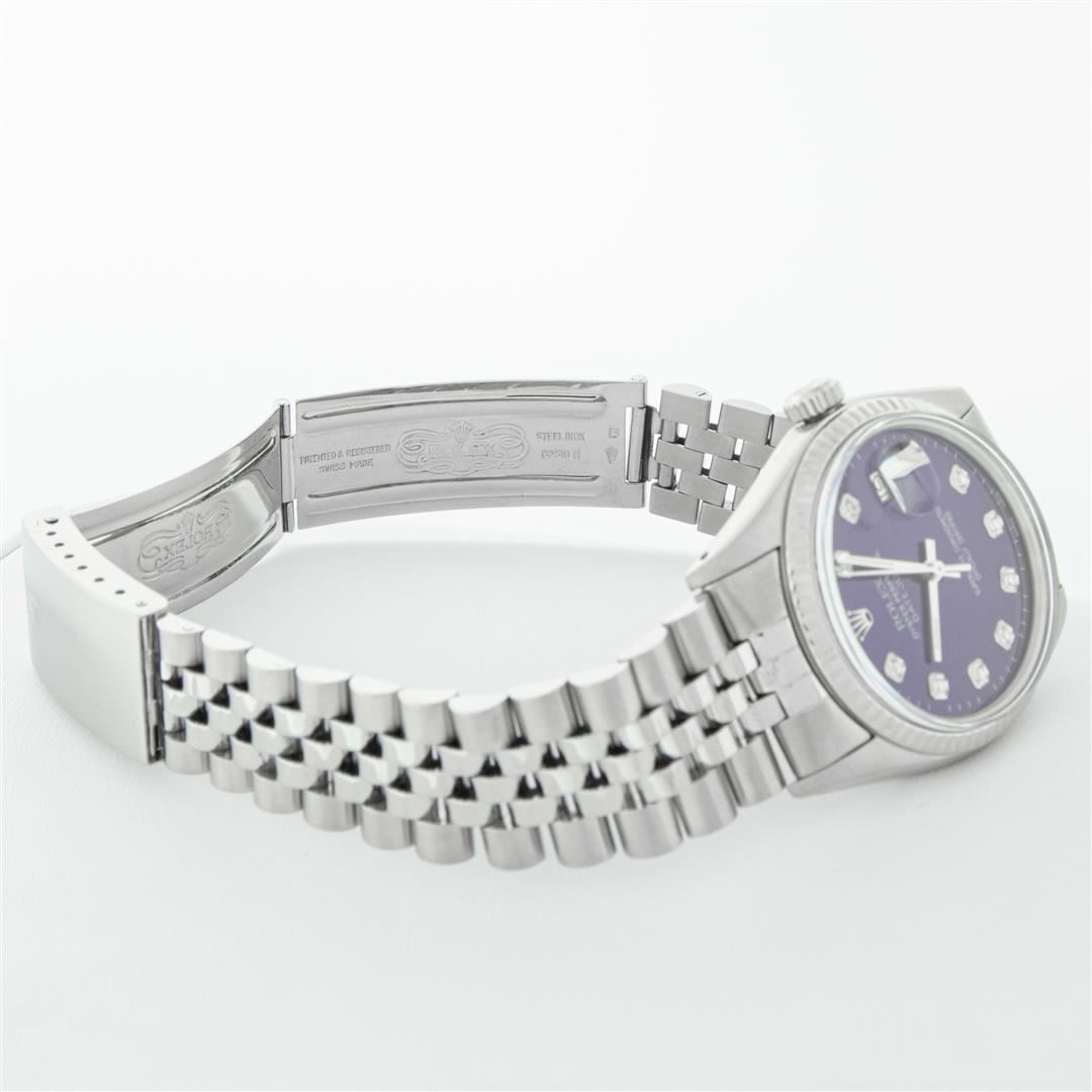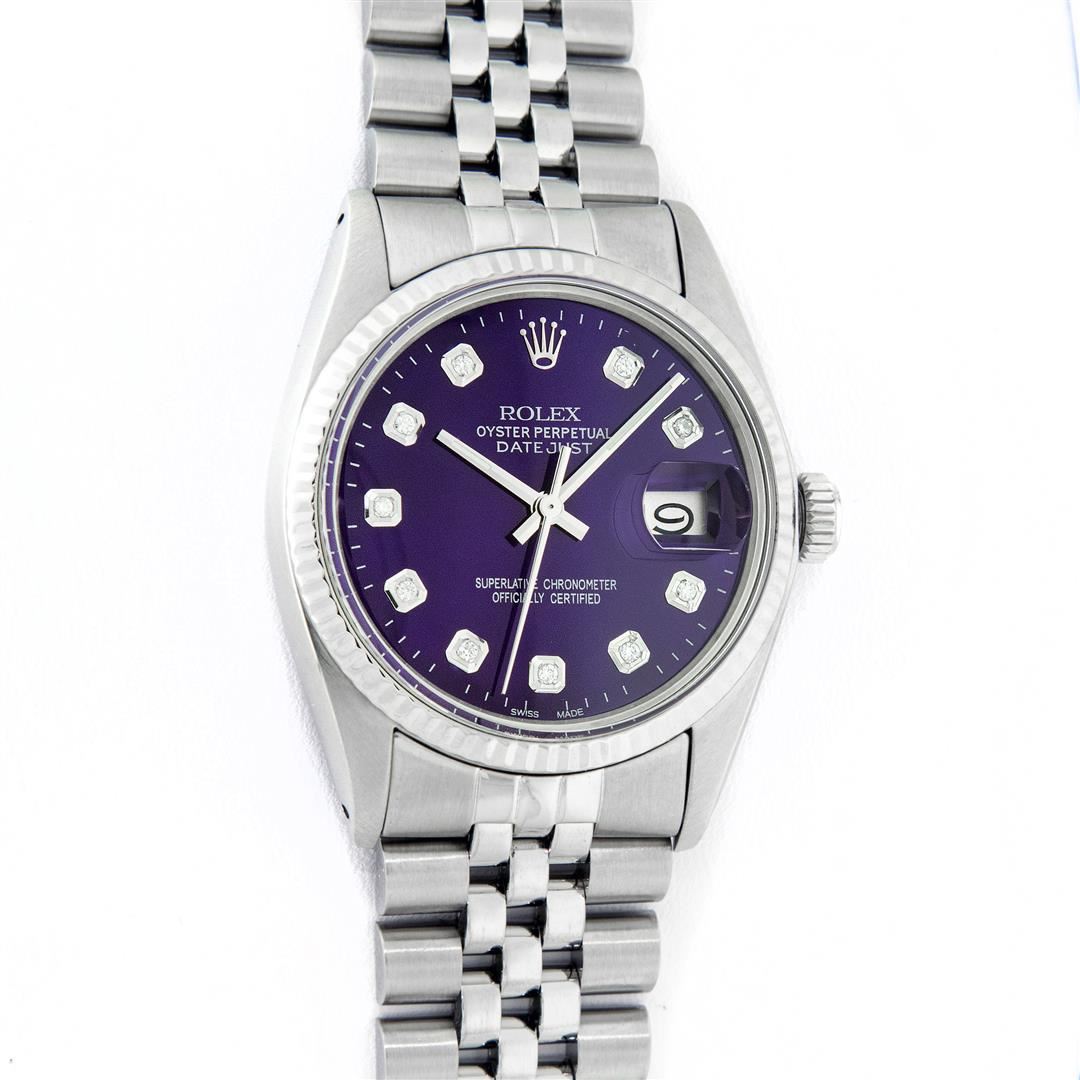 One Men's Stainless Steel Rolex Datejust Polished Bright with Satin Finish, This Watch Has Been Serviced & Electronically Tested, Stainless Steel Case: 36mm, Stainless Steel Crown, Bezel: White Gold Fluted Bezel. Custom Crystal: New Acrylic Cyclops Lens. Custom Hands: New Luminescent Hands. Movement: Automatic Winding Movement.. Custom Dial: Purple Diamond Dial With Diamond Hour Markers And Dash Track, Diamond Count: 10 Diamonds in Dial G To H In Color, SI-VS Clarity. Date Window: 3 O'clock Position Date Display, Quickset, Model: Datejust, Condition: G-6 Extra Fine. Bracelet: Stainless Steel Jubilee Band. Bright Polish & Satin Finish. 7.0 Inch Length, Adjustable. Standard Clasp, With Rolex Logo. This Watch Has Been Serviced Time Tested And Is In Excellent Condition It Is Free Of All Scratches And Dents