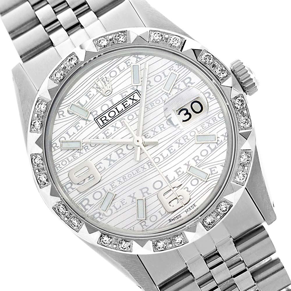 WATCH DETAILS: ITEM: WatchBRAND: RolexTYPE: Stainless SteelFEATURE: QuickSetMODEL: DateJustMADE: Swiss MadeGENDER: Men'sCONDITION: Pre-OwnedFUNCTION: DateDIAL COLOR: Silver JubilieeHOUR MARKERS: Arabic 6,9BEZEL TYPE: Pyrimid Custom Made Diamond Bezel BEZEL STONE: Diamond G-VVS1 BEZEL MATERIAL: 18K GoldBRACELET TYPE: Jubilee BRACELET MATERIAL: Stainless SteelCLASP TYPE: Folding ClaspCLASP MATERIAL: Stainless SteelCASE STONE: CASE SIZE: 36mmCRYSTAL: Scratch Resistance Sapphire CrystalMOVEMENT: Automatic (Self Winding)CALIBER: 3035CROWN TYPE: Screw Down CrownWATER RESISTANCE: Waterproof to 10 ATM/100 meters/330 feetMODEL #: 16014SKU #: AMSJQS34We Buy/Sell/Trade Valuable watches, Please call us