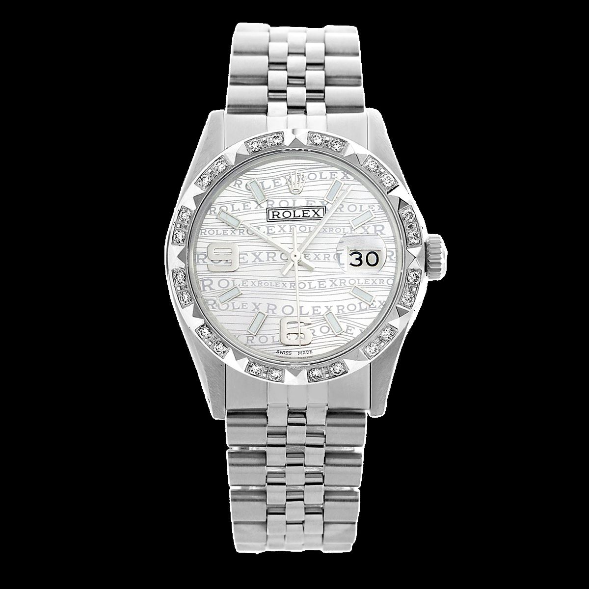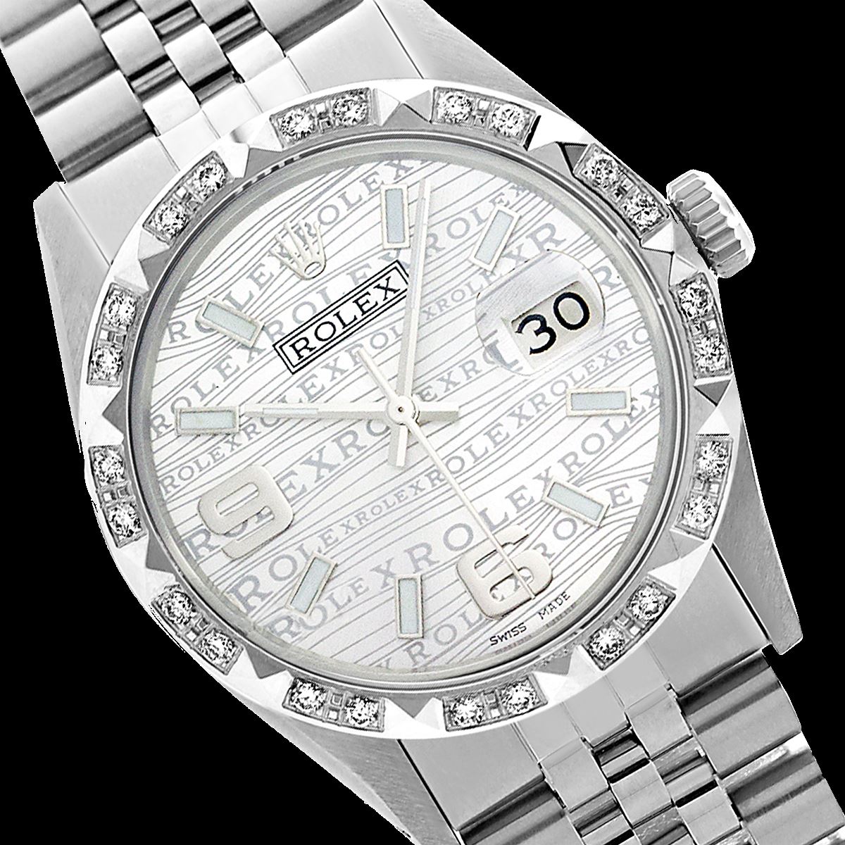 WATCH DETAILS: ITEM: WatchBRAND: RolexTYPE: Stainless SteelFEATURE: QuickSetMODEL: DateJustMADE: Swiss MadeGENDER: Men'sCONDITION: Pre-OwnedFUNCTION: DateDIAL COLOR: Silver JubilieeHOUR MARKERS: Arabic 6,9BEZEL TYPE: Pyrimid Custom Made Diamond Bezel BEZEL STONE: Diamond G-VVS1 BEZEL MATERIAL: 18K GoldBRACELET TYPE: Jubilee BRACELET MATERIAL: Stainless SteelCLASP TYPE: Folding ClaspCLASP MATERIAL: Stainless SteelCASE STONE: CASE SIZE: 36mmCRYSTAL: Scratch Resistance Sapphire CrystalMOVEMENT: Automatic (Self Winding)CALIBER: 3035CROWN TYPE: Screw Down CrownWATER RESISTANCE: Waterproof to 10 ATM/100 meters/330 feetMODEL #: 16014SKU #: AMSJQS34We Buy/Sell/Trade Valuable watches, Please call us